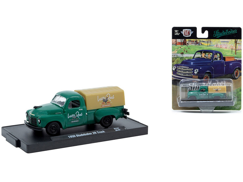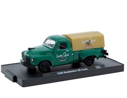 Kolekcjonerski model metalowy z elementami plastikowymi samochodu STUDEBAKER 2R Pickup Truck „Lucky Roost” z roku 1950 w kolorze Zielonym.Model zapakowany w blister.