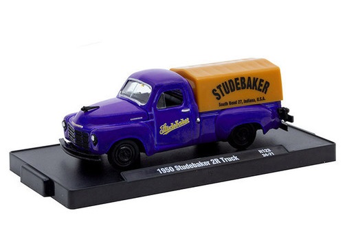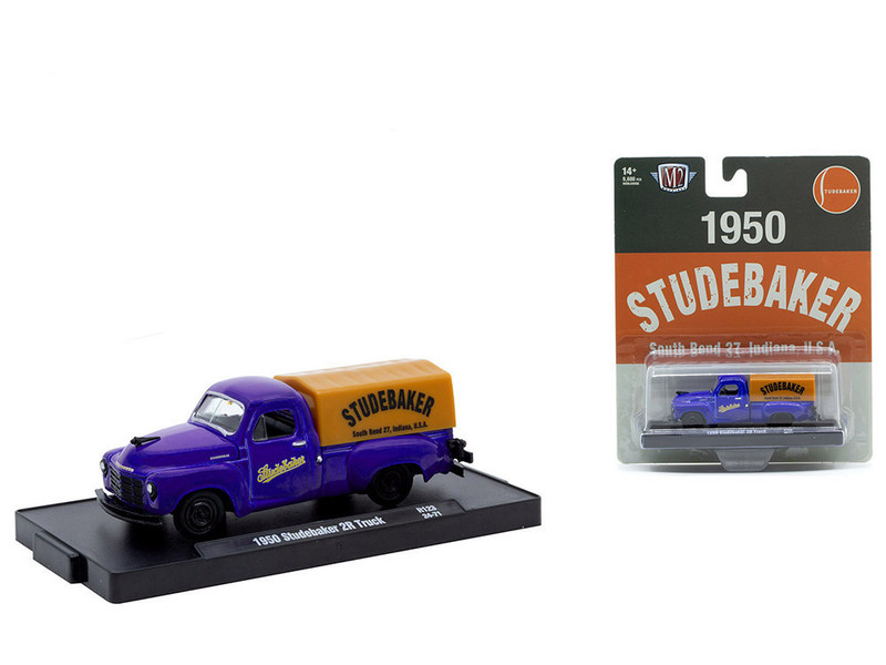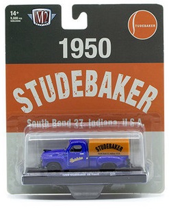 Kolekcjonerski model metalowy z elementami plastikowymi samochodu STUDEBAKER 2R Pickup Truck with Bed Camper z roku 1950 w kolorze Niebieskim.Model zapakowany w blister.