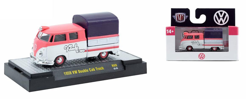 Kolekcjonerski model metalowy z elementami plastikowymi samochodu VOLKSWAGEN Double Cab Truck Vdub Love” z roku 1959 w kolorze Różowy/biały.Model na podstawce,posiada akrylową gablotkę ekspozycyjną.