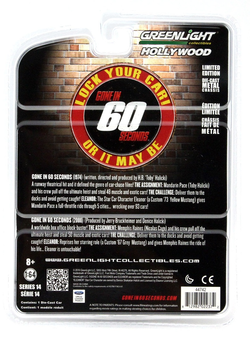 Kolekcjonerski model metalowy z elementami plastikowymi samochodu SHELBY GT500 MUSTANG ELEANOR z remake’u filmu GONE IN 60 SECONDS z roku 1974.Nowa wersja została wyprodukowana w roku 2000,główne role zagrali Nicolas Cage i Angelina Jolie.Model zapakowany w blister.