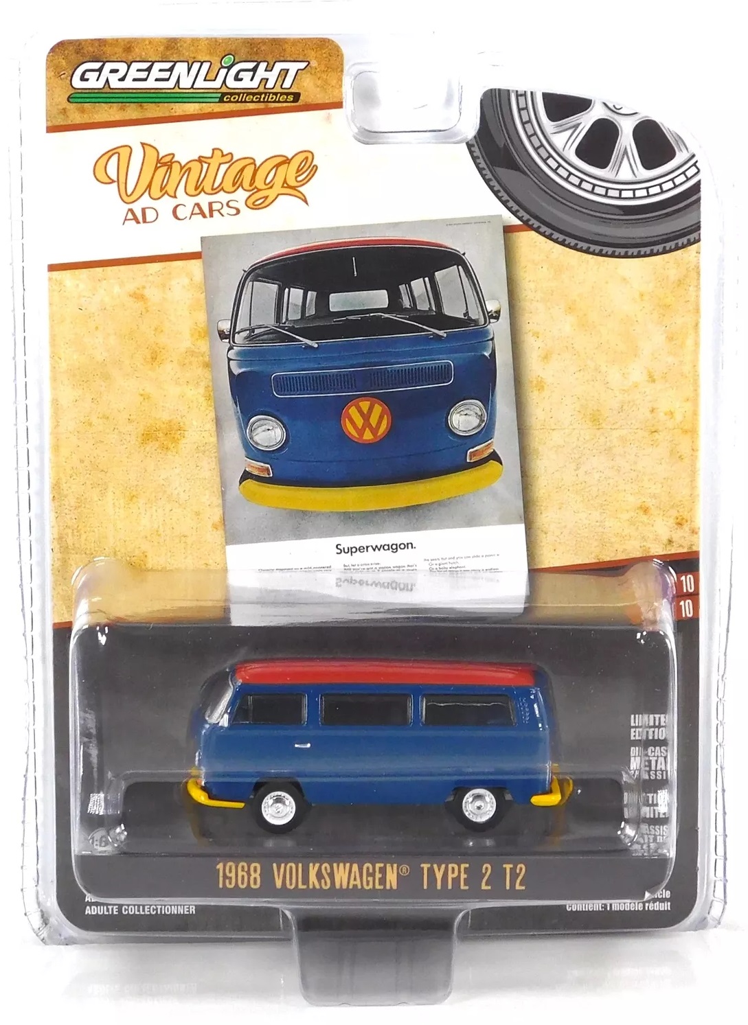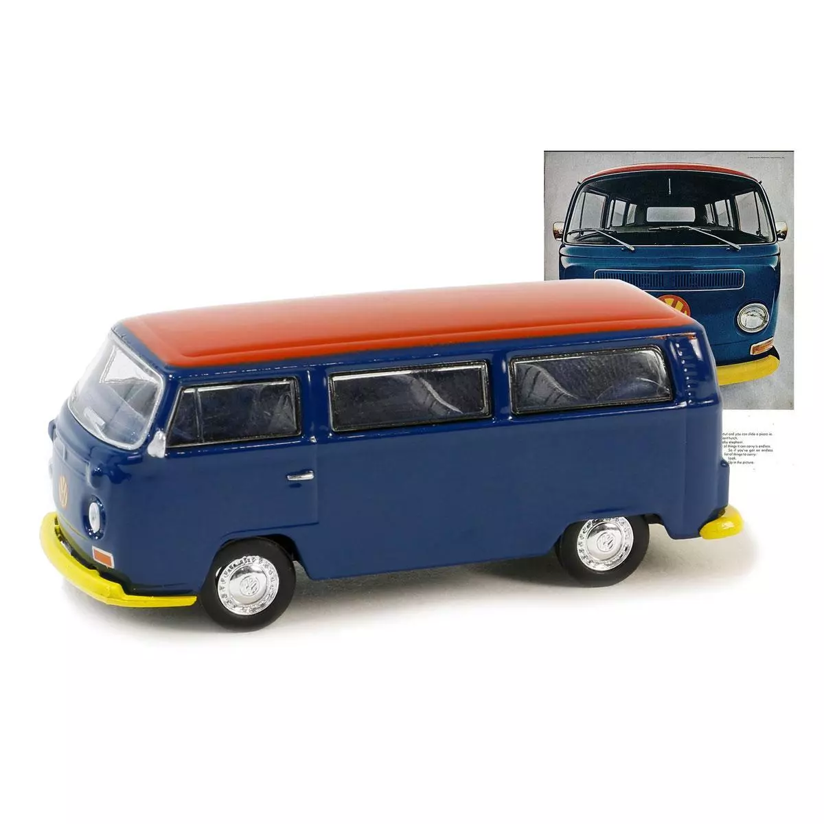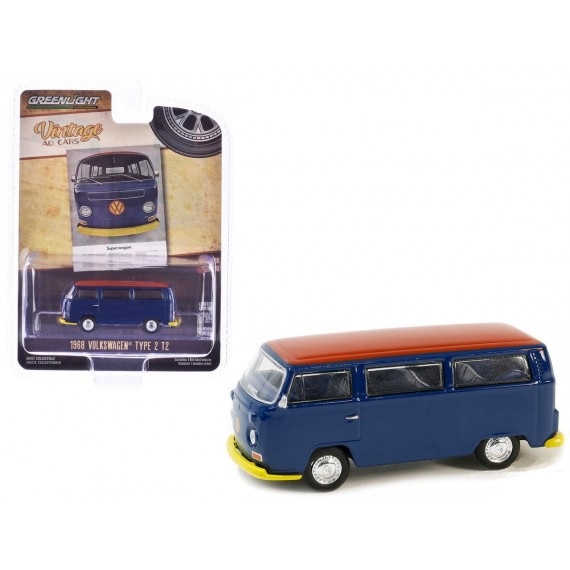Kolekcjonerski model metalowy z elementami plastikowymi samochodu VOLKSWAGEN Type 2 (T2) z roku 1968 w kolorze Niebieskim z czerwonym dachem.Model z serii Vintage Ad Cars,edycja 10