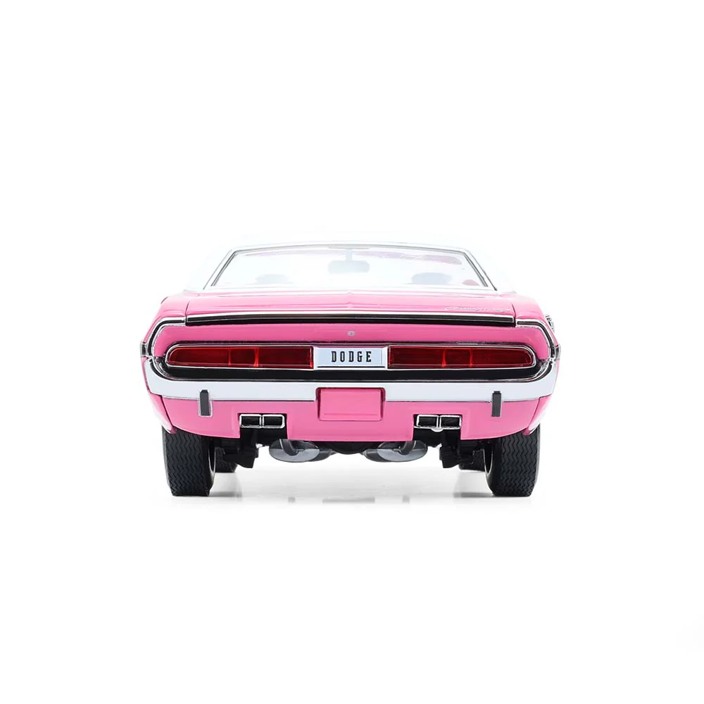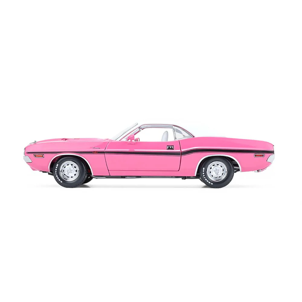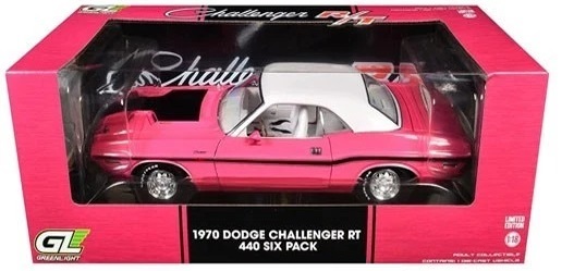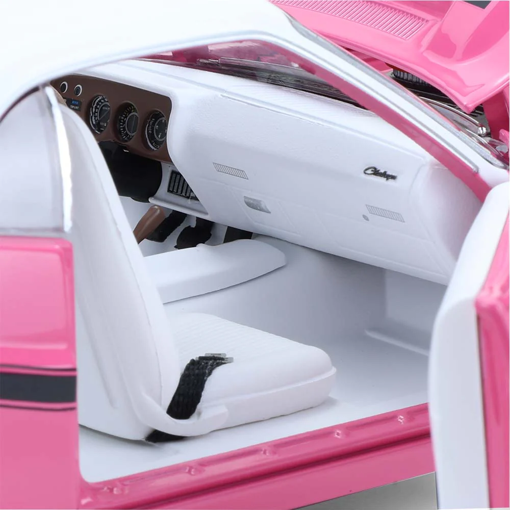 Kolekcjonerski model metalowy z elementami plastikowymi samochodu DODGE CHALLENGER R/T HARDTOP 440 6-Pack z roku 1970 w kolorze różowym z białym dachem.Model ma otwierane drzwi,pokrywę silnika i bagażnika.