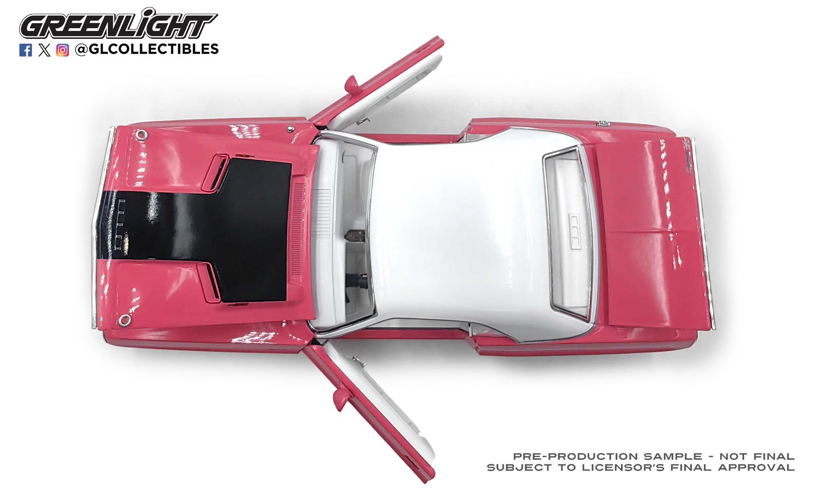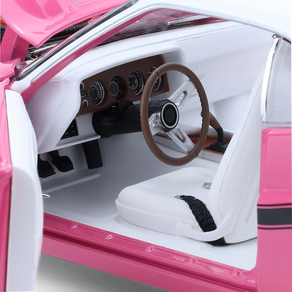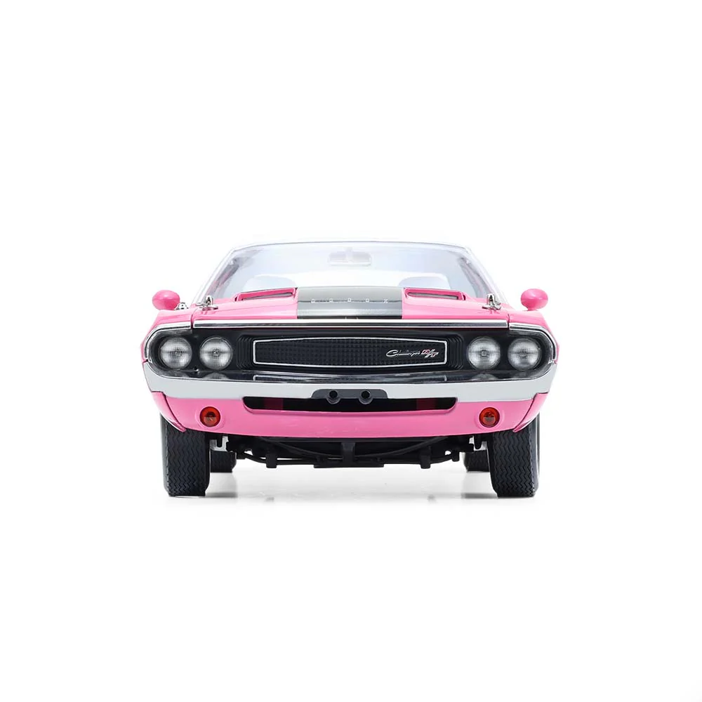 Kolekcjonerski model metalowy z elementami plastikowymi samochodu DODGE CHALLENGER R/T HARDTOP 440 6-Pack z roku 1970 w kolorze różowym z białym dachem.Model ma otwierane drzwi,pokrywę silnika i bagażnika.