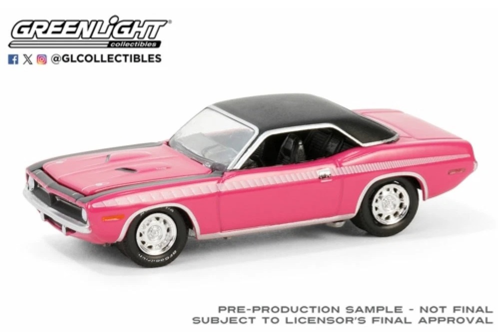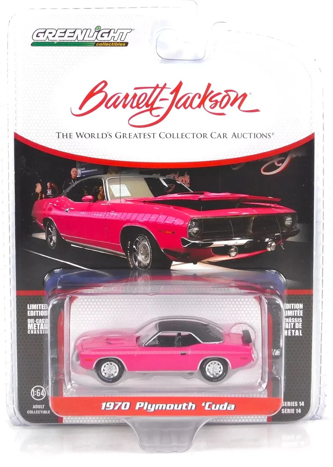 Kolekcjonerski model metalowy z elementami plastikowymi samochodu PLYMOUYH CUDA z roku 1970 w kolorze różowym.Model z serii Barrett Jackson Las Vegas Edition,Edycja 14.