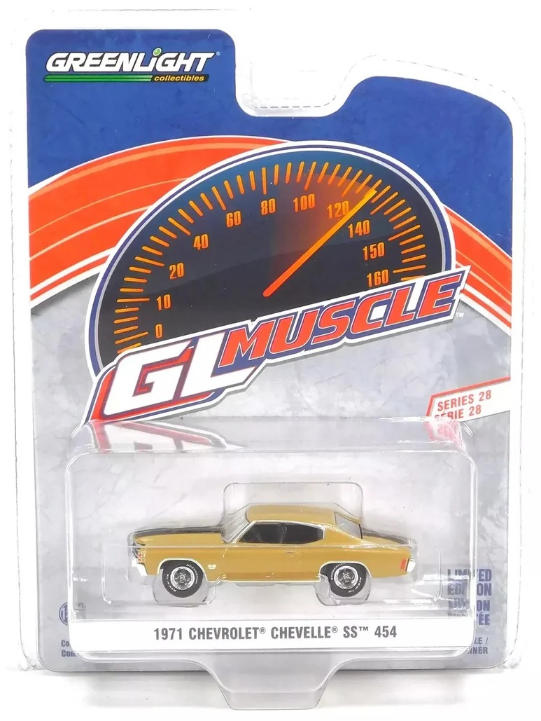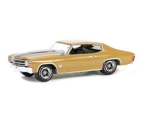 Kolekcjonerski model metalowy z elementami plastikowymi samochodu  CHEVROLET CHEVELLE SS 454 z roku 1971 w kolorze Placer Gold.Model zapakowany w blister.Model z serii Muscle Series,Edycja 28