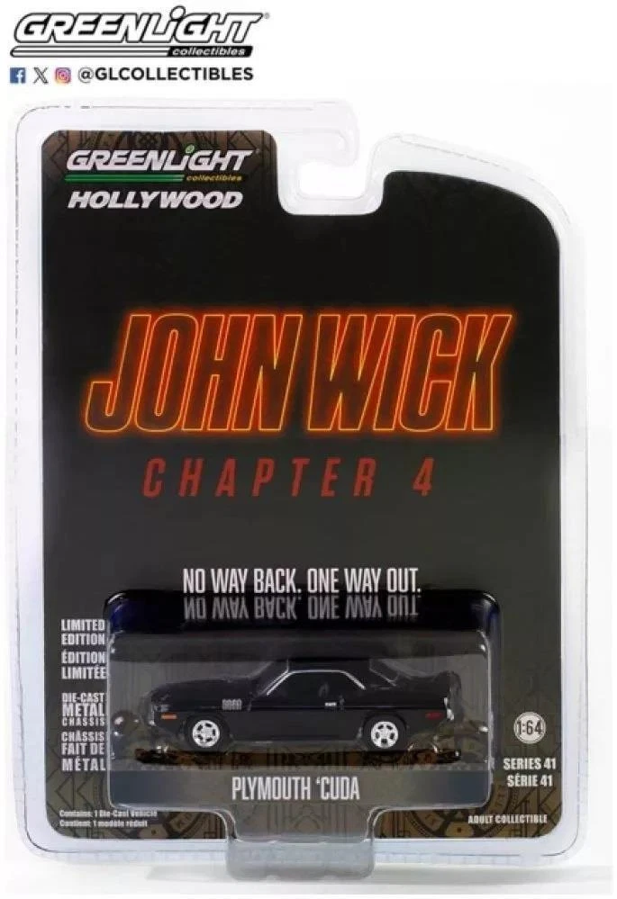 Kolekcjonerski model metalowy z elementami plastikowymi samochodu PLYMOUTH CUDA z roku 1971 z filmu John Wick Chapter 4 (2023).