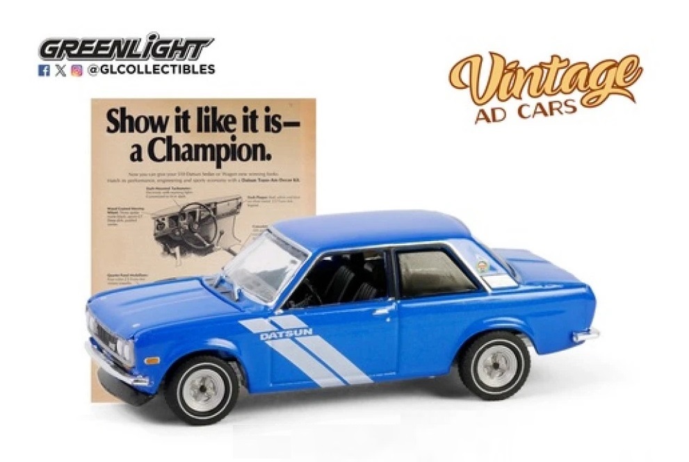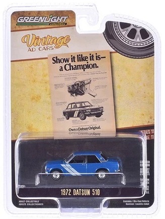 Kolekcjonerski model metalowy z elementami plastikowymi samochodu DATSUN 510 – “Show it like it is – a Champion” z roku 1972 w kolorze Niebieskim.Model z serii Vintage Ad Cars – Edycja 11.