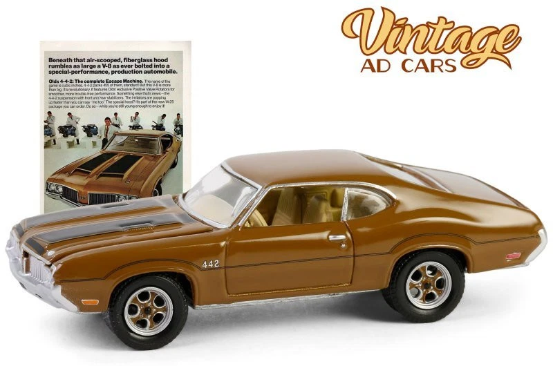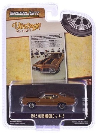 Kolekcjonerski model metalowy z elementami plastikowymi samochodu OLDSMOBILE 4-4-2 – “The Complete Escape Machine” z roku 1972 w kolorze Brązowym.Model z serii Vintage Ad Cars – Edycja 11.