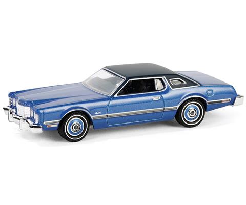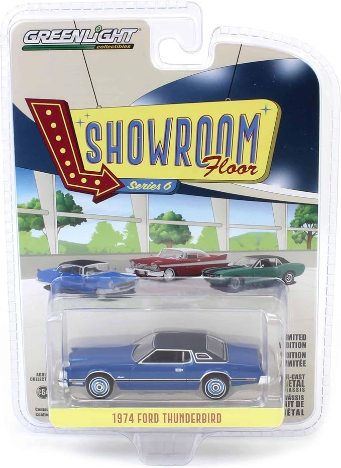 Kolekcjonerski model metalowy z elementami plastikowymi samochodu FORD THNDERBIRD z roku 1974 w kolorze Blue Starfire.Model z serii Showroom Floor,Edycja 6.Model zapakowany w blister.