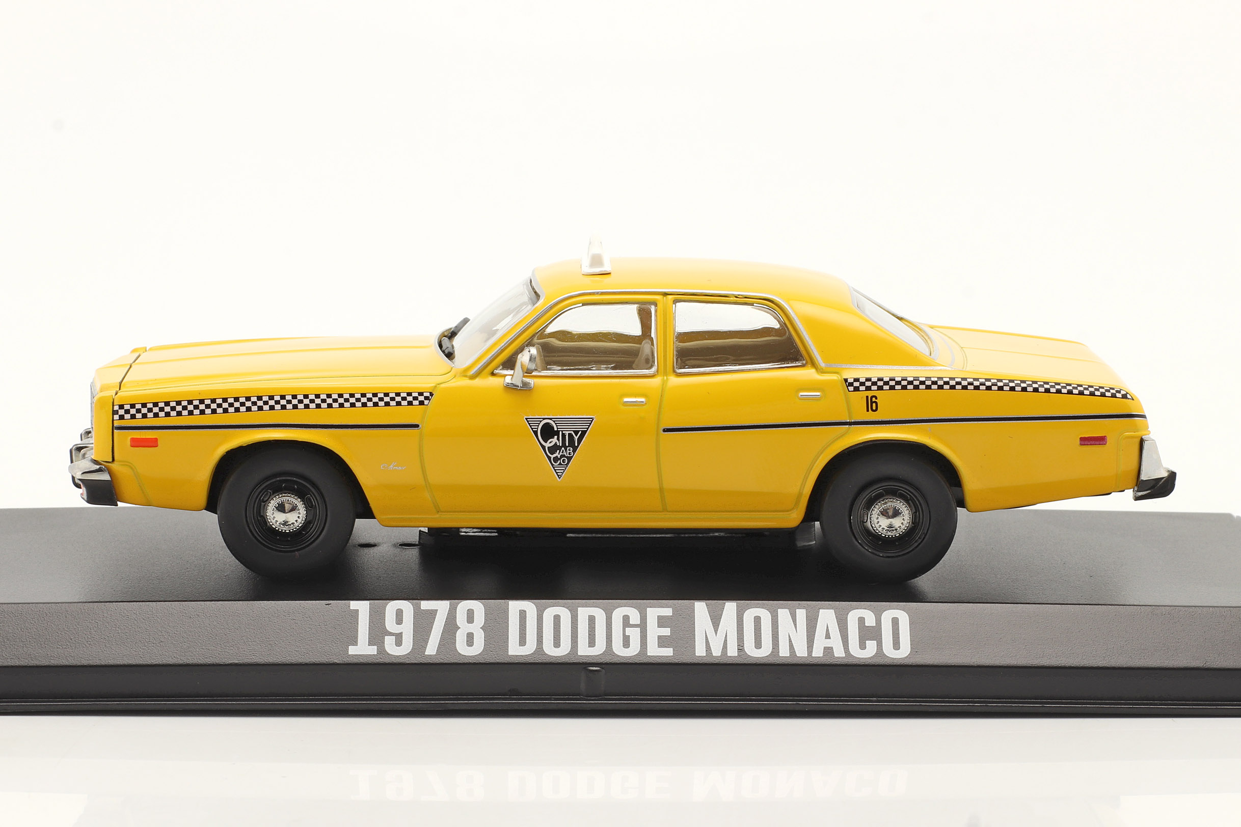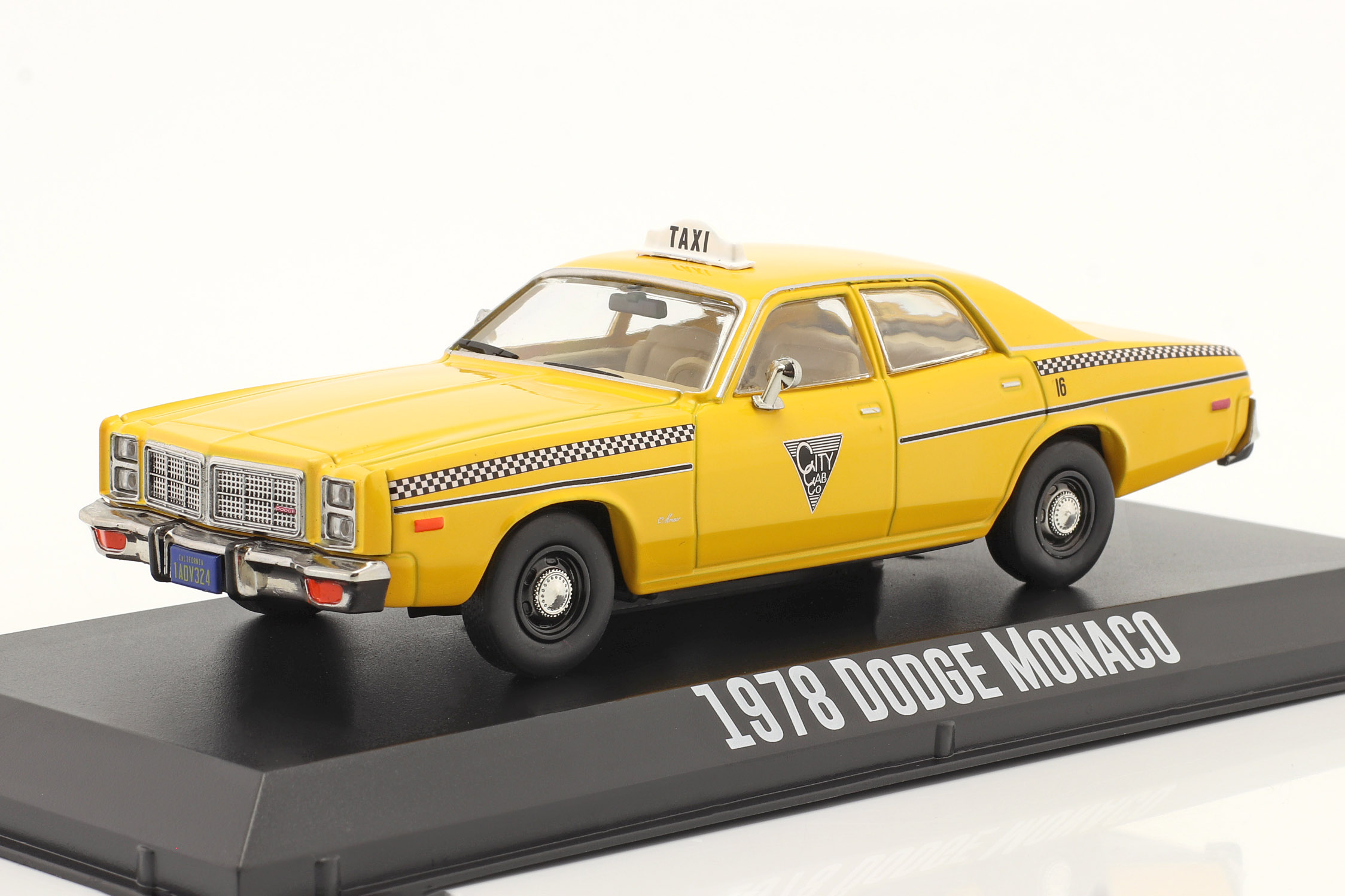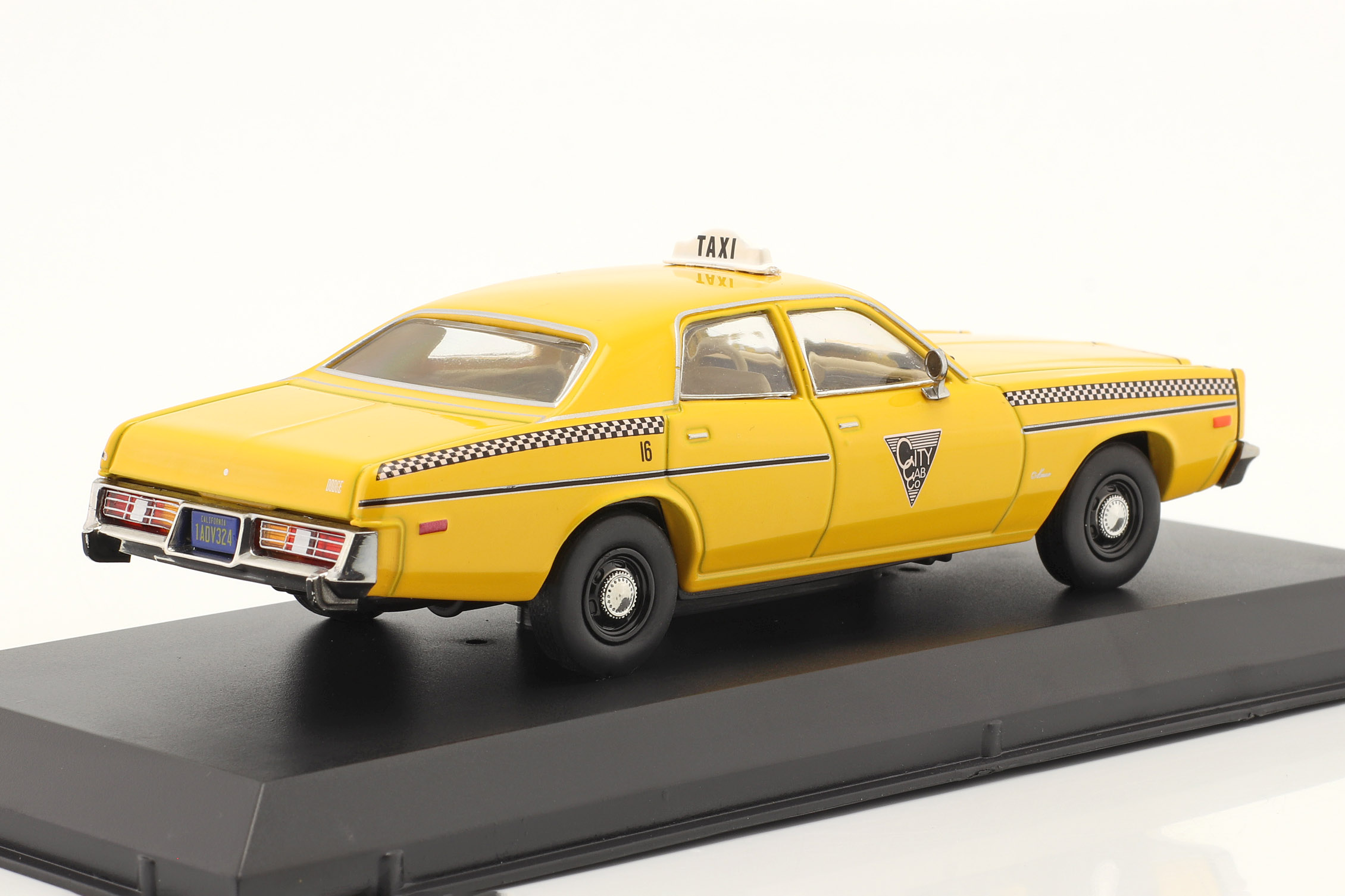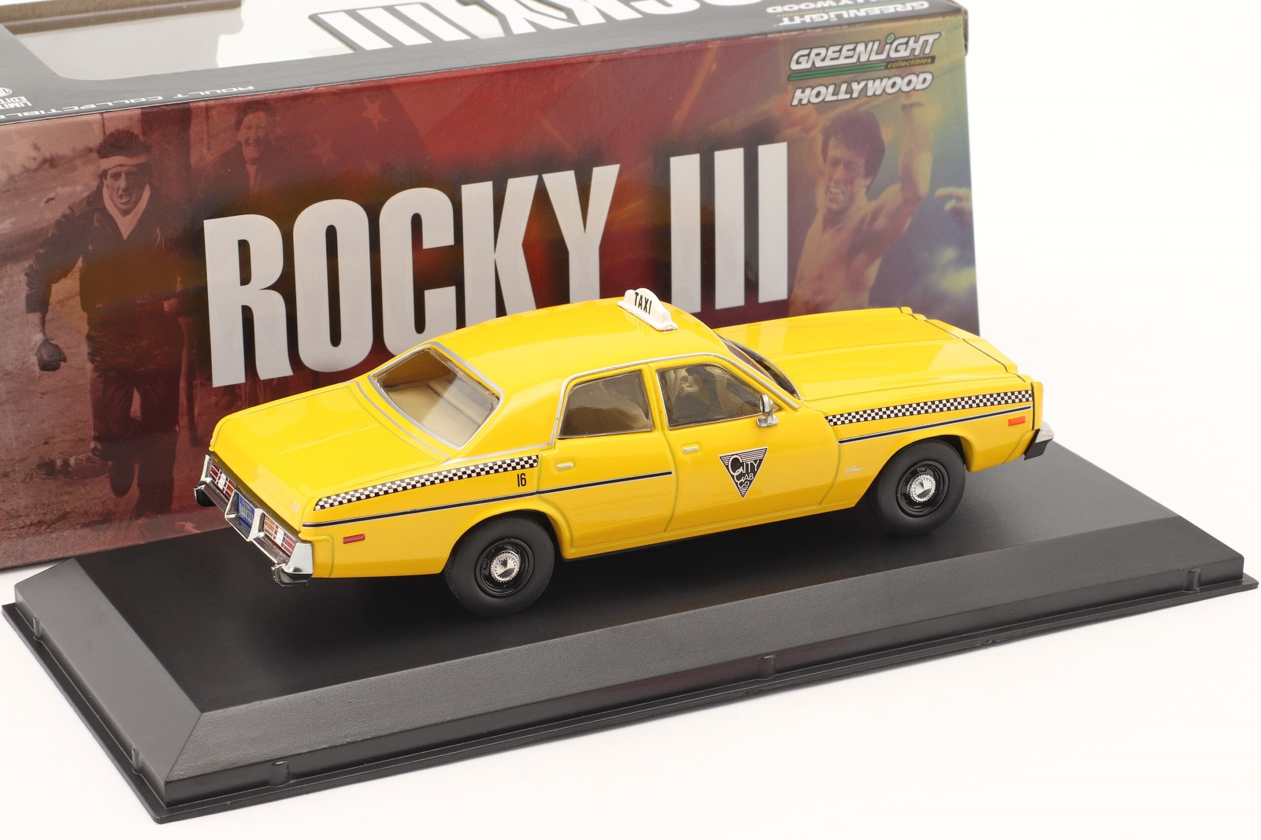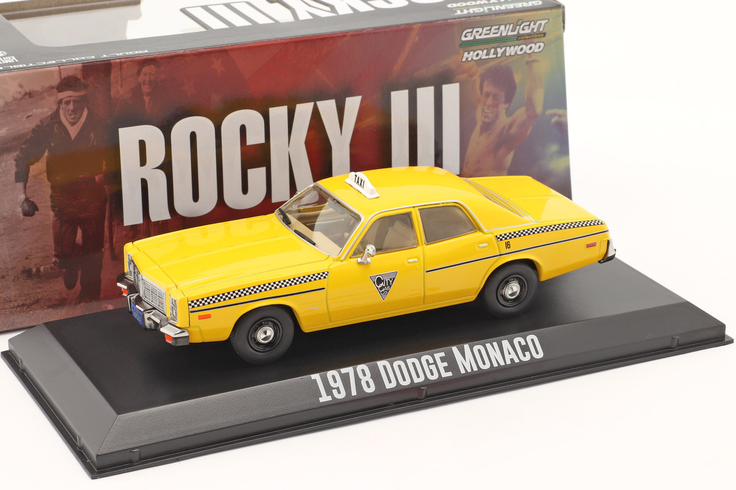 Kolekcjonerski model metalowy z elementami plastikowymi samochodu DODGE MONACO City Cab Co TAXI z roku 1978 z filmu „ROCKY III” z roku 1982.