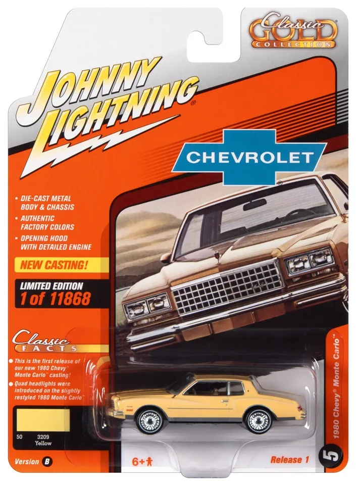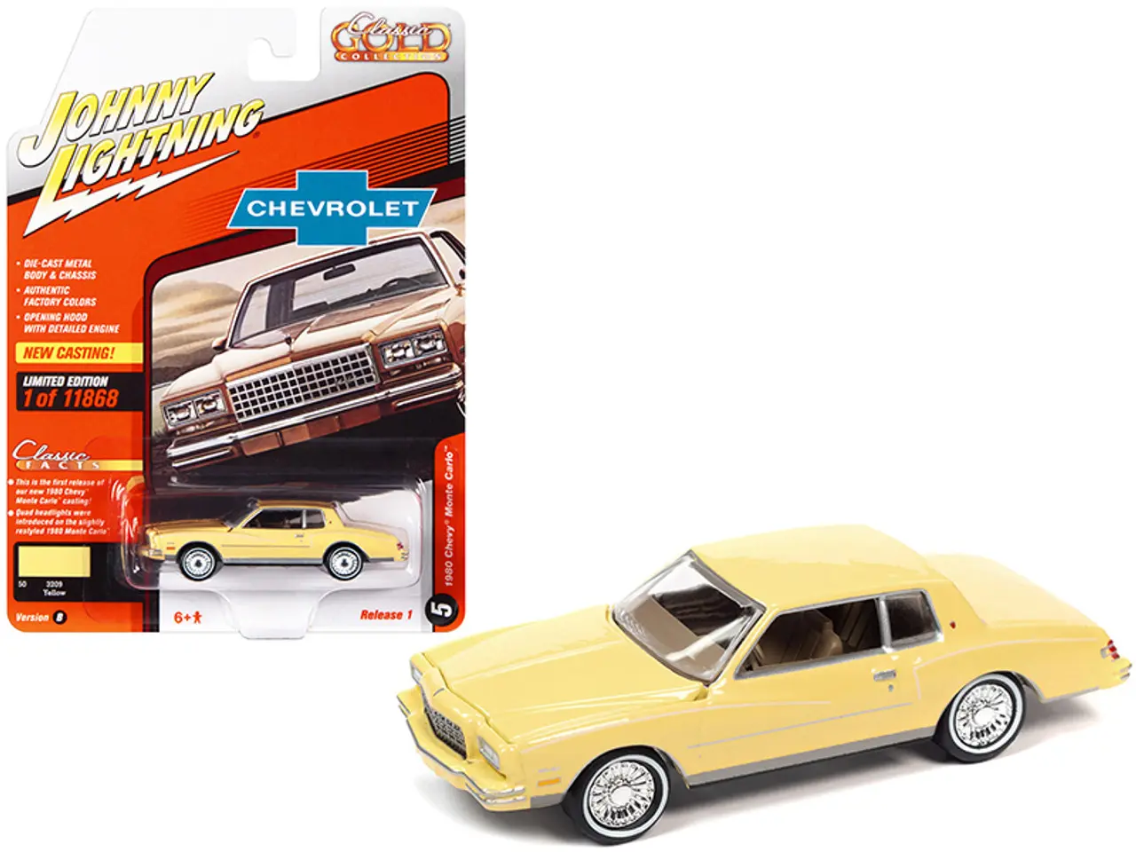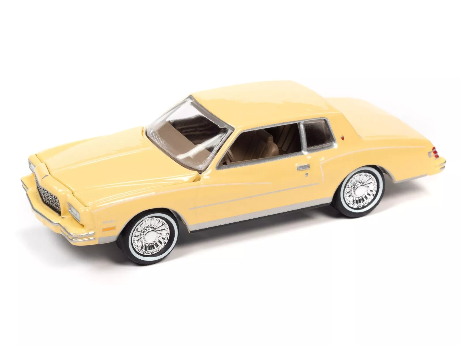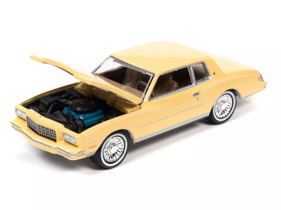 Kolekcjonerski model metalowy z elementami plastikowymi samochodu CHEVROLET MONTE CARLO z roku 1980 w kolorze Jasnożółtym.