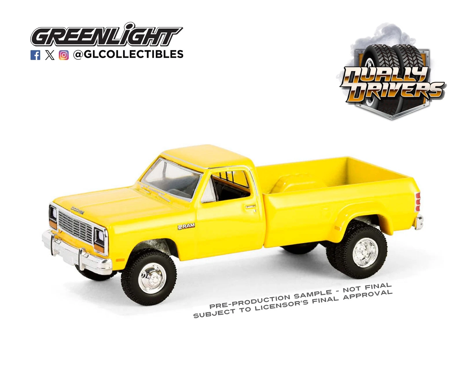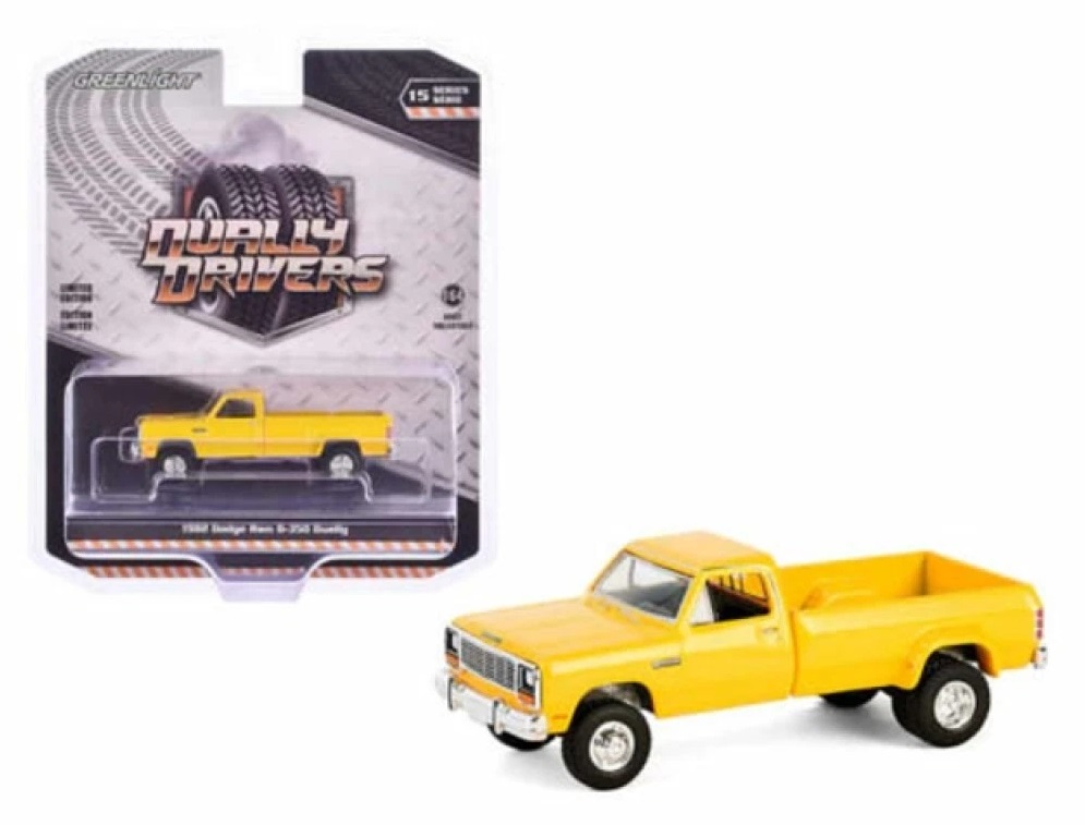 Kolekcjonerski model metalowy z elementami plastikowymi samochodu DODGE RAM D350 Dually in Construction z roku 1982 w kolorze żółtym.Model z serii Dually Drivers – Edycja 15.