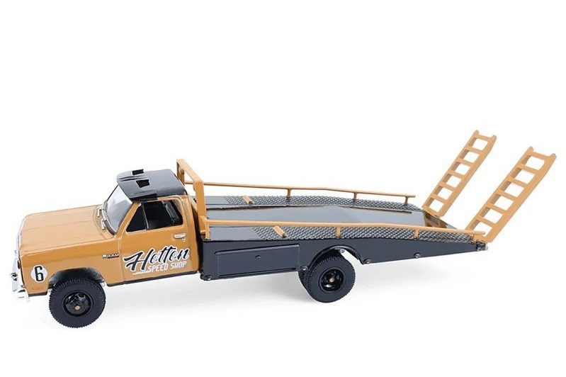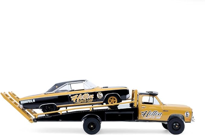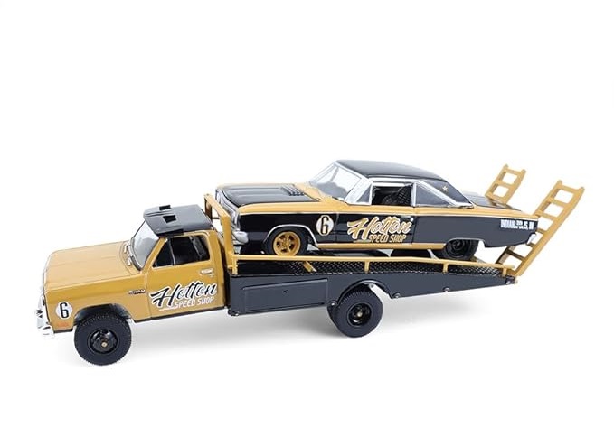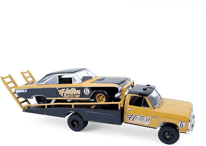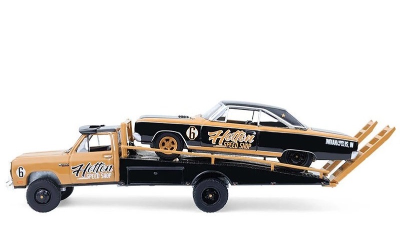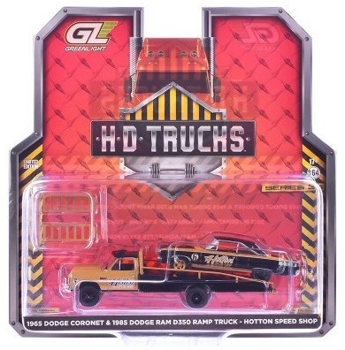 Kolekcjonerski zestaw modeli metalowych z elementami plastikowymi samochodu wyścigowego DODGE CORONET z roku 1965 przewożonego na samochodzie DODGE RAM D350 Ramp Truck z roku 1985.Model z serii H.D. Truck Series,Edycja 26.