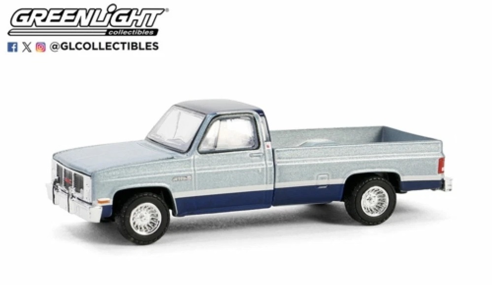 Kolekcjonerski model metalowy z elementami plastikowymi samochodu GMC SIERRA Classic K2500 z roku 1985 w kolorze Srebrny/niebieski.Model z serii Down on the Farm – Edycja 9.