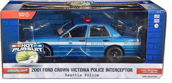 Kolekcjonerski model metalowy z elementami plastikowymi samochodu FORD CROWN VICTORIA Police Interceptor z roku 2001 w malowaniu Seattle Police,Washington.Model z serii HOT PURSUIT zapakowany w kartonowe pudełko z witrynką.
