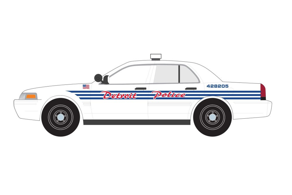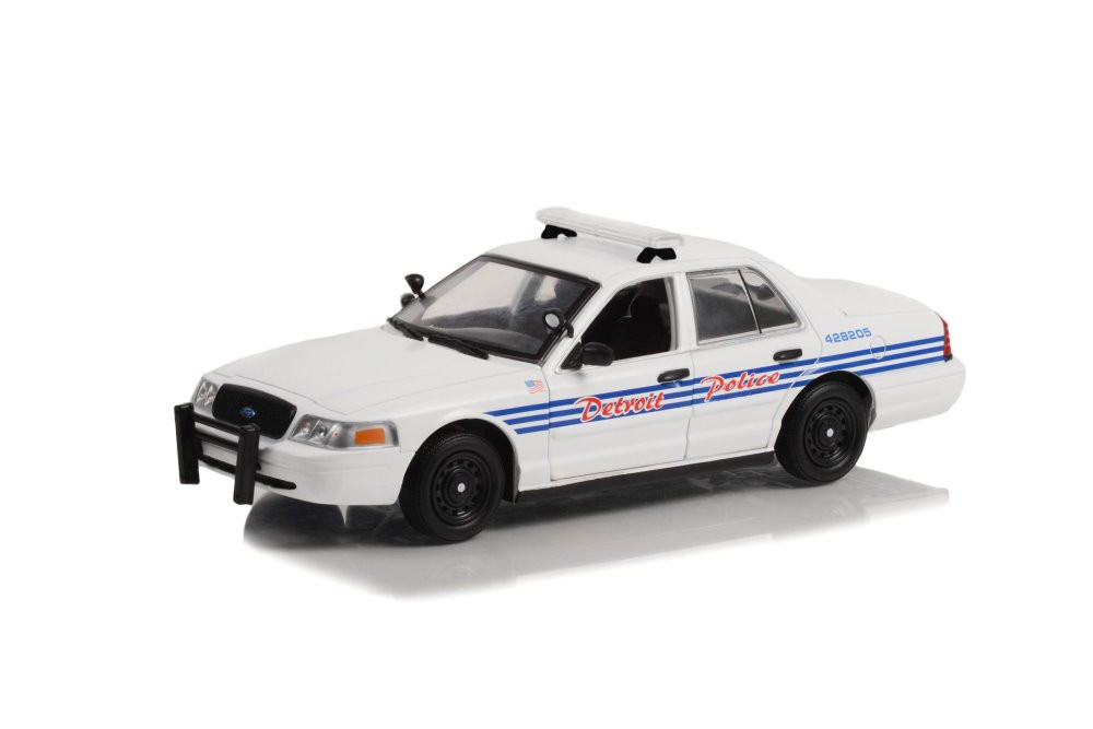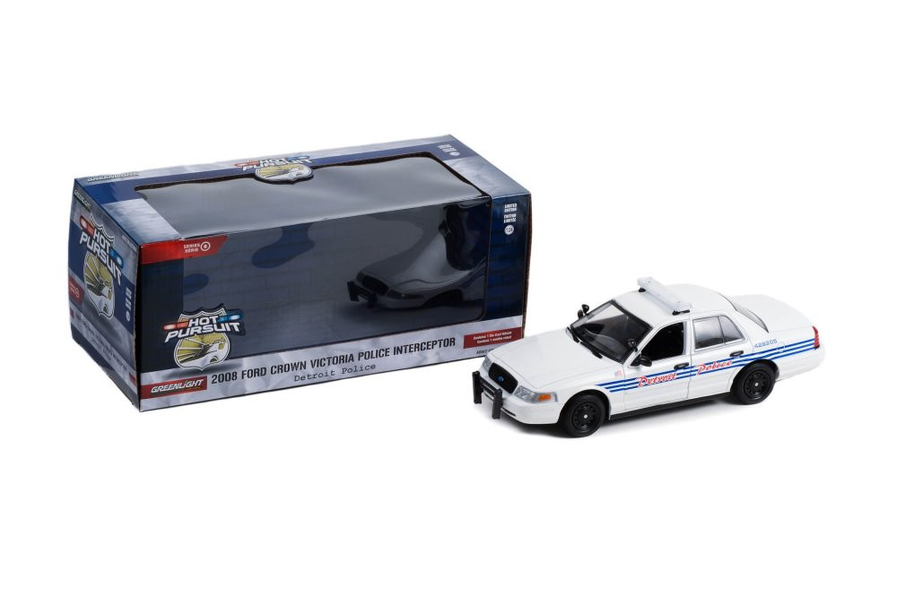 Kolekcjonerski model metalowy z elementami plastikowymi samochodu FORD CROWN VICTORIA Police Interceptor z roku 2008 w malowaniu Detroit Police,Michigan.Model z serii HOT PURSUIT zapakowany w kartonowe pudełko z witrynką.