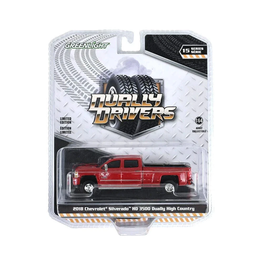 Kolekcjonerski model metalowy z elementami plastikowymi samochodu CHEVROLET SILVERADO 3500 HD Dually High Country z roku 2018 w kolorze Cajun Red metallic.Model z serii Dually Drivers – Edycja 15.