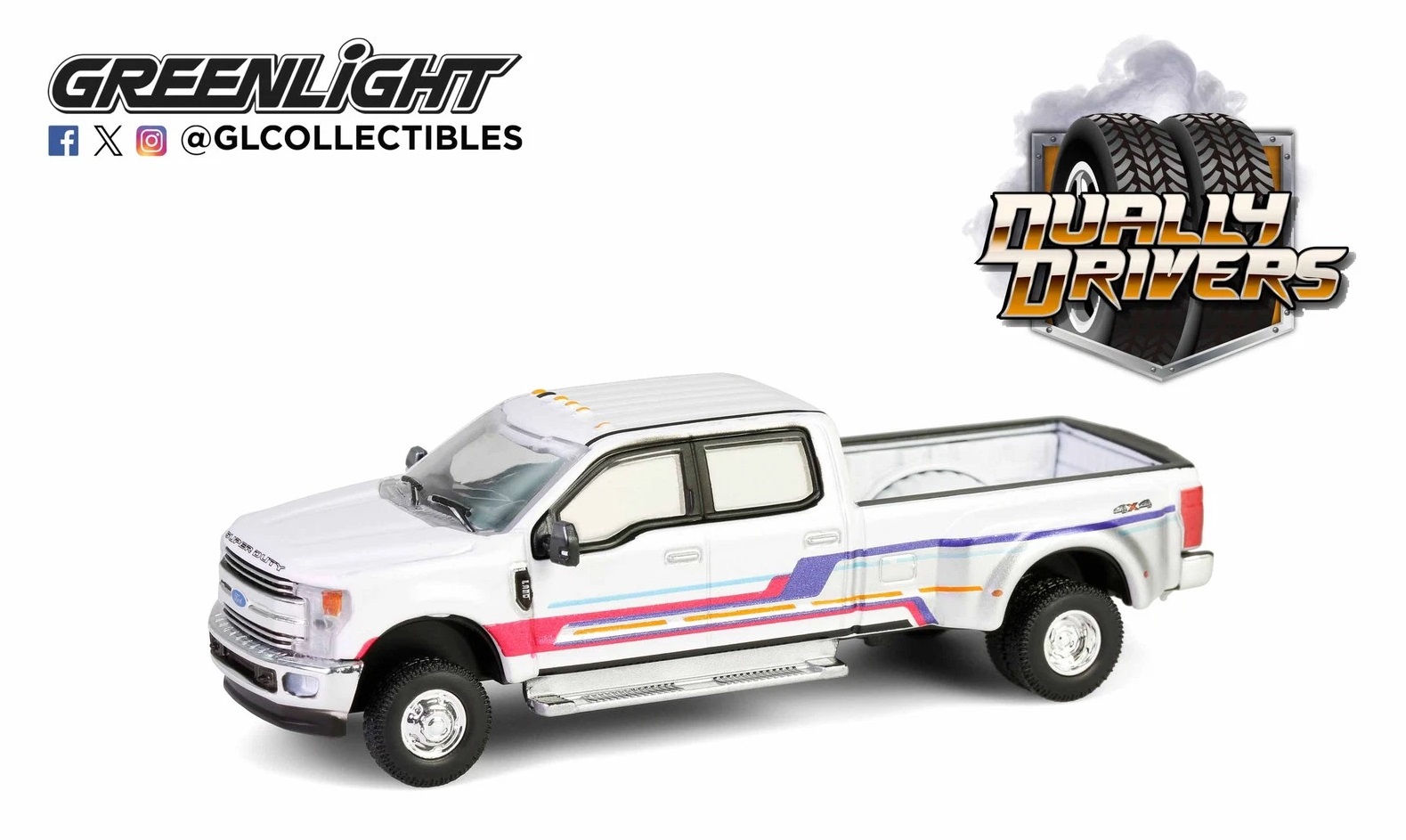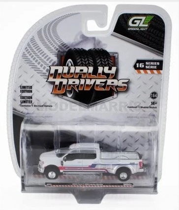 Kolekcjonerski model metalowy z elementami plastikowymi samochodu FORD F-350 Lariat Dually Pickup Truck z roku 2019 w kolorze Białym z pasami.Model z serii Dually Drivers – Edycja 16.