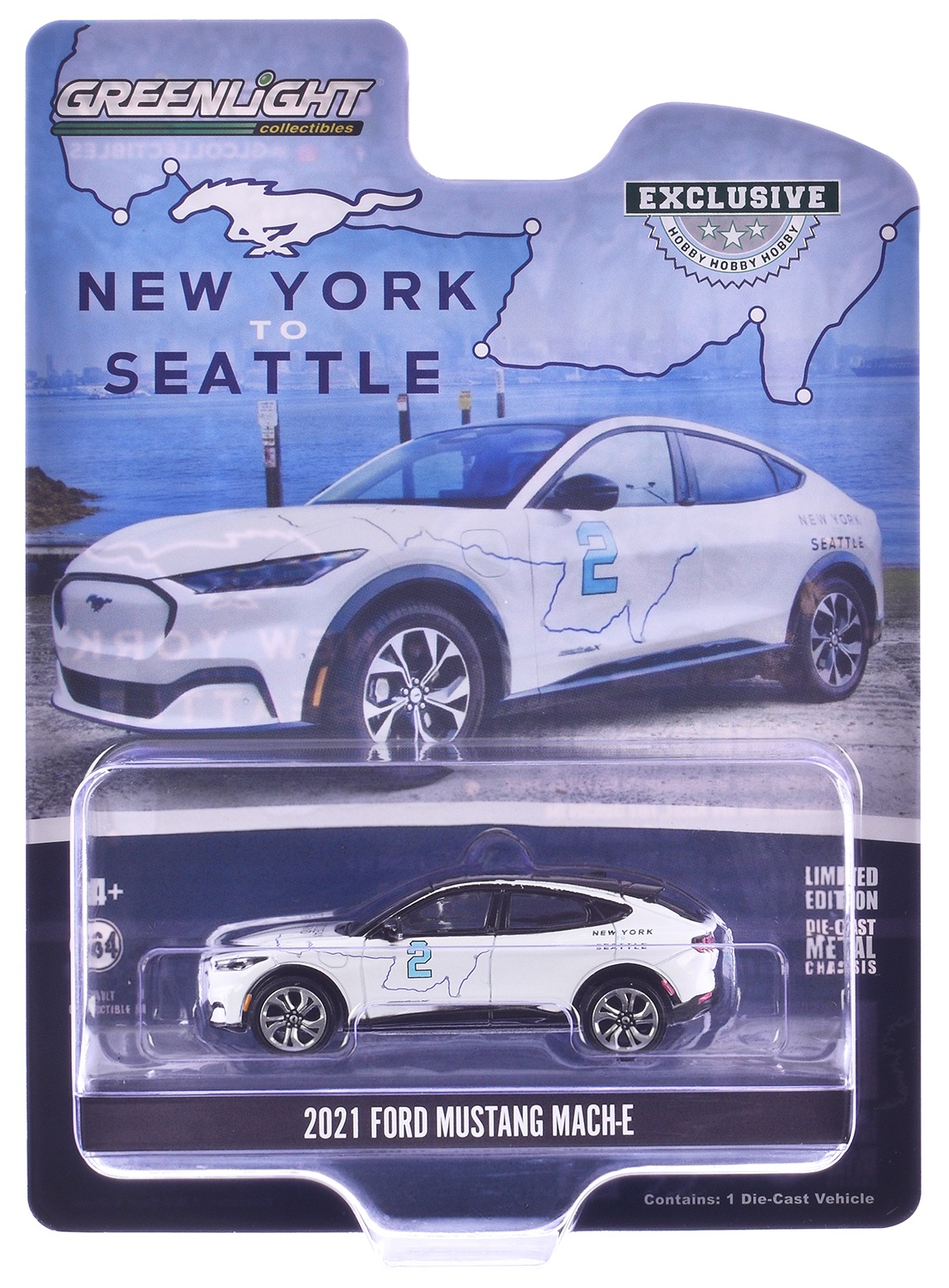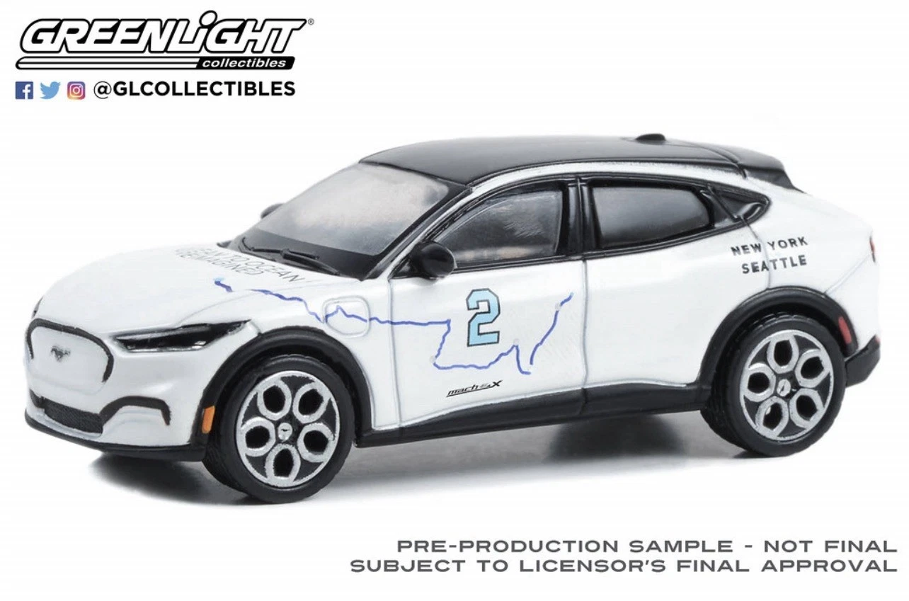 Kolekcjonerski model metalowy z elementami plastikowymi samochodu FORD MUSTANG Mach-E #2 “New York to Seattle Transcontinental Tour” z roku 2021.Model z serii Hobby Exclisive.