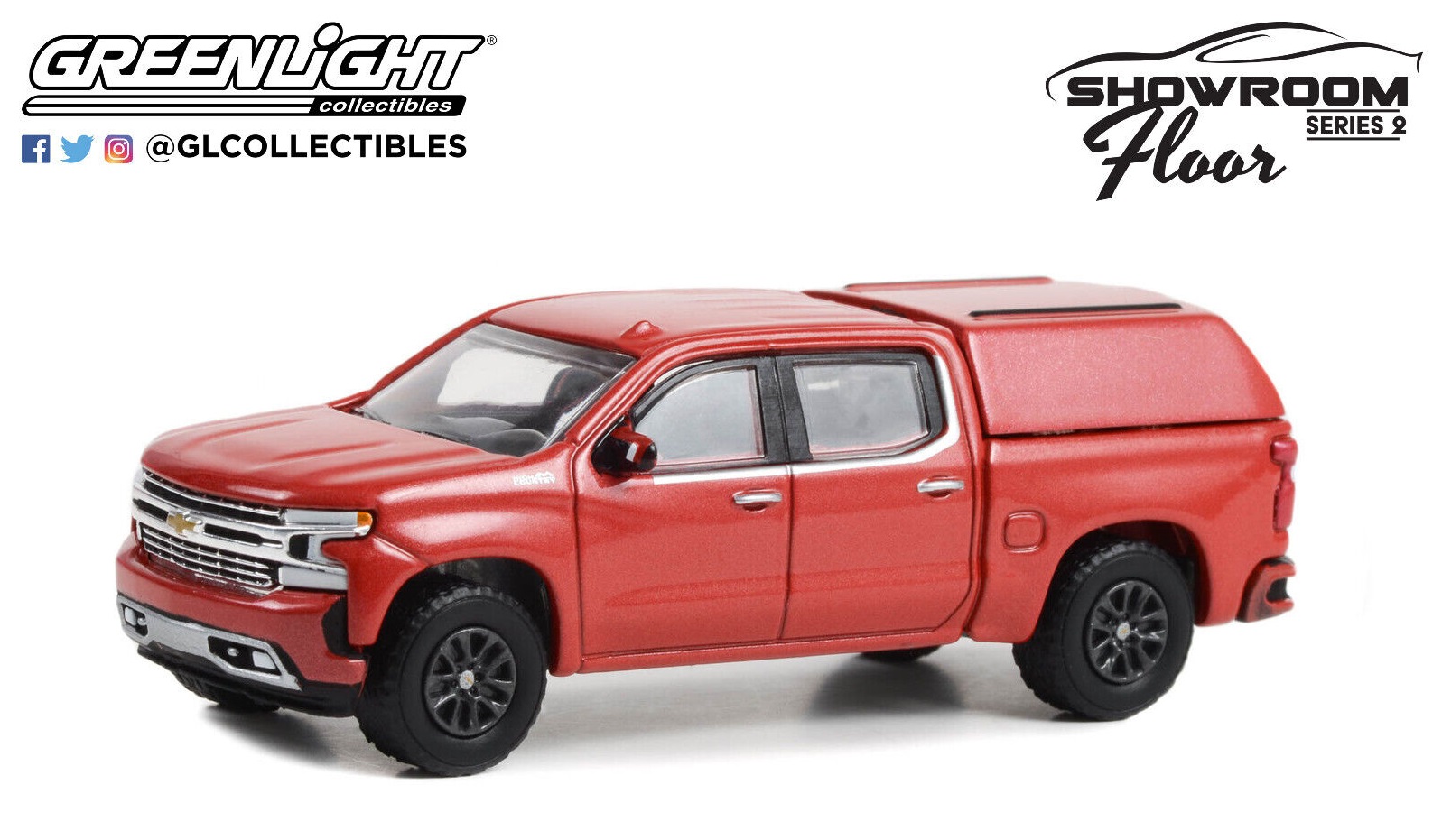 Kolekcjonerski model metalowy z elementami plastikowymi samochodu 2022 CHEVROLET SILVERADO LTD High Country with Camper Shell z roku 2022 w kolorze Cherry Red Tintcoat.Model z serii Showroom Floor – Edycja 2.