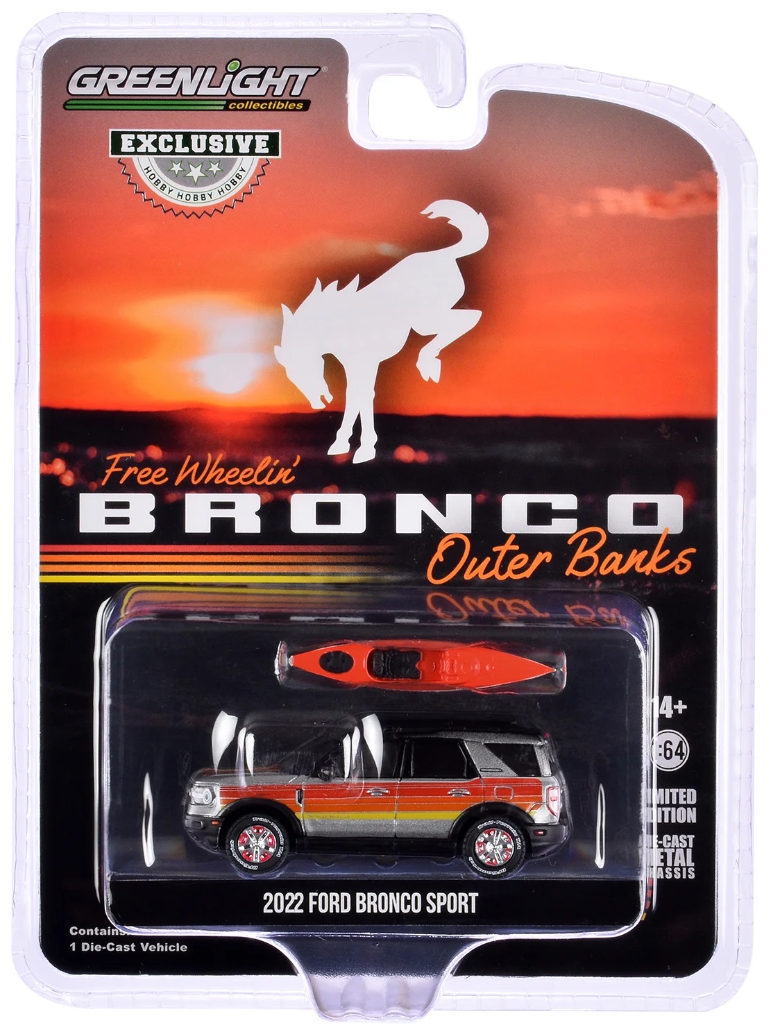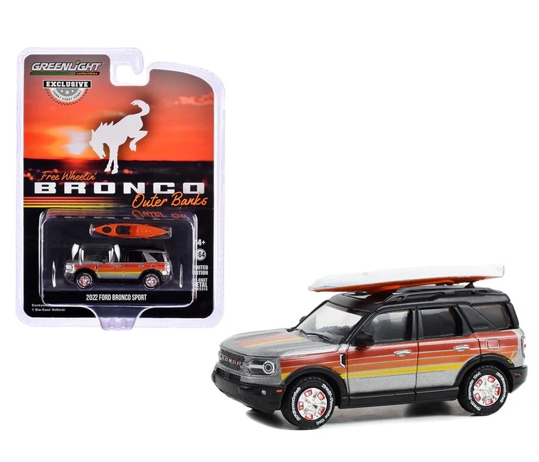 Kolekcjonerski model metalowy z elementami plastikowymi samochodu FORD BRONCO Sport Outer Banks Free Wheelen Bronco Sport z roku 2022 z kajakiem na dachu.Model z serii Exclusive Hobby.