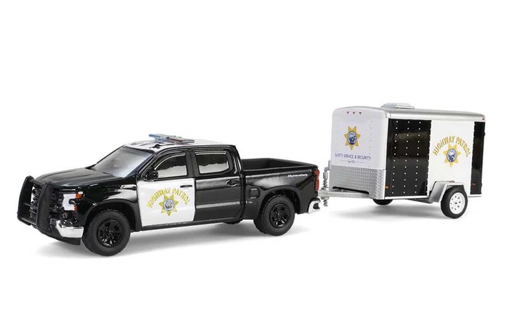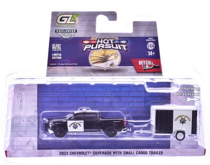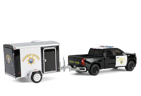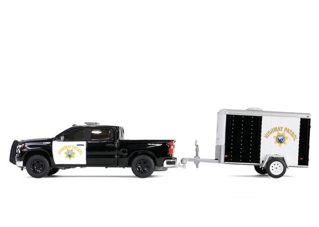 Kolekcjonerski zestaw modeli metalowych z elementami plastikowymi samochodu CHEVROLET SILVERADO z roku 2023 z przyczepą towarową w malowaniu kalifornijskiej policji autostradowej.Model z serii Hot Pursuit Hitch & Tow,Edycja 1.