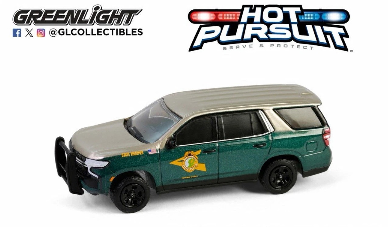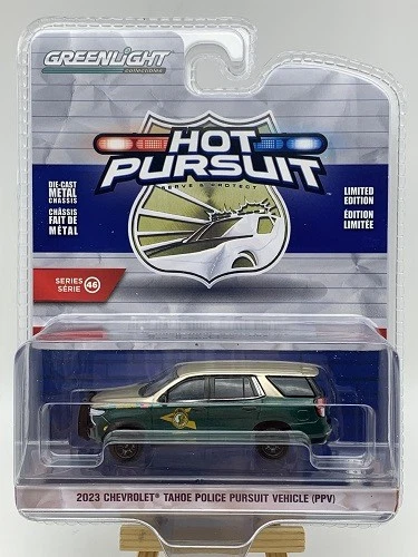 Kolekcjonerski model metalowy z elementami plastikowymi samochodu CHEVROLET TAHOE Police Pursuit Vechicle z roku 2023 w malowaniu policji stanowej New Hampshire.Model z serii Hot Pursuit – Edycja 46.