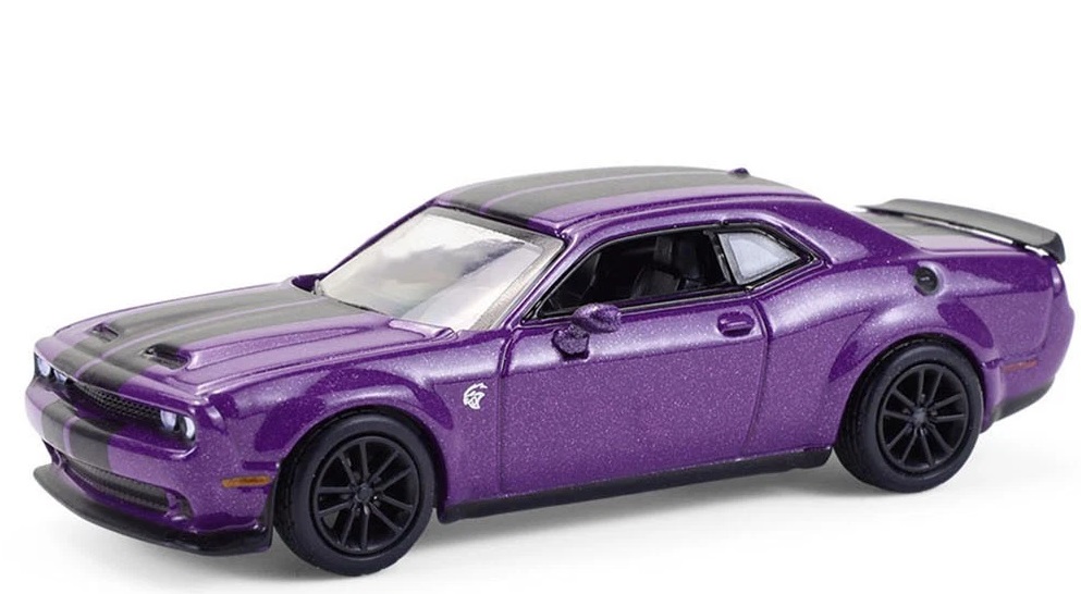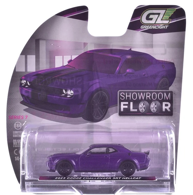 Kolekcjonerski model metalowy z elementami plastikowymi samochodu DODGE CHALLENGR SRT Hellcat Jailbreak z roku 2023 w kolorze Plum Crazy.Model z serii Showroom Floor,Edycja 7.Model zapakowany w blister.