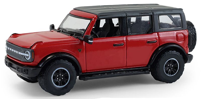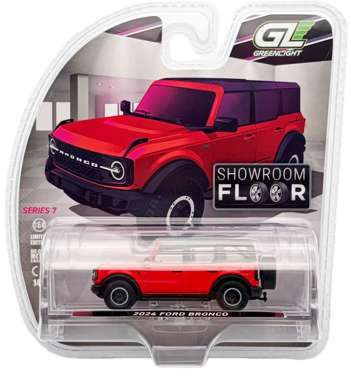 Kolekcjonerski model metalowy z elementami plastikowymi samochodu FORD BRONCO 4-Door Badlands z roku 2024 w kolorze Hot Pepper Red Metallic.Model z serii Showroom Floor,Edycja 7.Model zapakowany w blister.