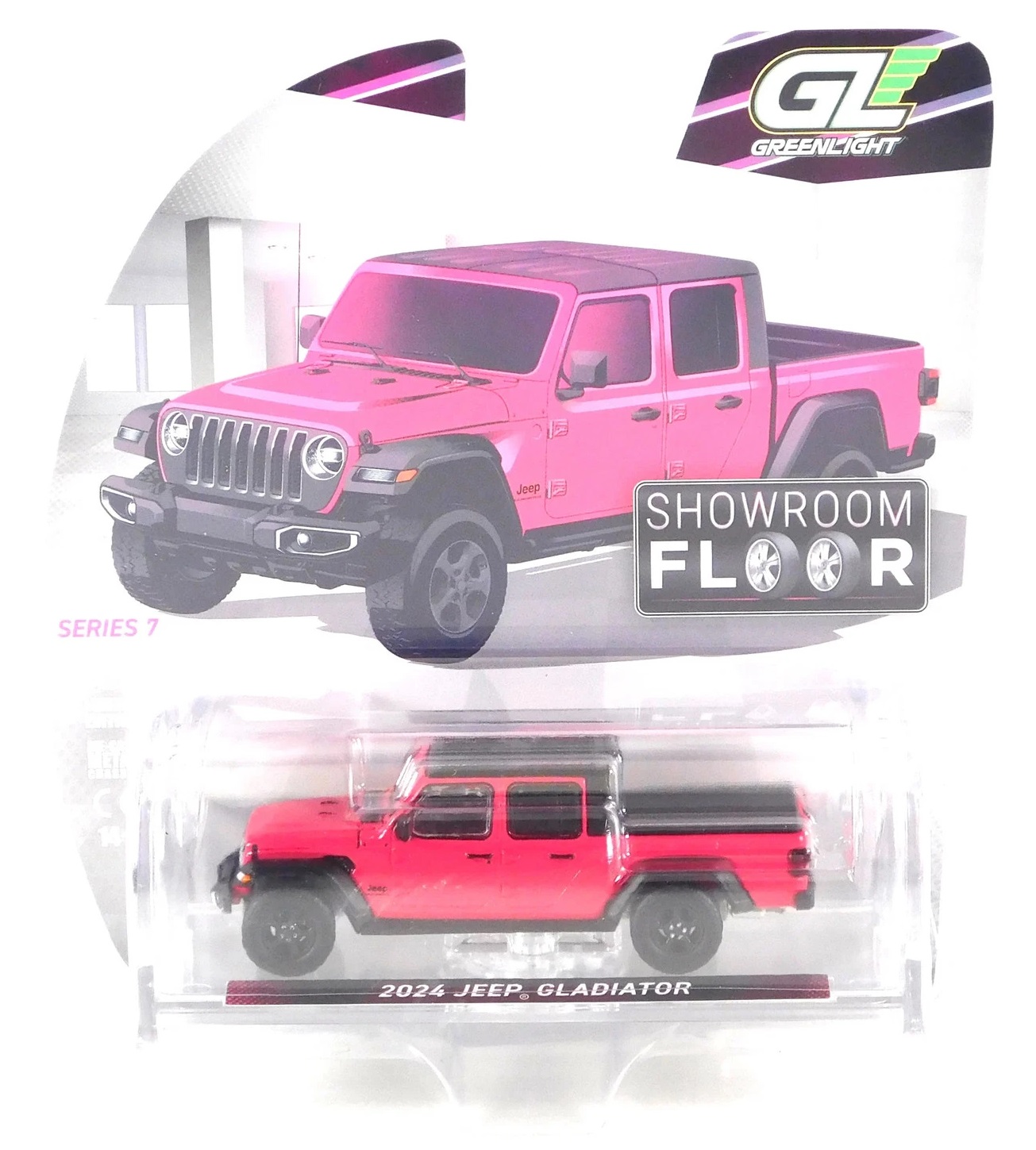 Kolekcjonerski model metalowy z elementami plastikowymi samochodu JEEP GLADIATOR z roku 2024 w kolorze Tuscadero.Model z serii Showroom Floor,Edycja 7.Model zapakowany w blister.