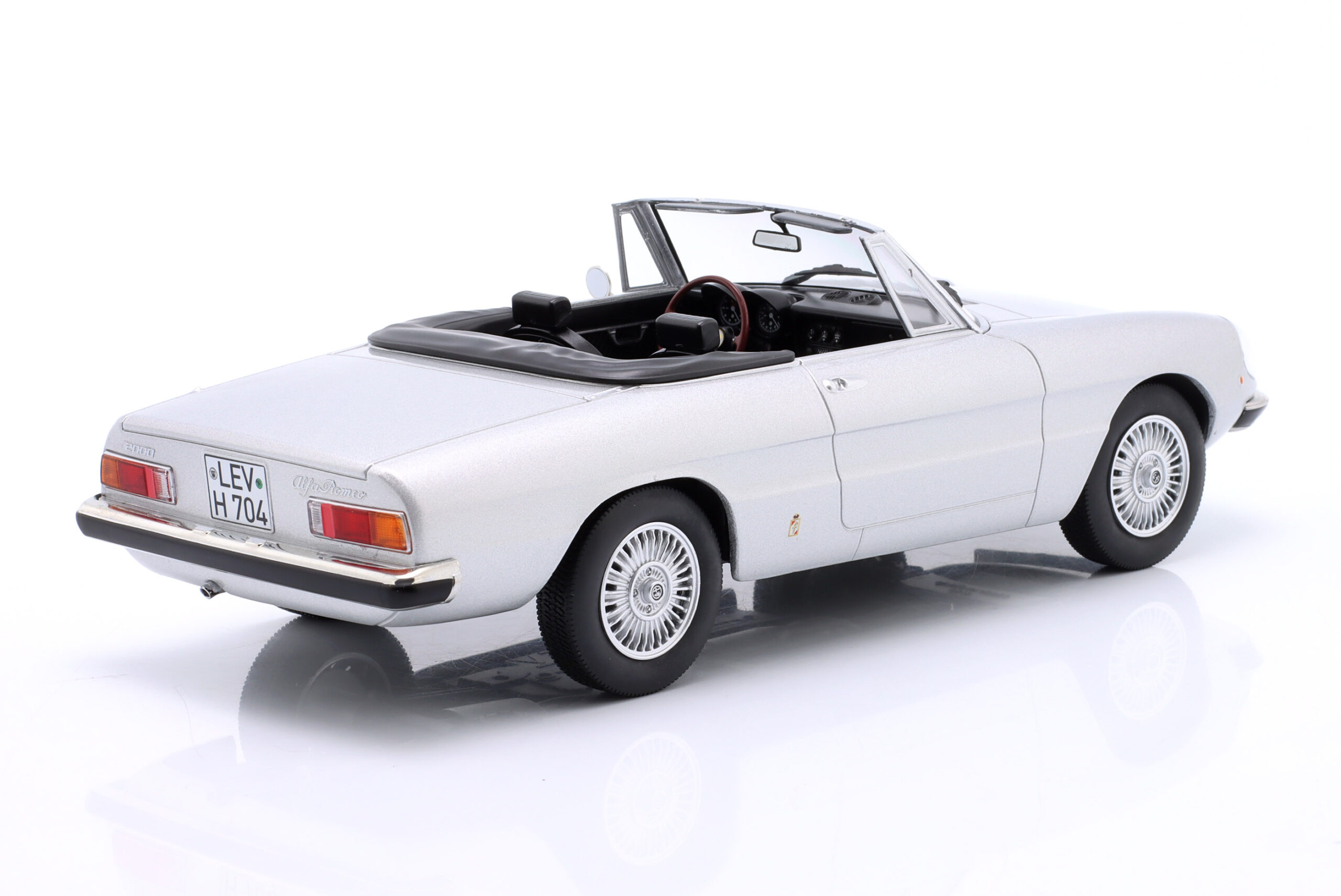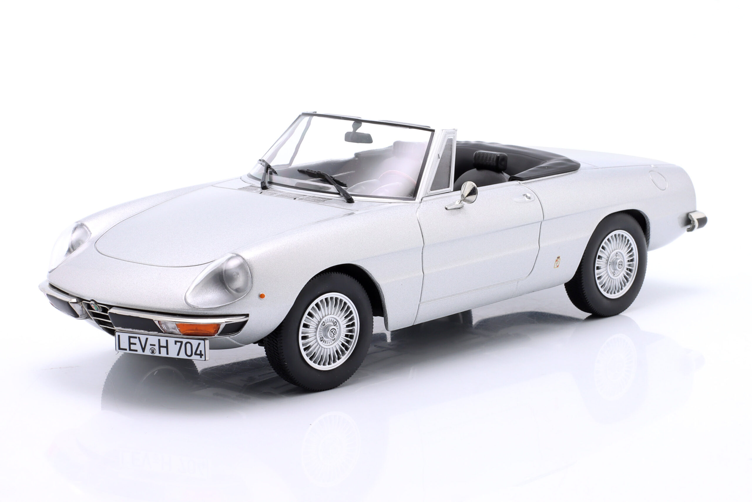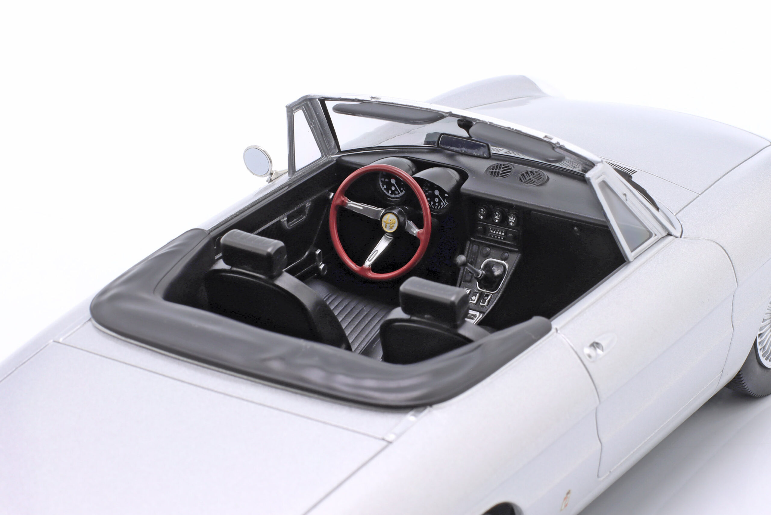 Kolekcjonerski model metalowy z elementami plastikowymi samochodu ALFA ROMEO 2000 Spider z roku 1973 w kolorze Srebrnoszary metallic.Model nie posiada otwieranych elementów.