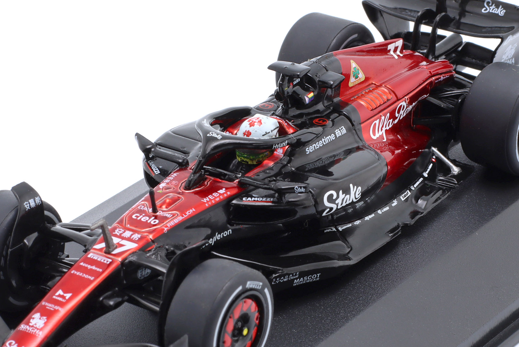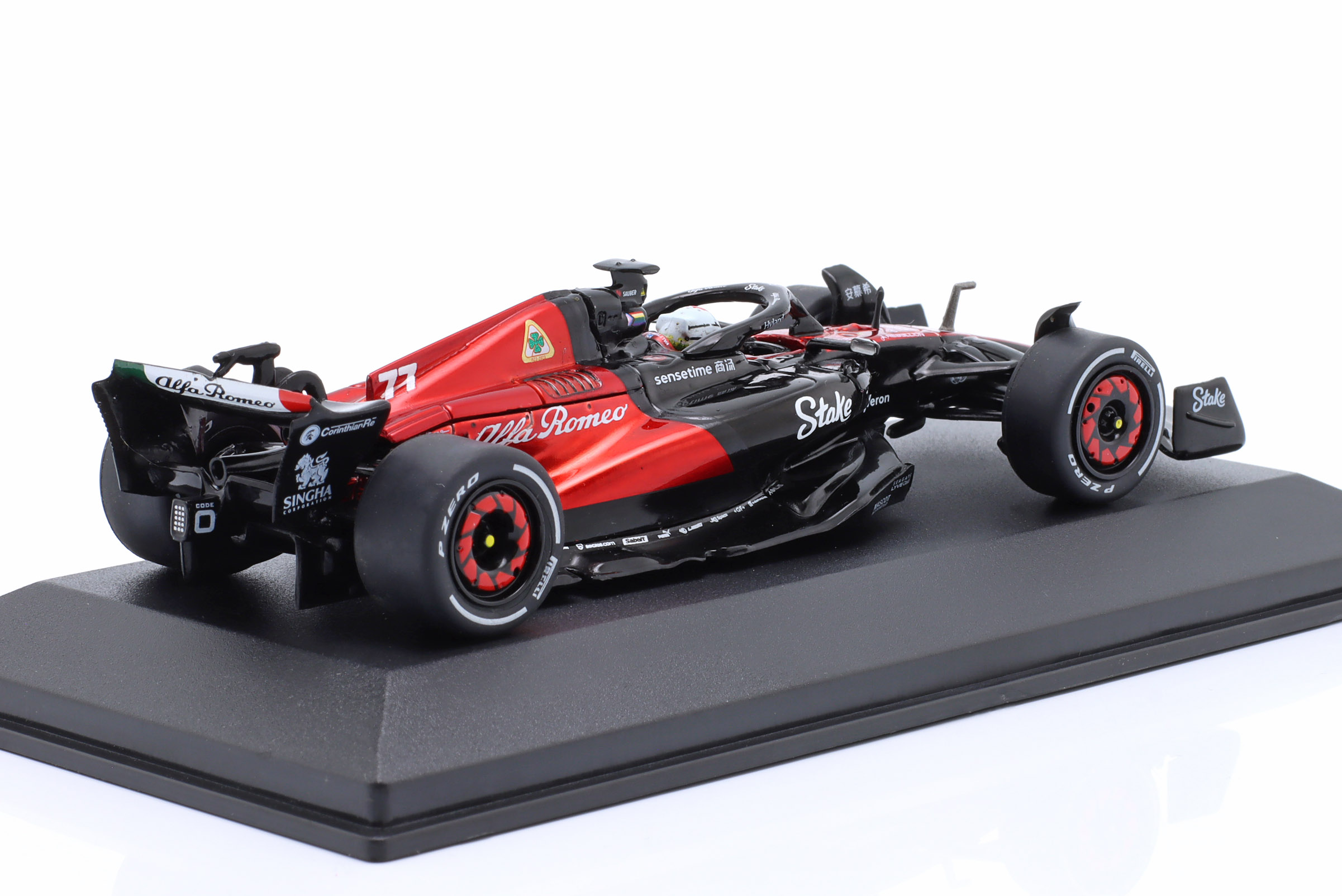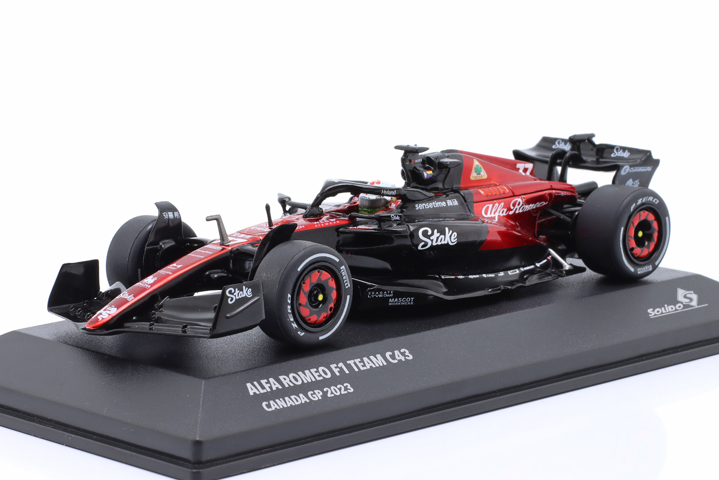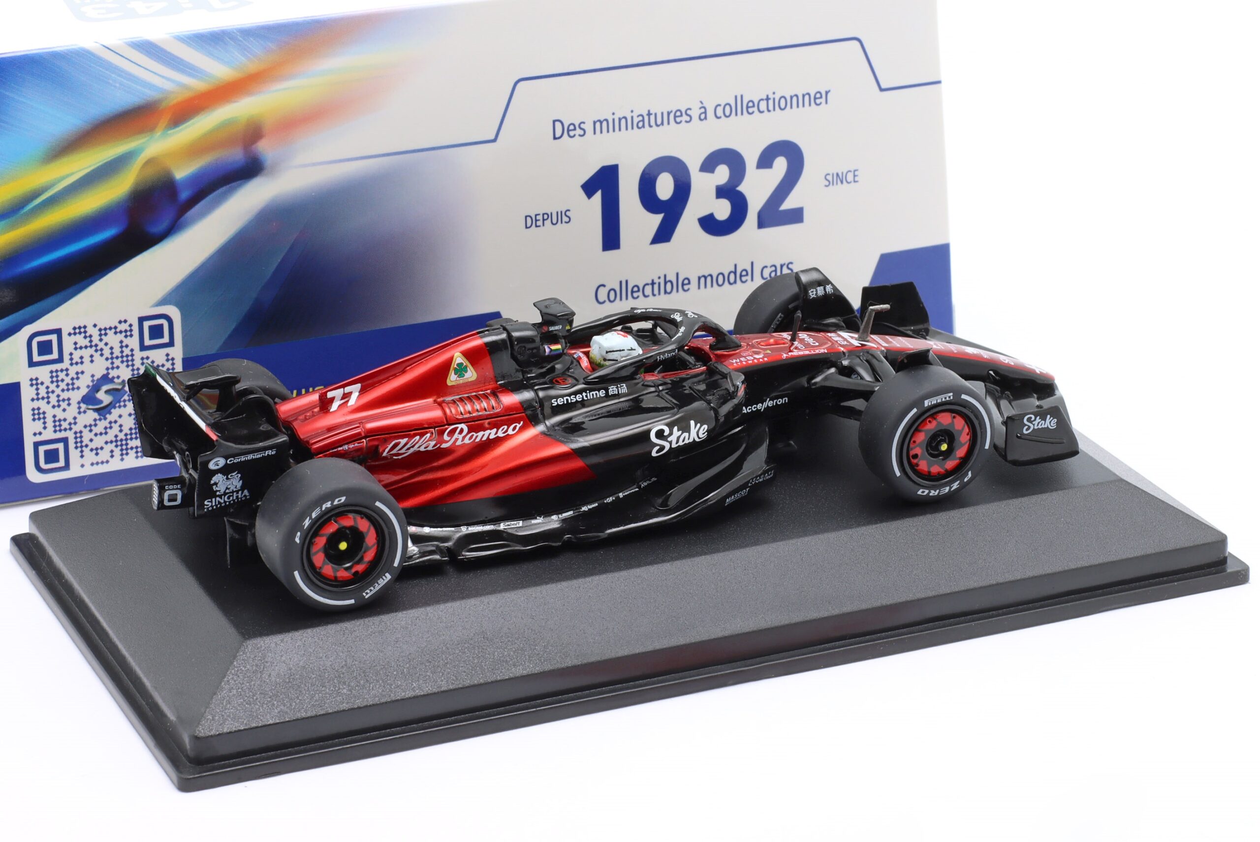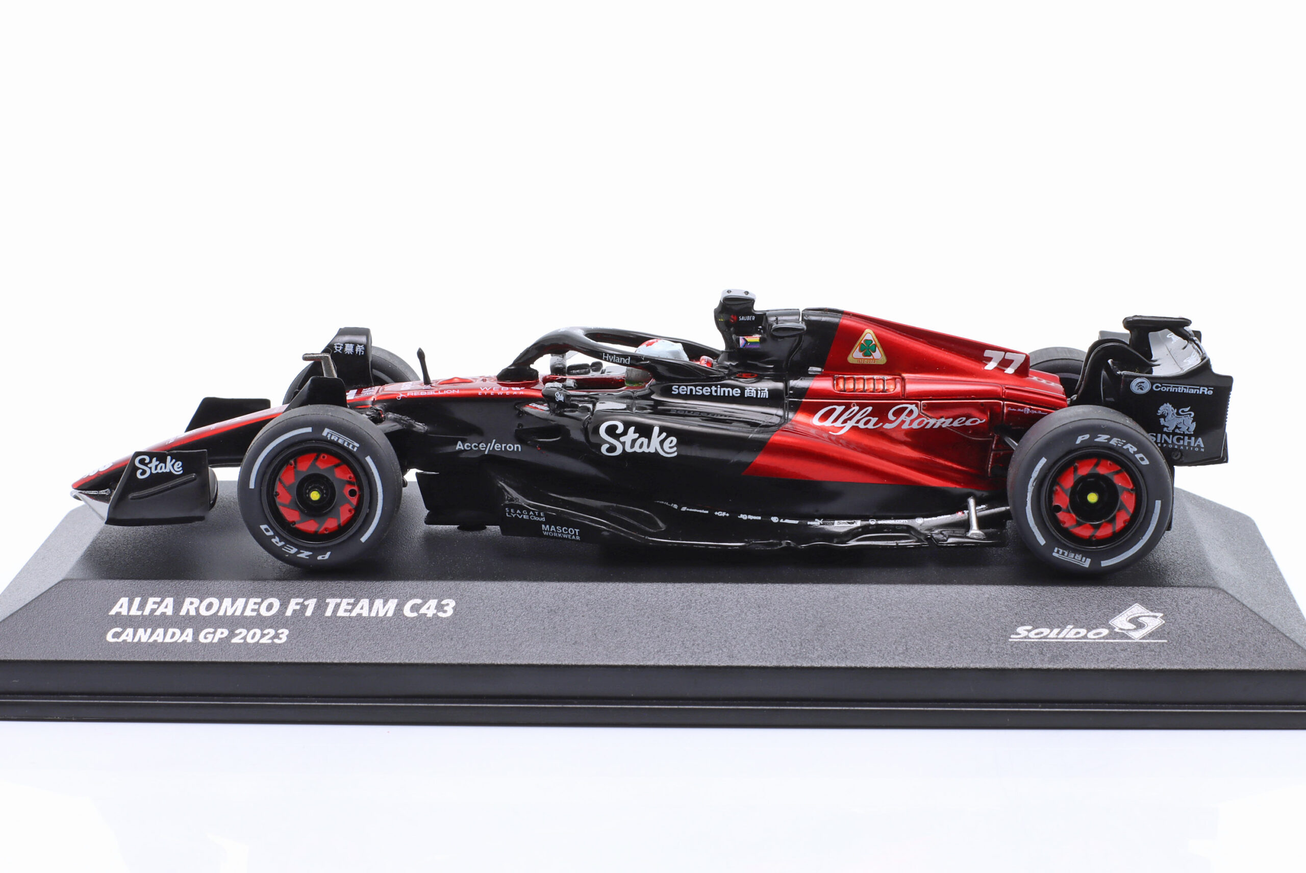 Kolekcjonerski model metalowy z elementami plastikowymi bolidu Formuły 1 ALFA ROMEO C43 #77,w którym V.Bottas zajął 10-te miejsce w GP Kanady w sezonie 2023.Model posiada podstawkę oraz gablotkę ekspozycyjną.
