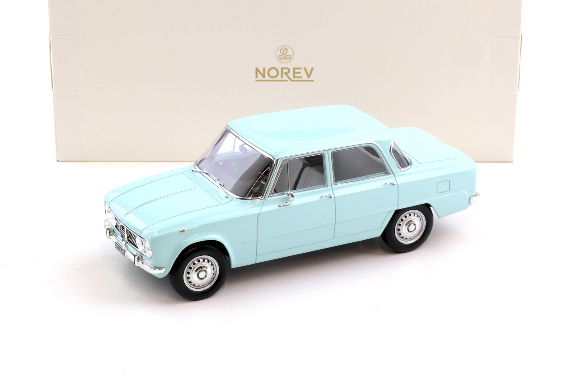Kolekcjonerski model metalowy z elementami plastikowymi samochodu ALFA ROMEO GILULIA TI z roku 1964 w kolorze Sky Blue.Model nie posiada otwieranych elementów.