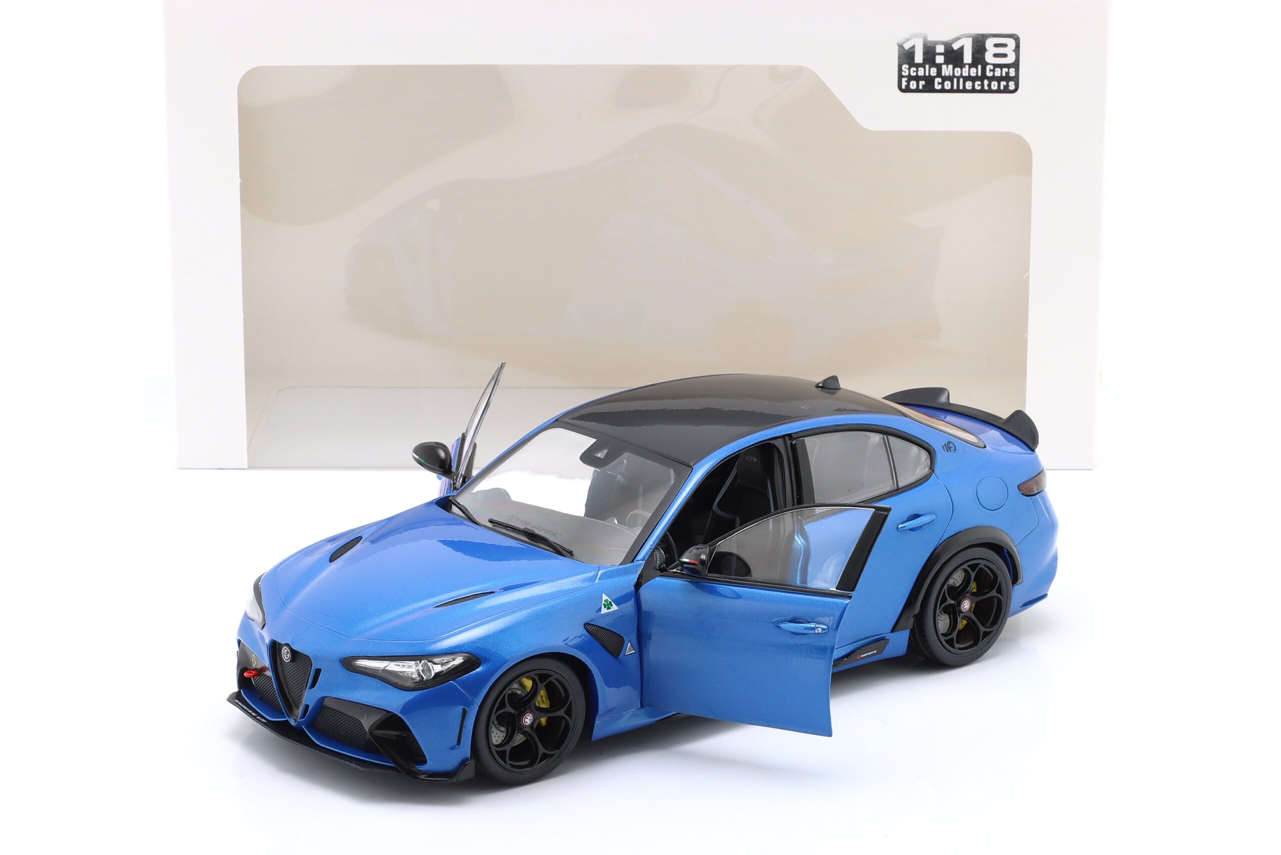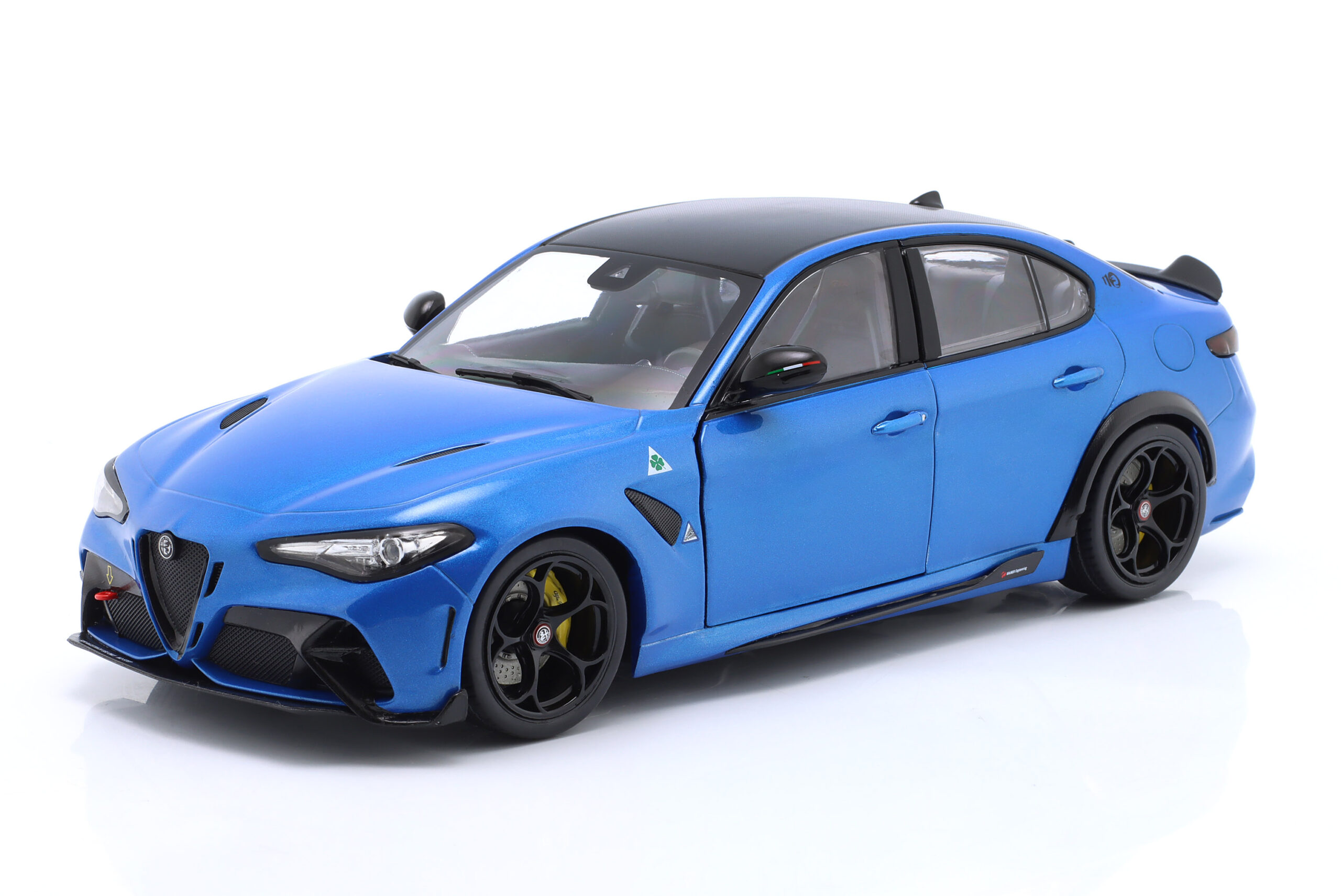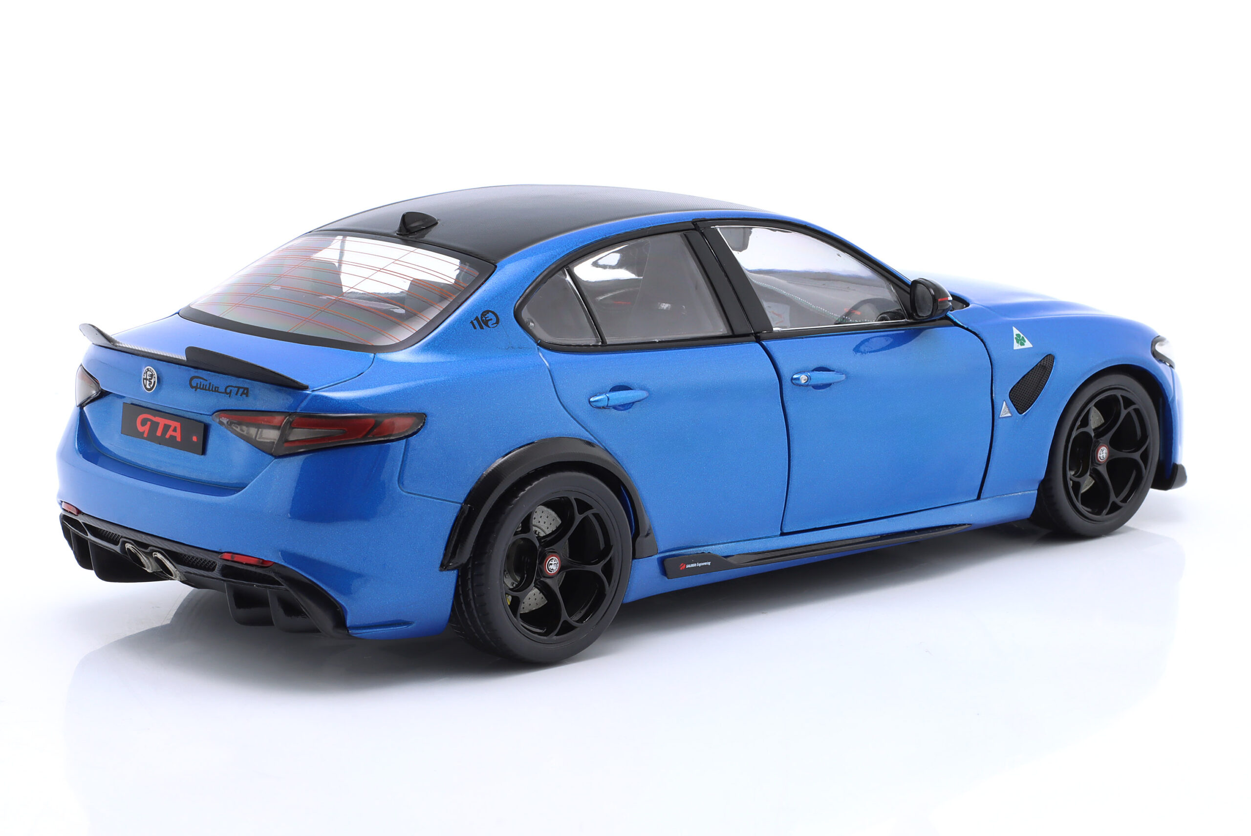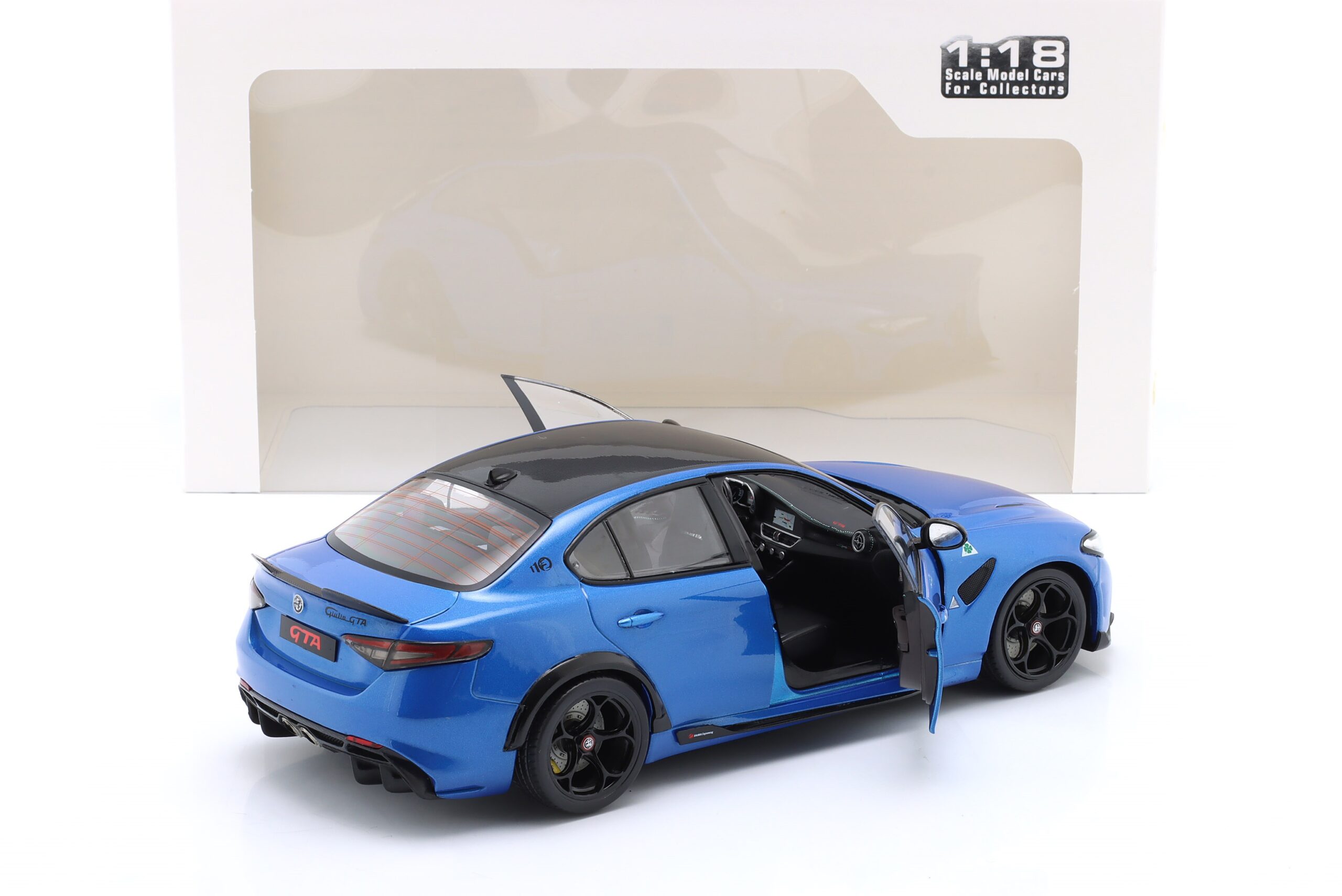 Kolekcjonerski model metalowy z elementami plastikowymi samochodu ALFA ROMEO GIULIA GTA z roku 2022 w kolorze Anodized blue. Model ma otwierane drzwi.