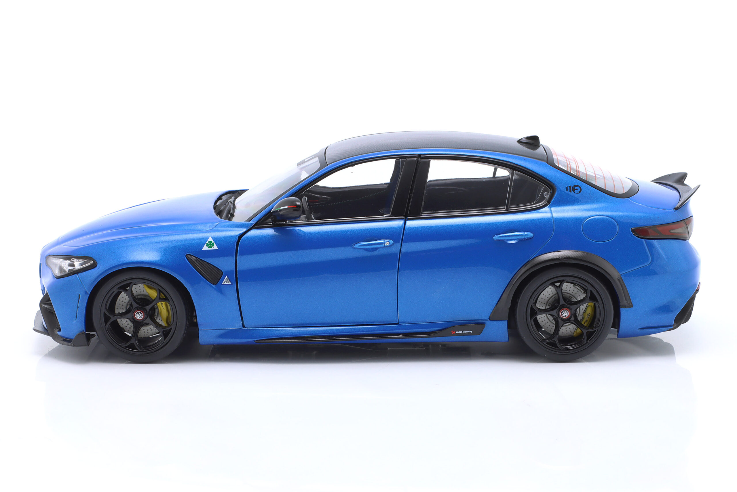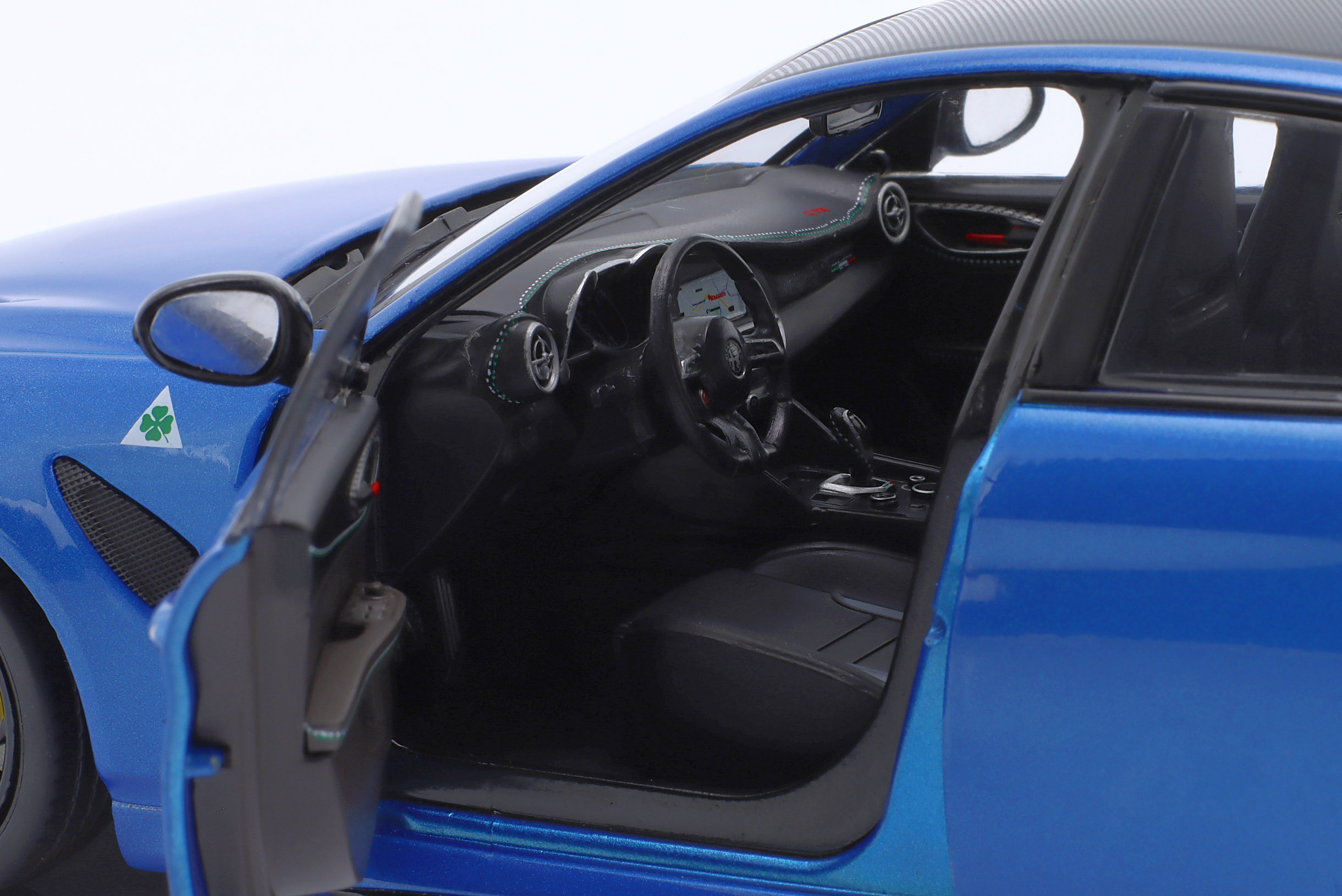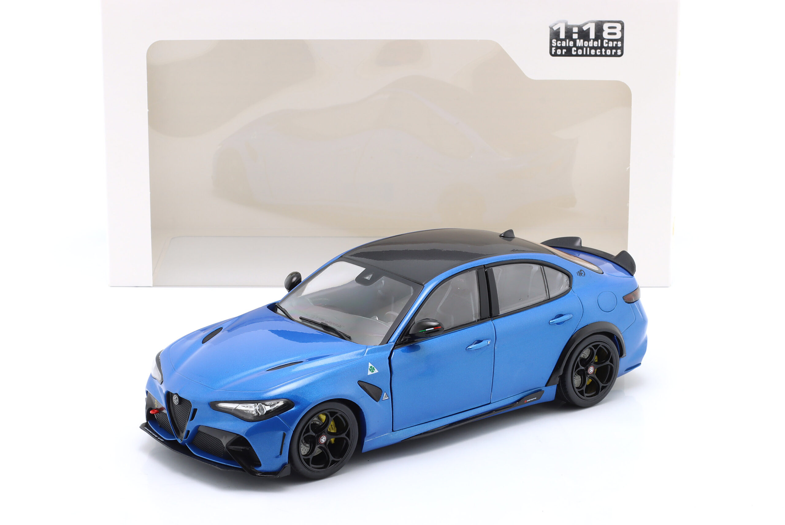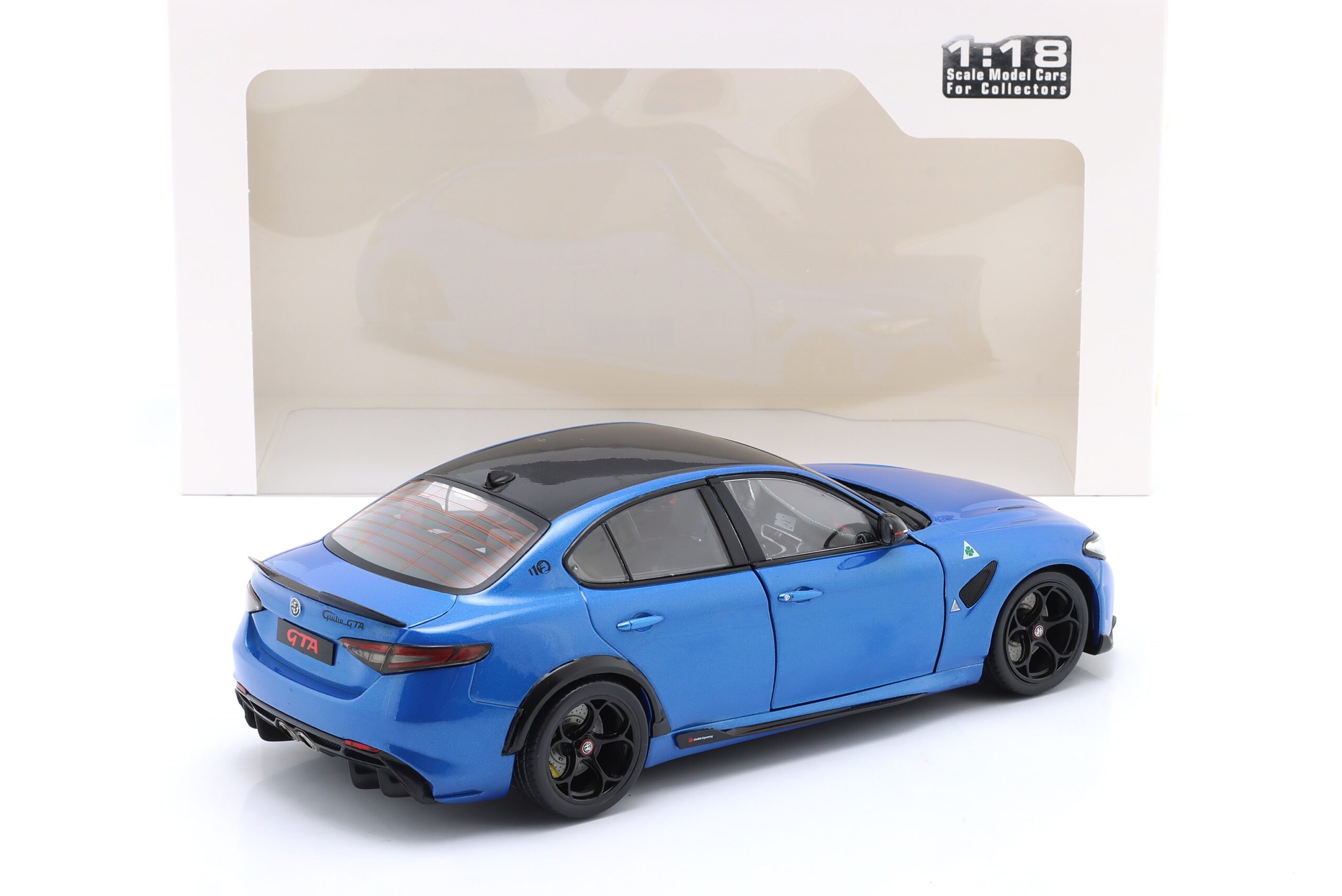 Kolekcjonerski model metalowy z elementami plastikowymi samochodu ALFA ROMEO GIULIA GTA z roku 2022 w kolorze Anodized blue. Model ma otwierane drzwi.