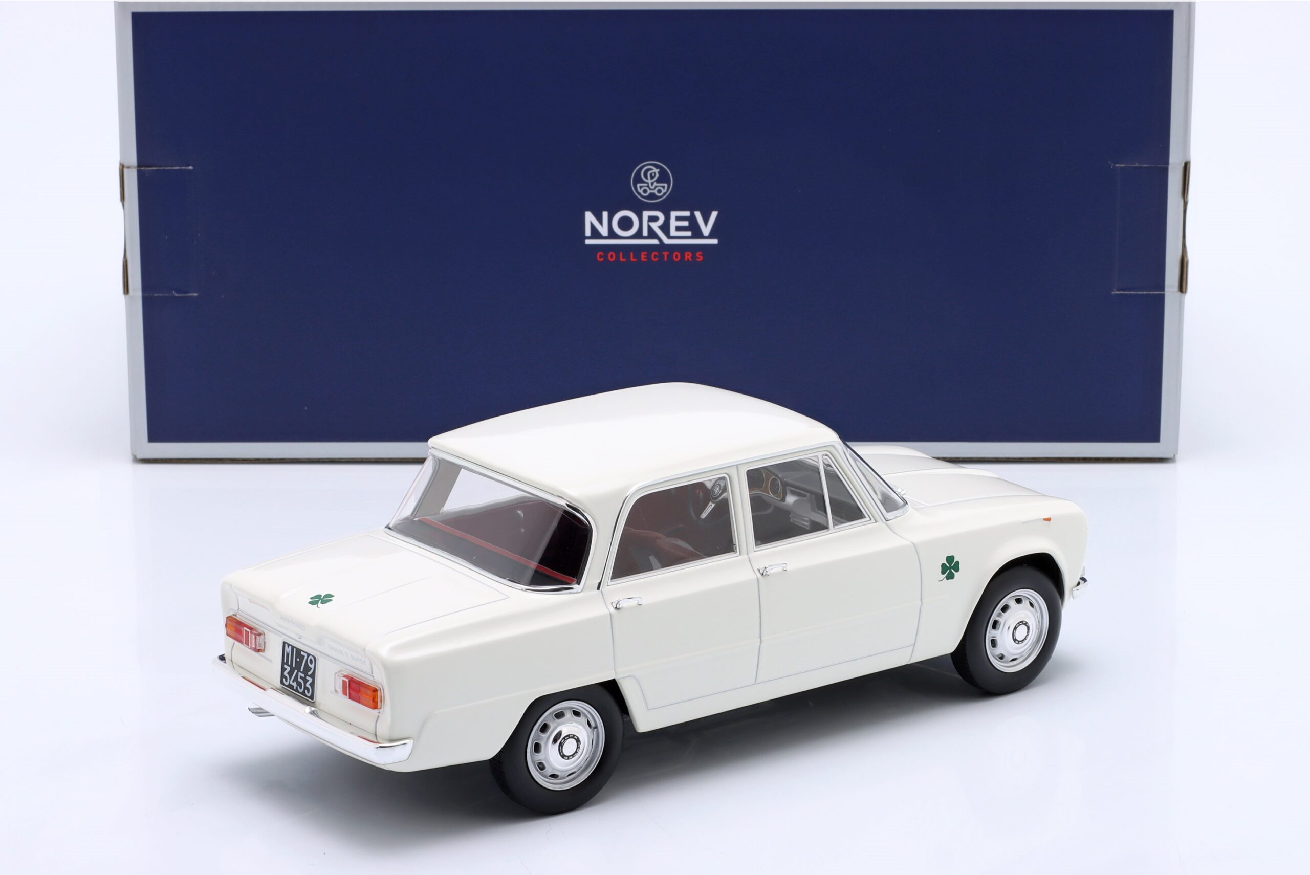 Kolekcjonerski model metalowy z elementami plastikowymi samochodu ALFA ROMEO GIULIA TI SUPER z roku 1963 w kolorze Białym.Model nie posiada otwieranych elementów.