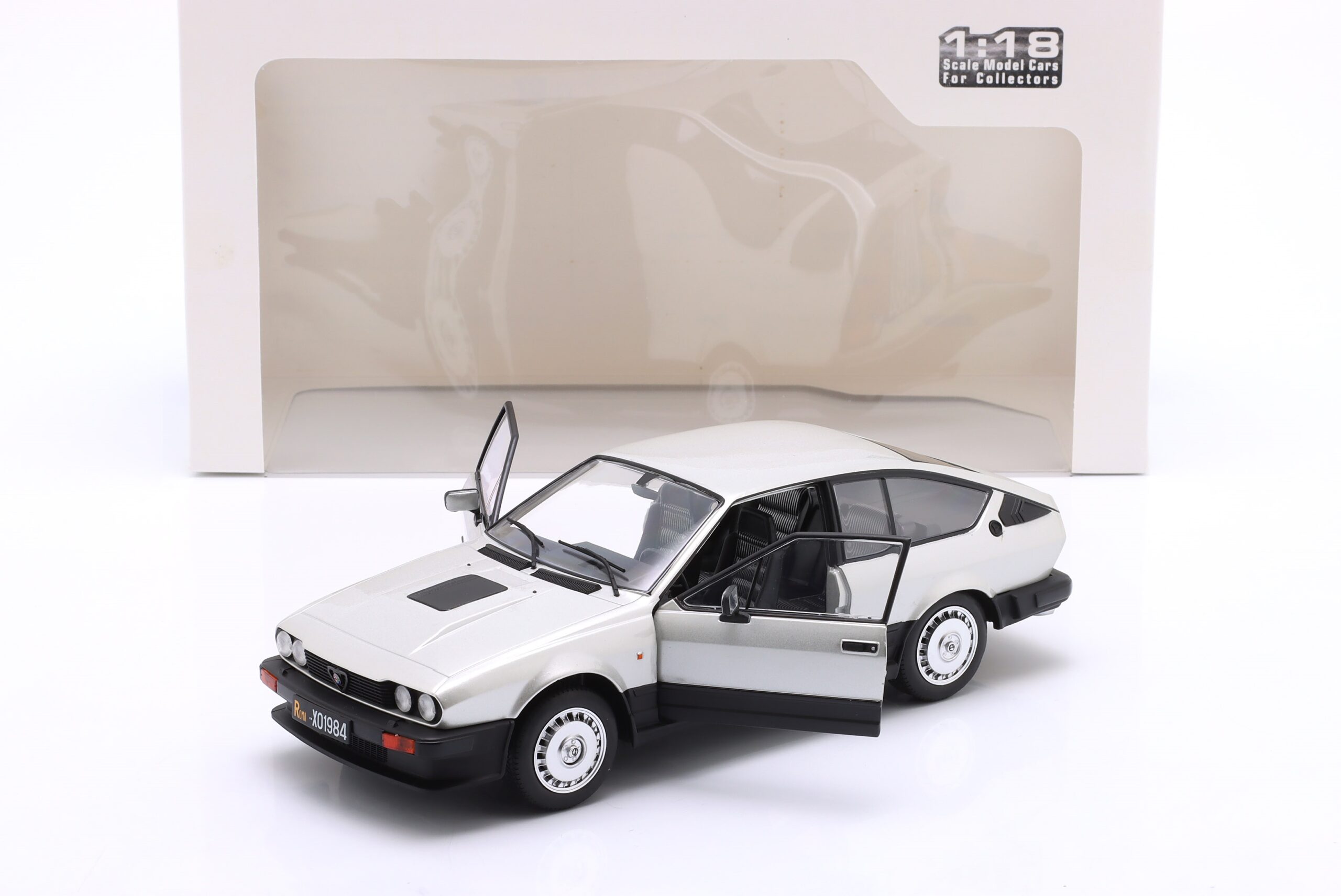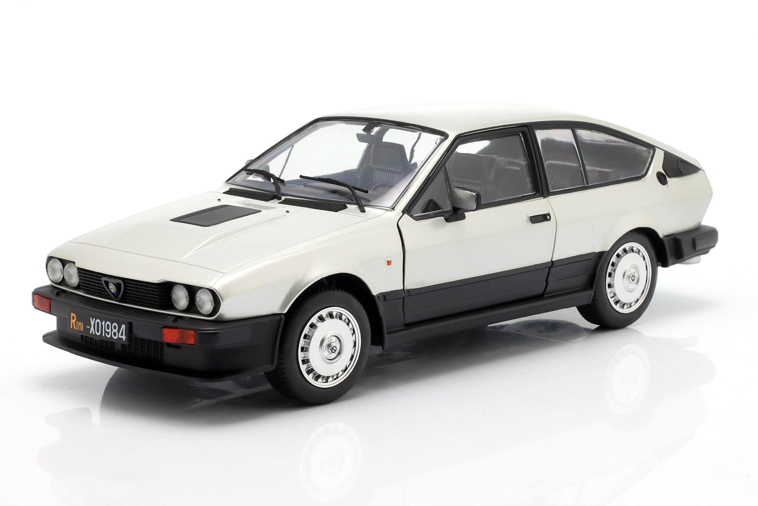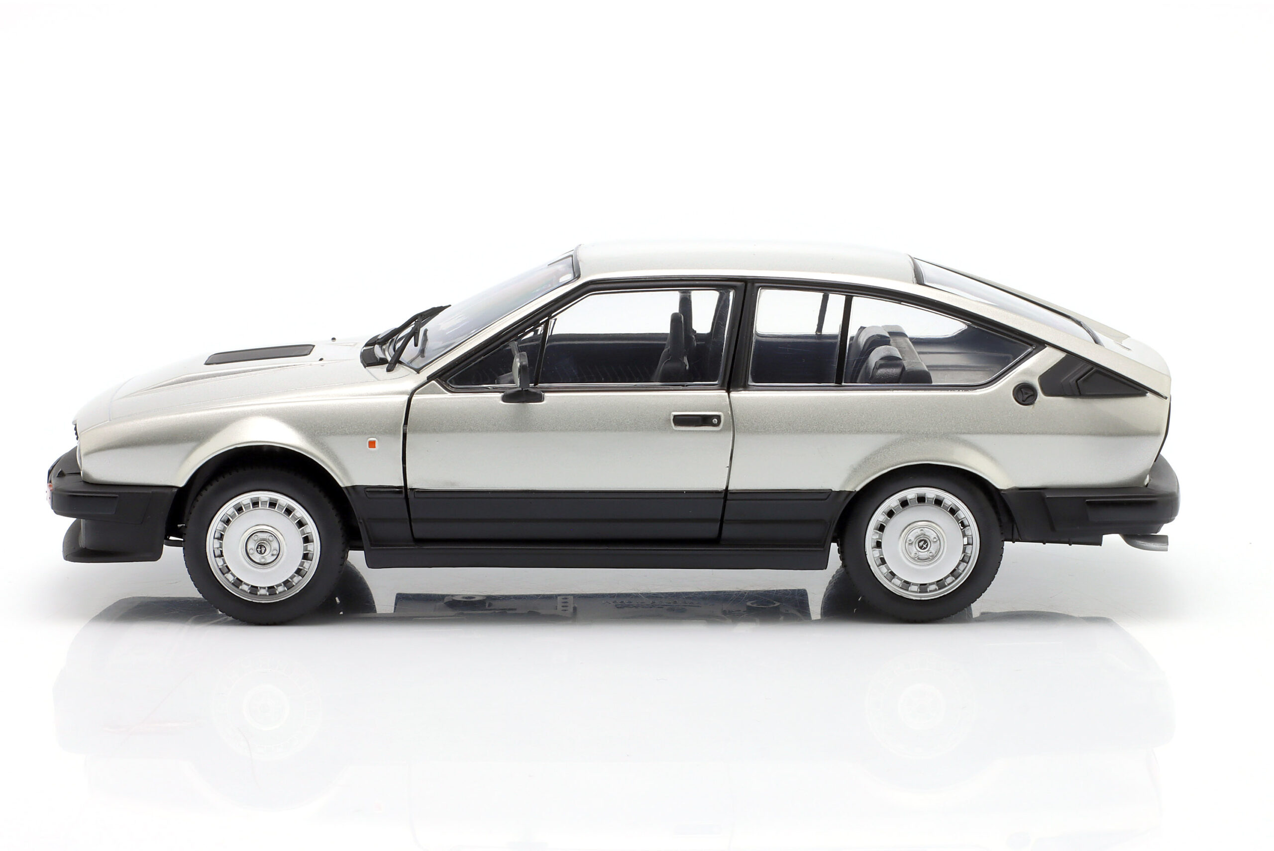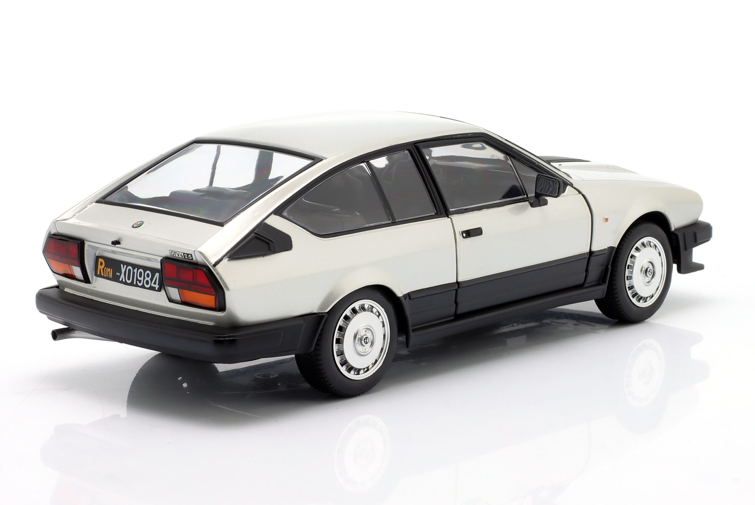 Kolekcjonerski model metalowy z elementami plastikowymi samochodu ALFA ROMEO GTV6 roku 1984 w kolorze Srebrnym.Model posiada otwierane drzwi.