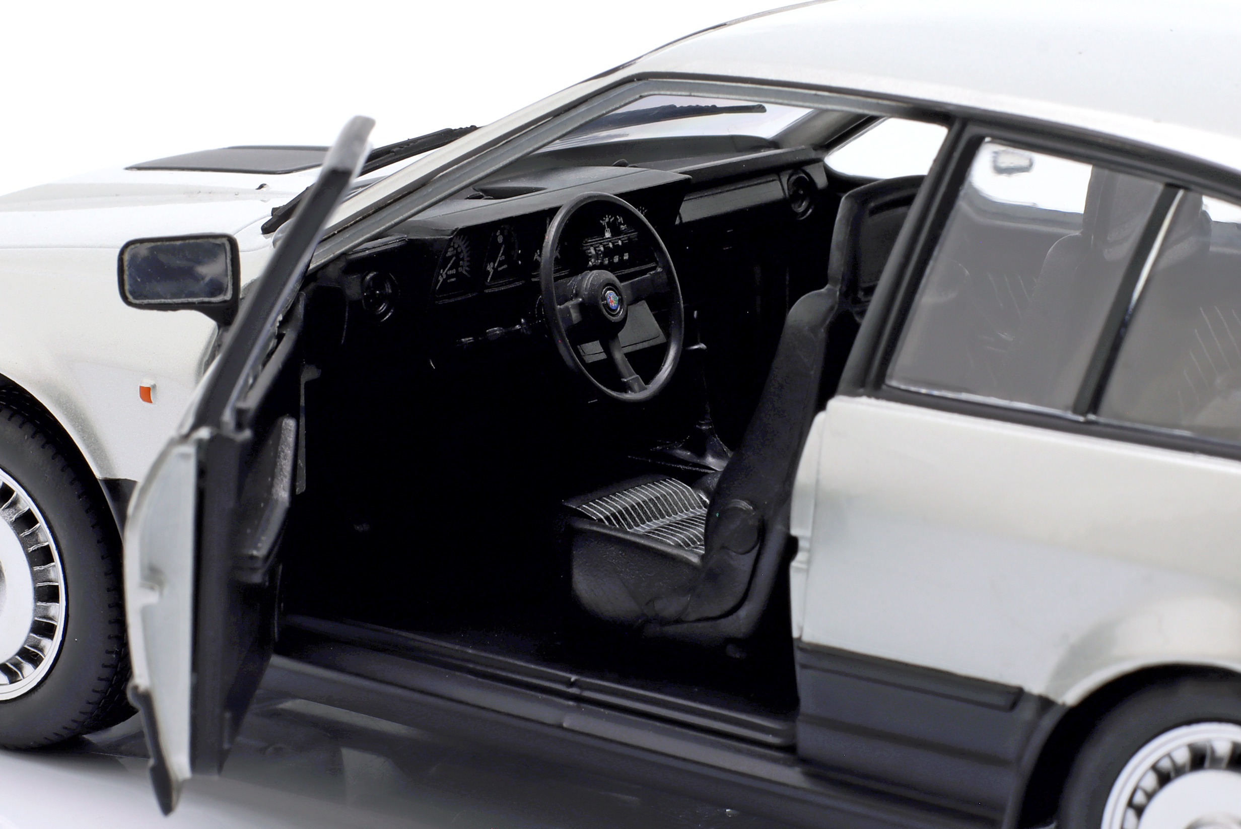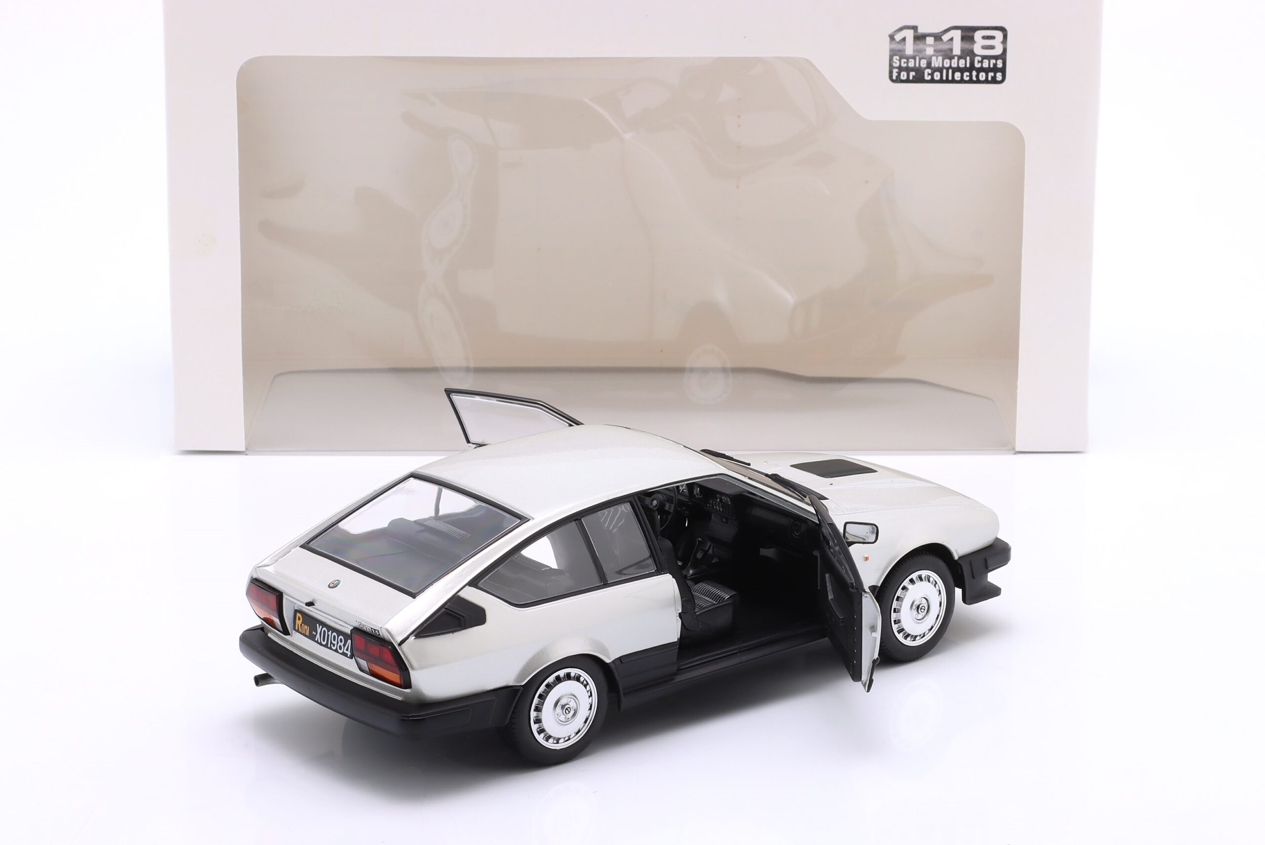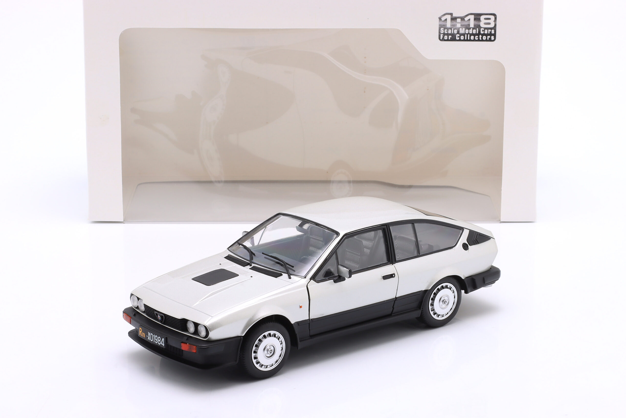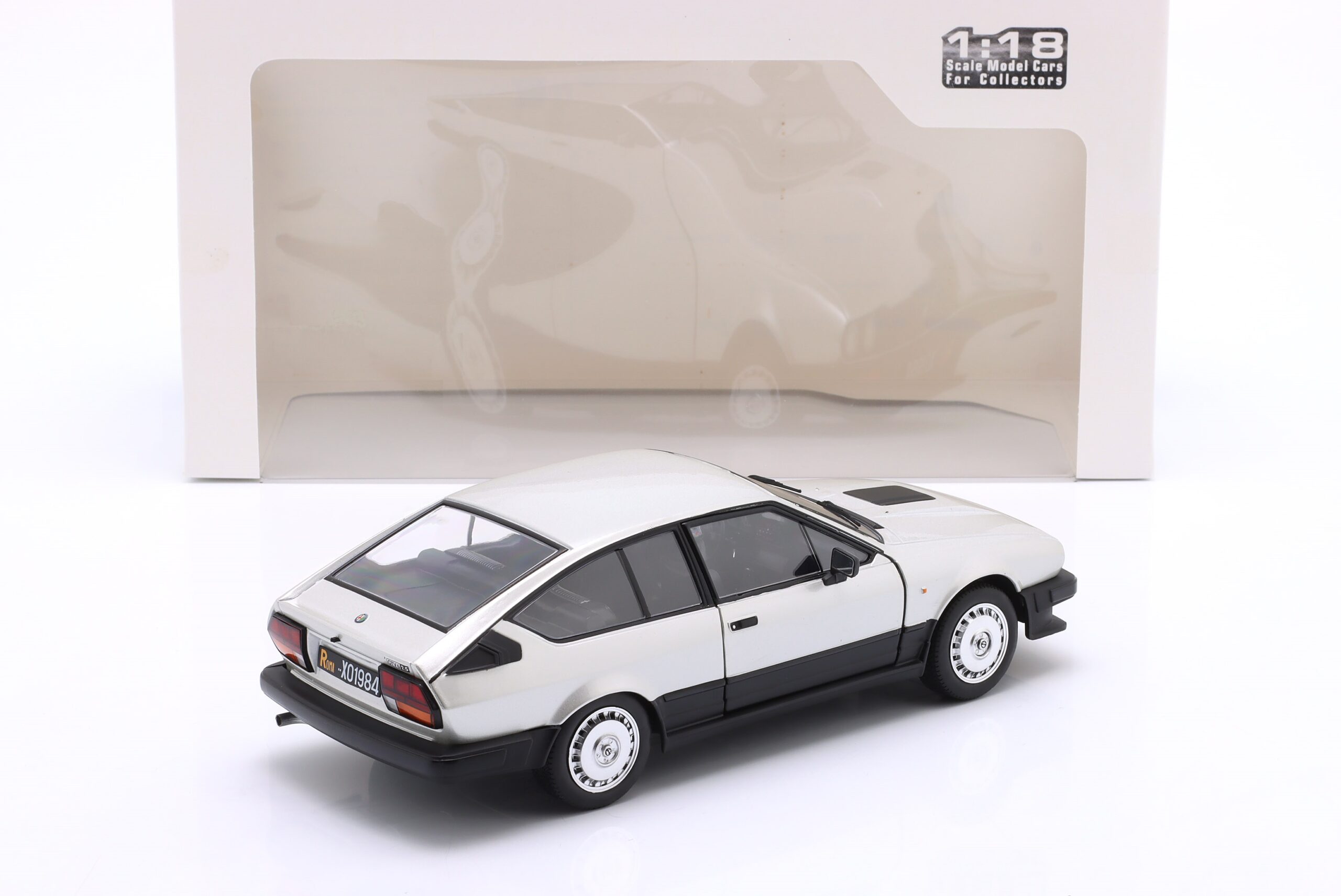 Kolekcjonerski model metalowy z elementami plastikowymi samochodu ALFA ROMEO GTV6 roku 1984 w kolorze Srebrnym.Model posiada otwierane drzwi.
