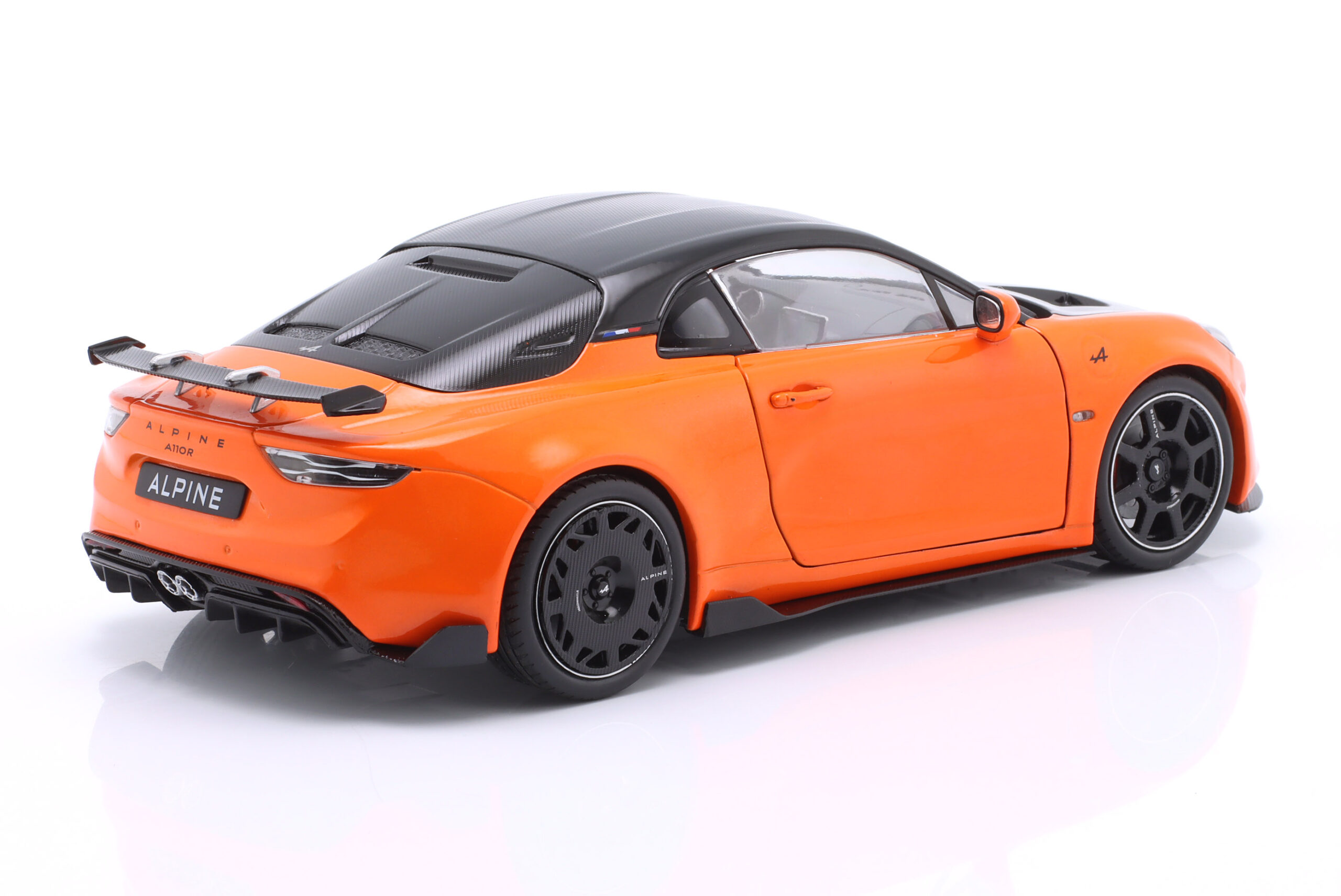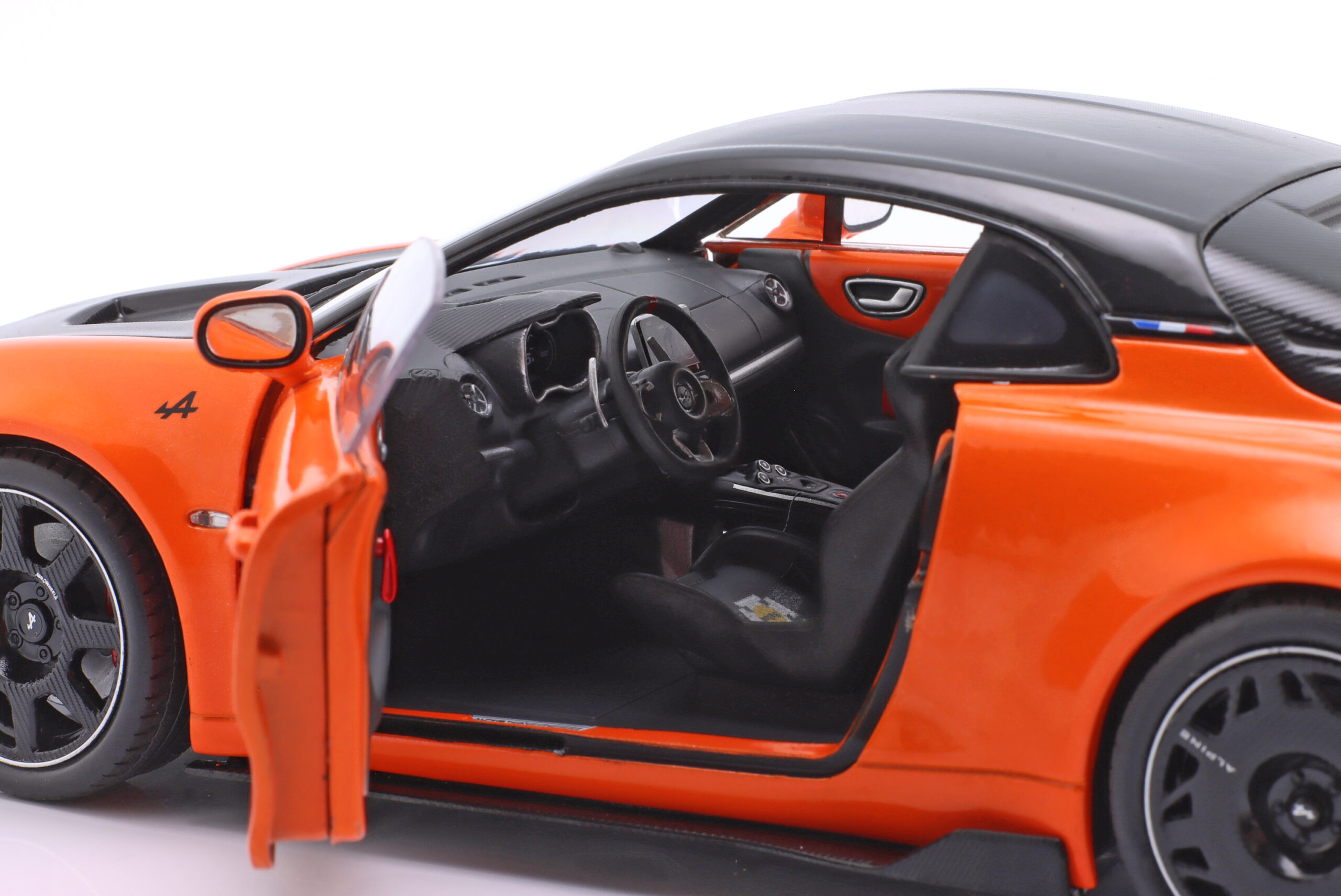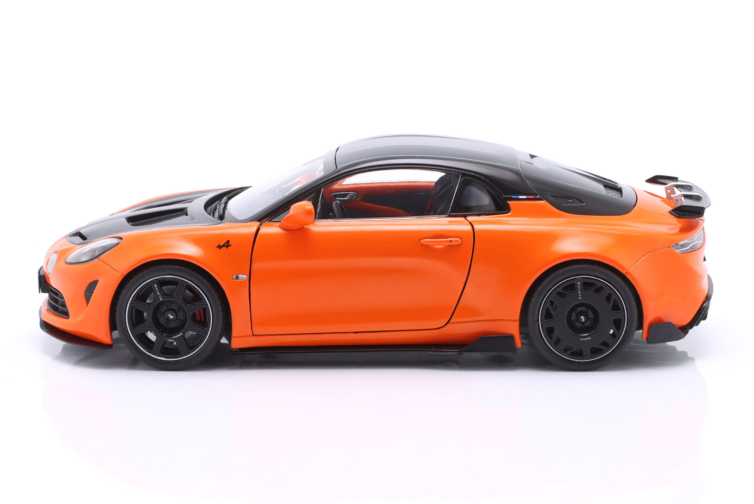 Kolekcjonerski model metalowy z elementami plastikowymi samochodu ALPINE A110 Radicale z roku 2024 w kolorze Pomarańczowy/kobaltowy.