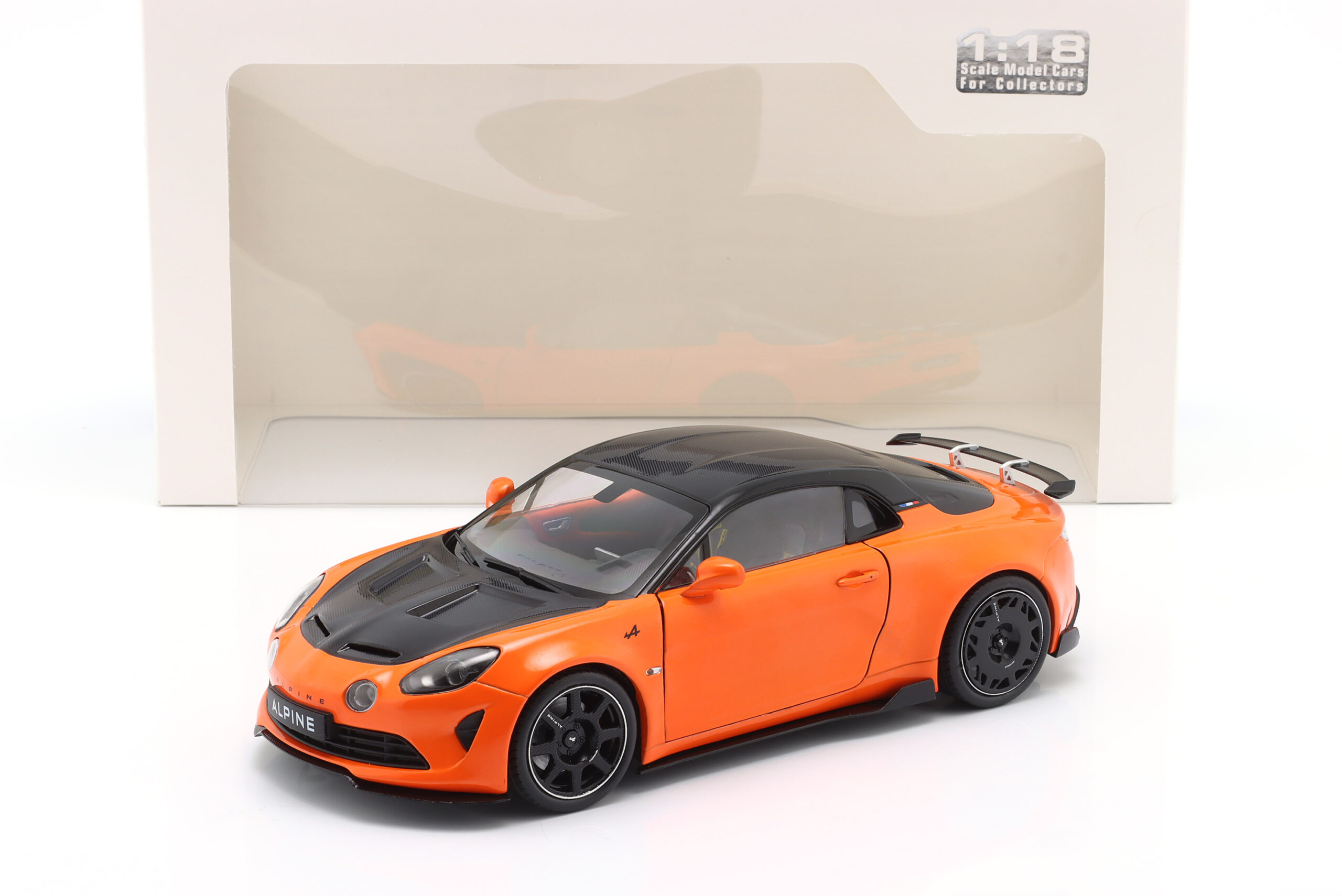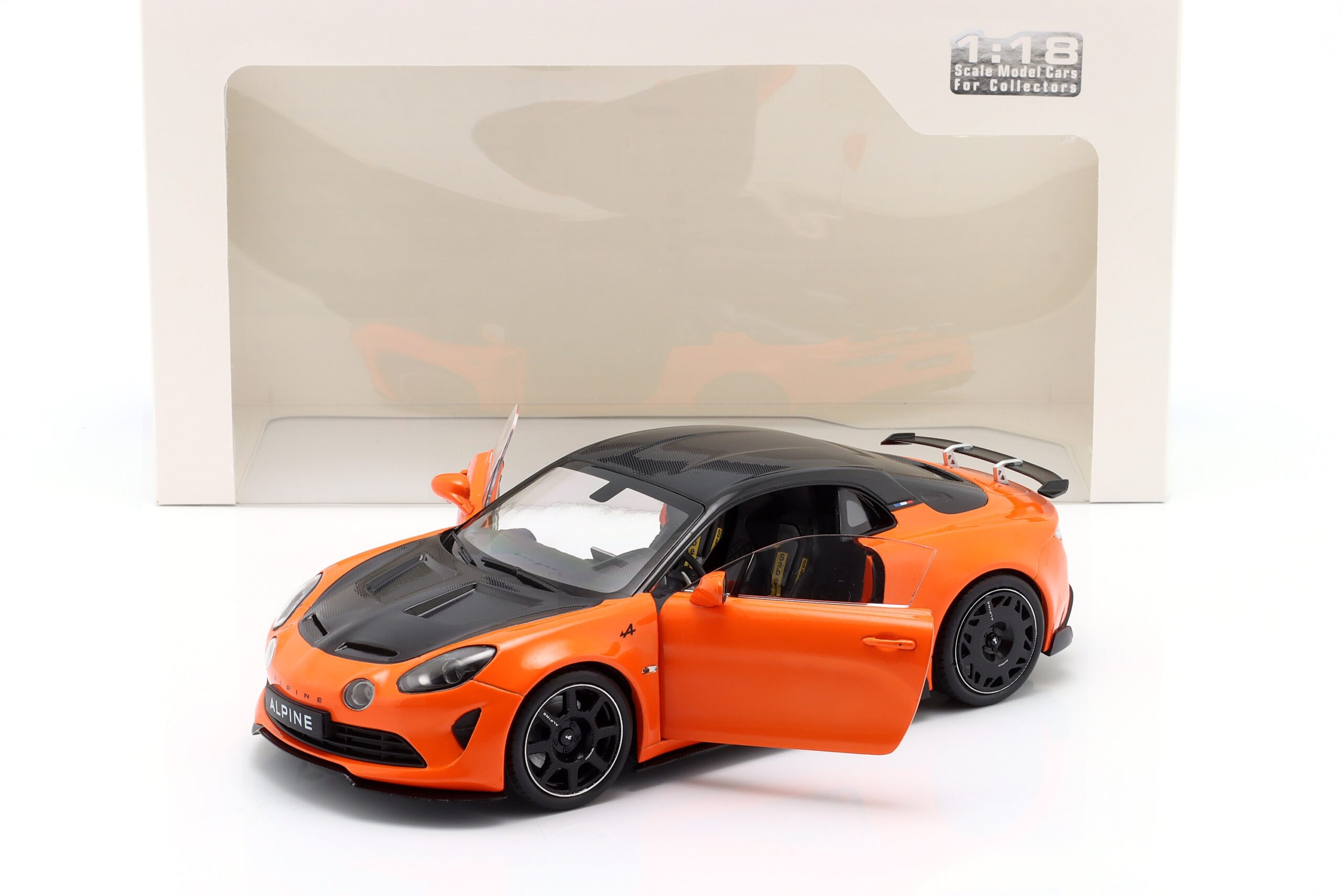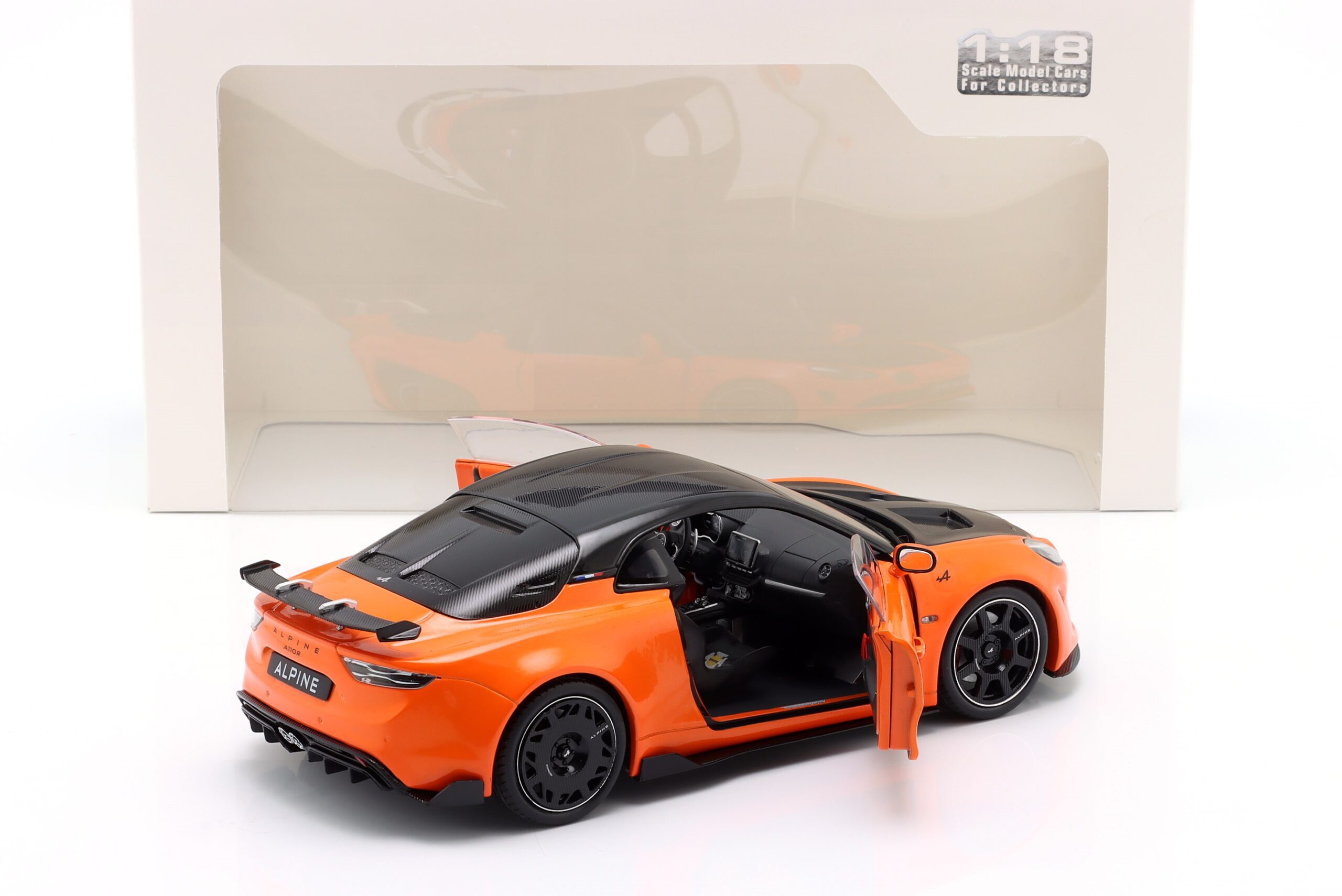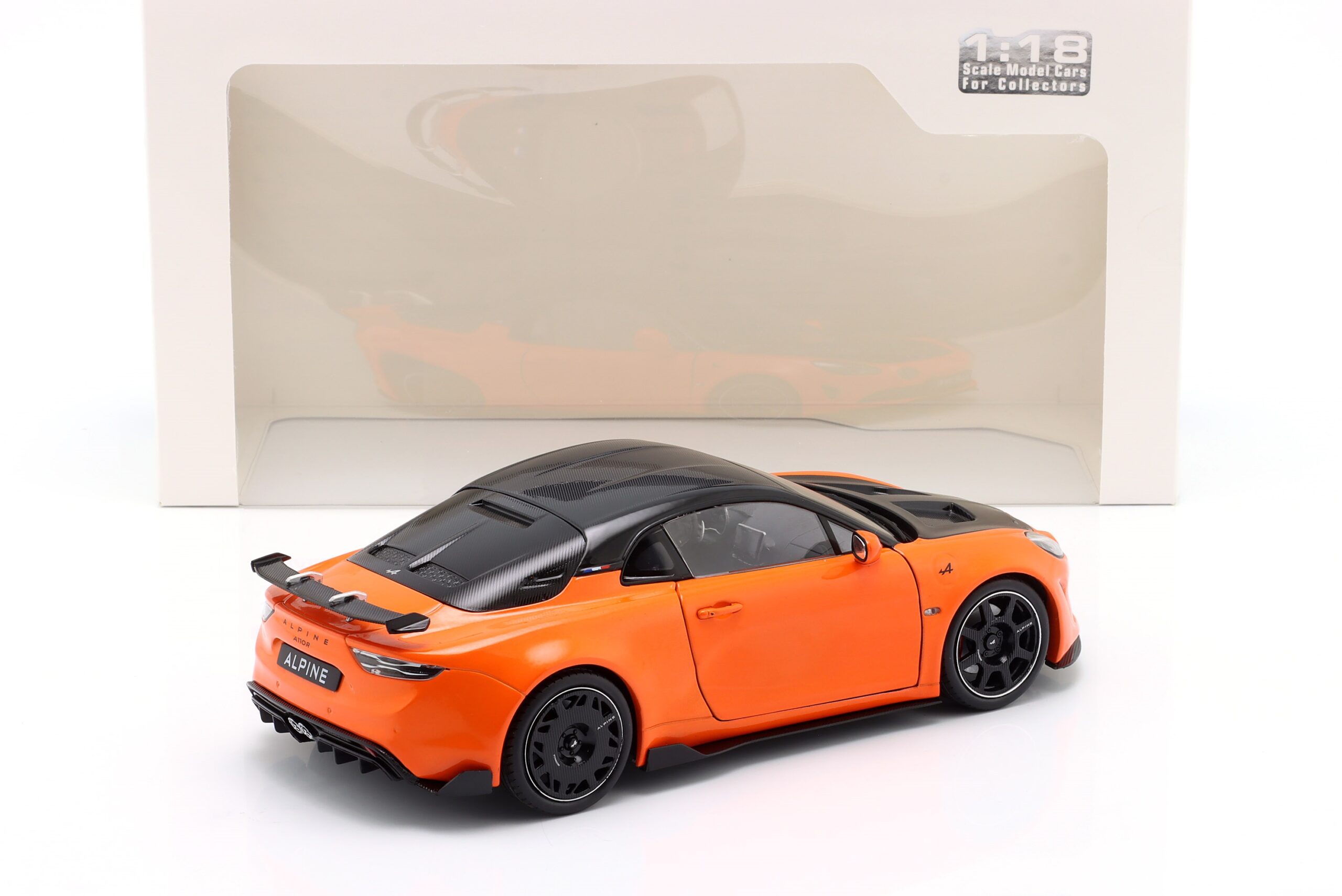 Kolekcjonerski model metalowy z elementami plastikowymi samochodu ALPINE A110 Radicale z roku 2024 w kolorze Pomarańczowy/kobaltowy.
