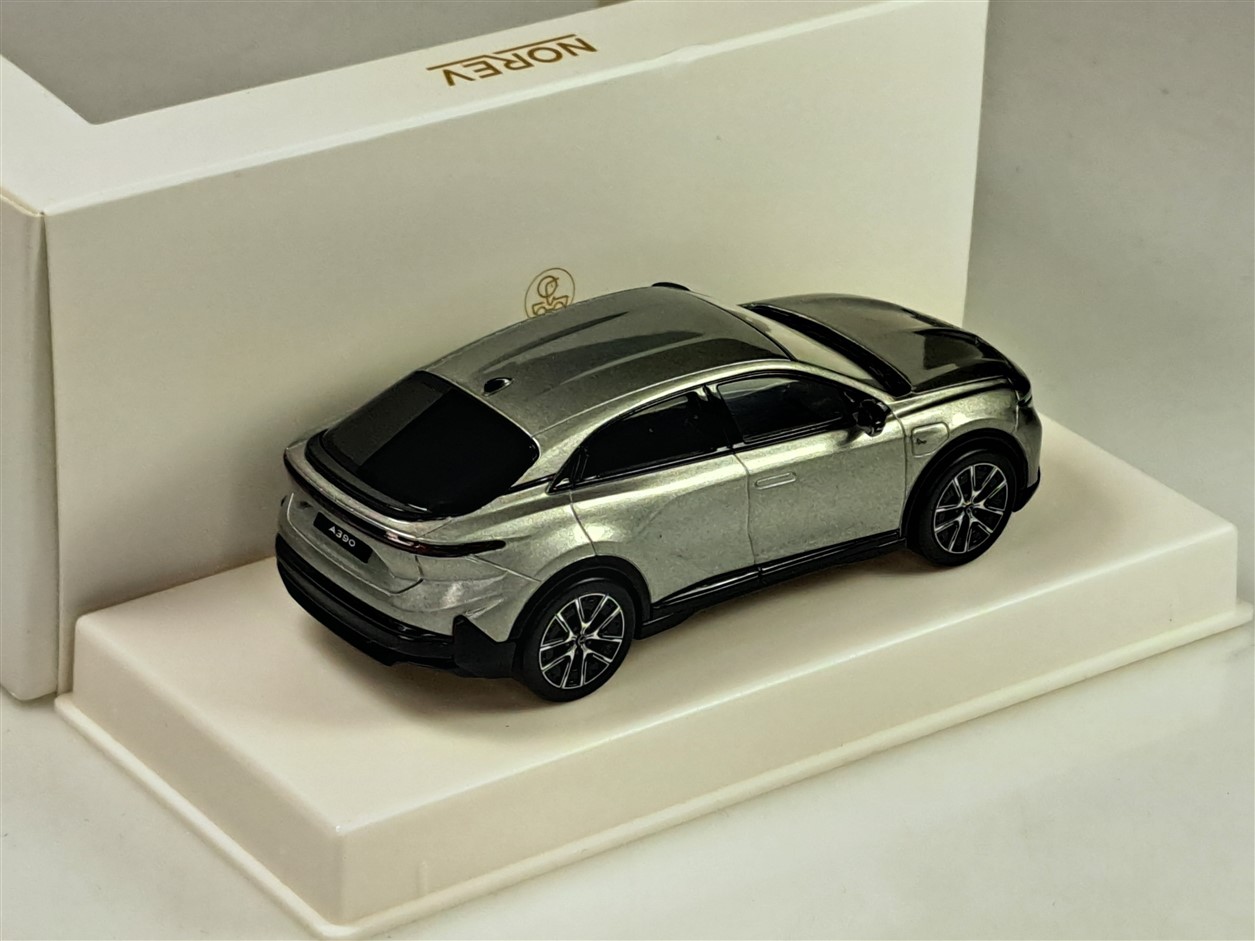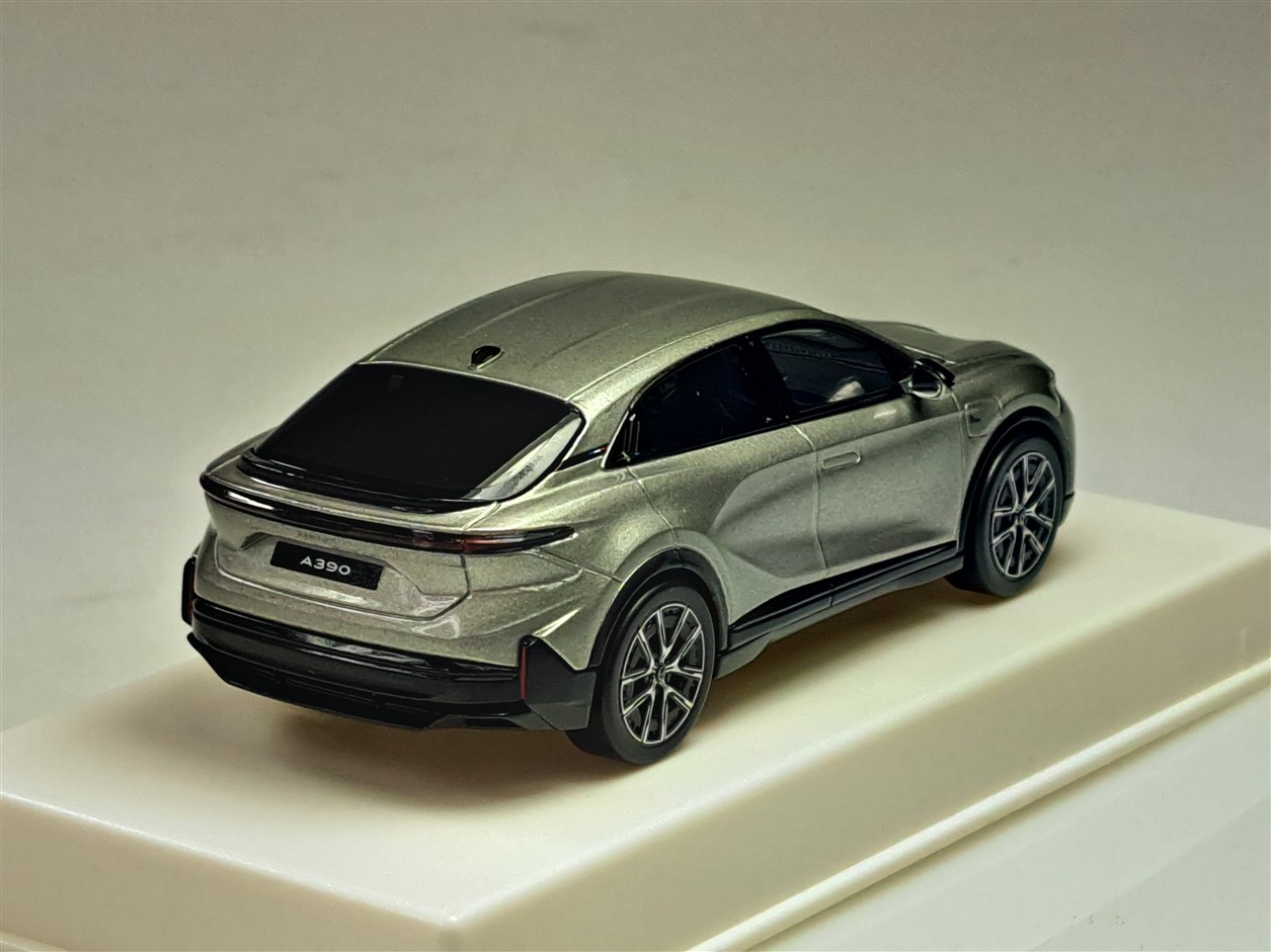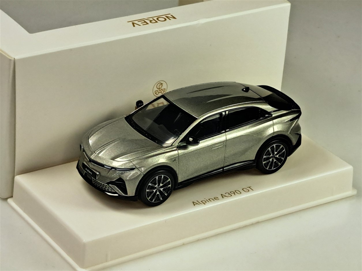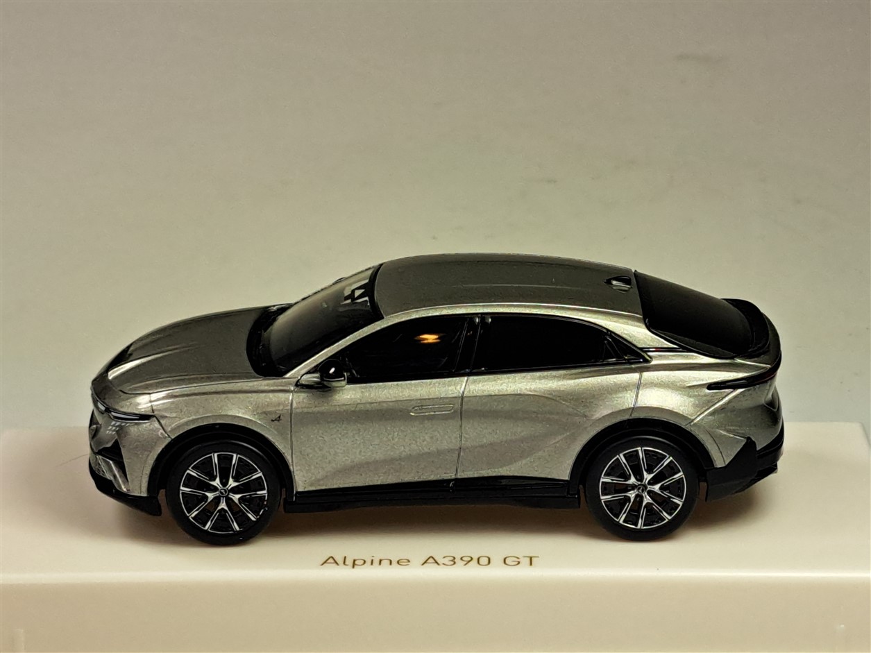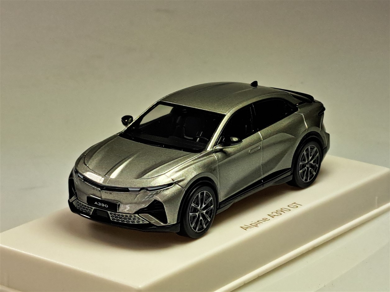 Kolekcjonerski model metalowy z elementami plastikowymi samochodu ALPINE A390 GT z roku 2026 w kolorze Mercury Silver.Model na podstawce,posiada akrylową gablotkę ekspozycyjną.