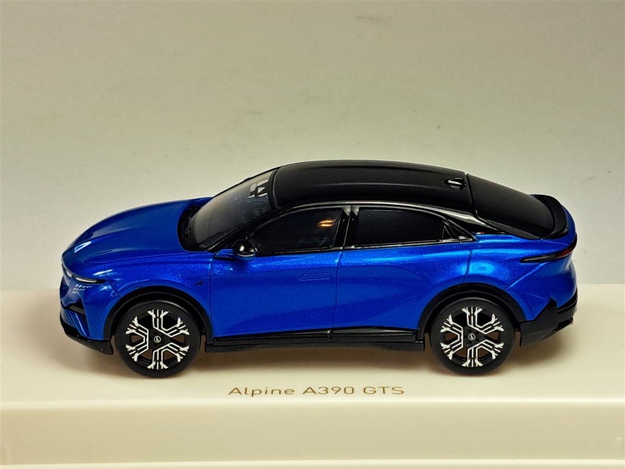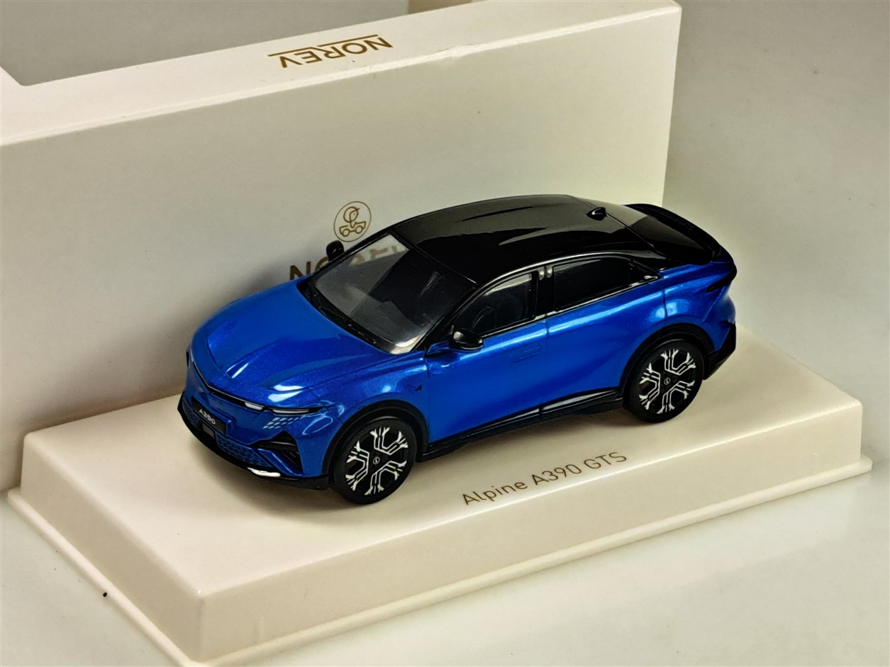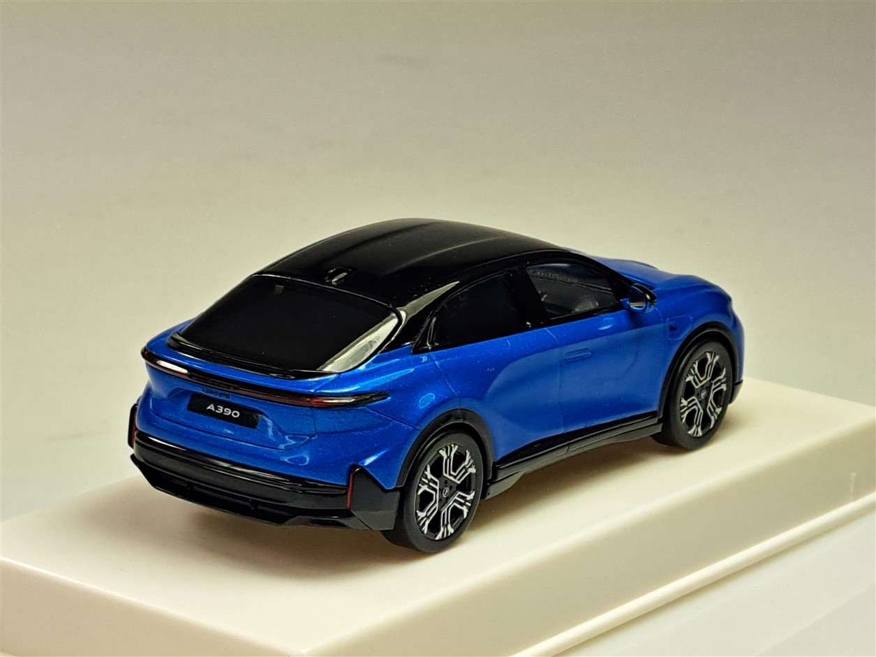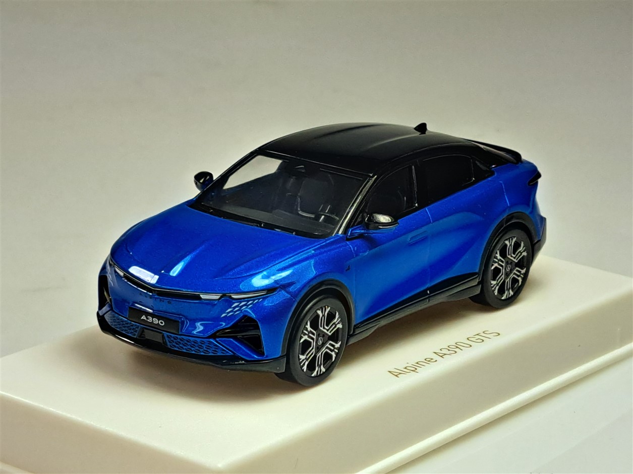 Kolekcjonerski model metalowy z elementami plastikowymi samochodu ALPINE A390 GTS z roku 2026 w kolorze Alpine Vision Blue/Black.Model na podstawce,posiada akrylową gablotkę ekspozycyjną.
