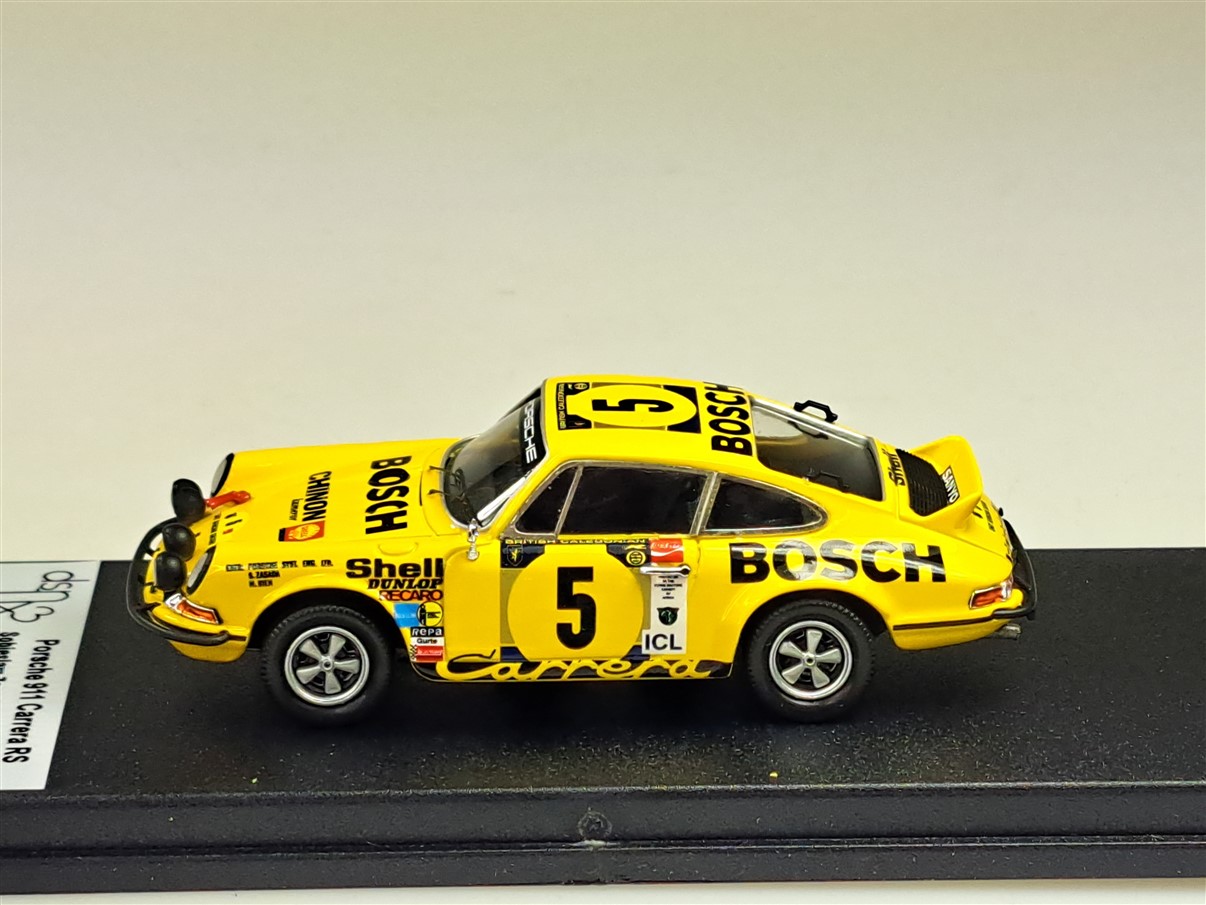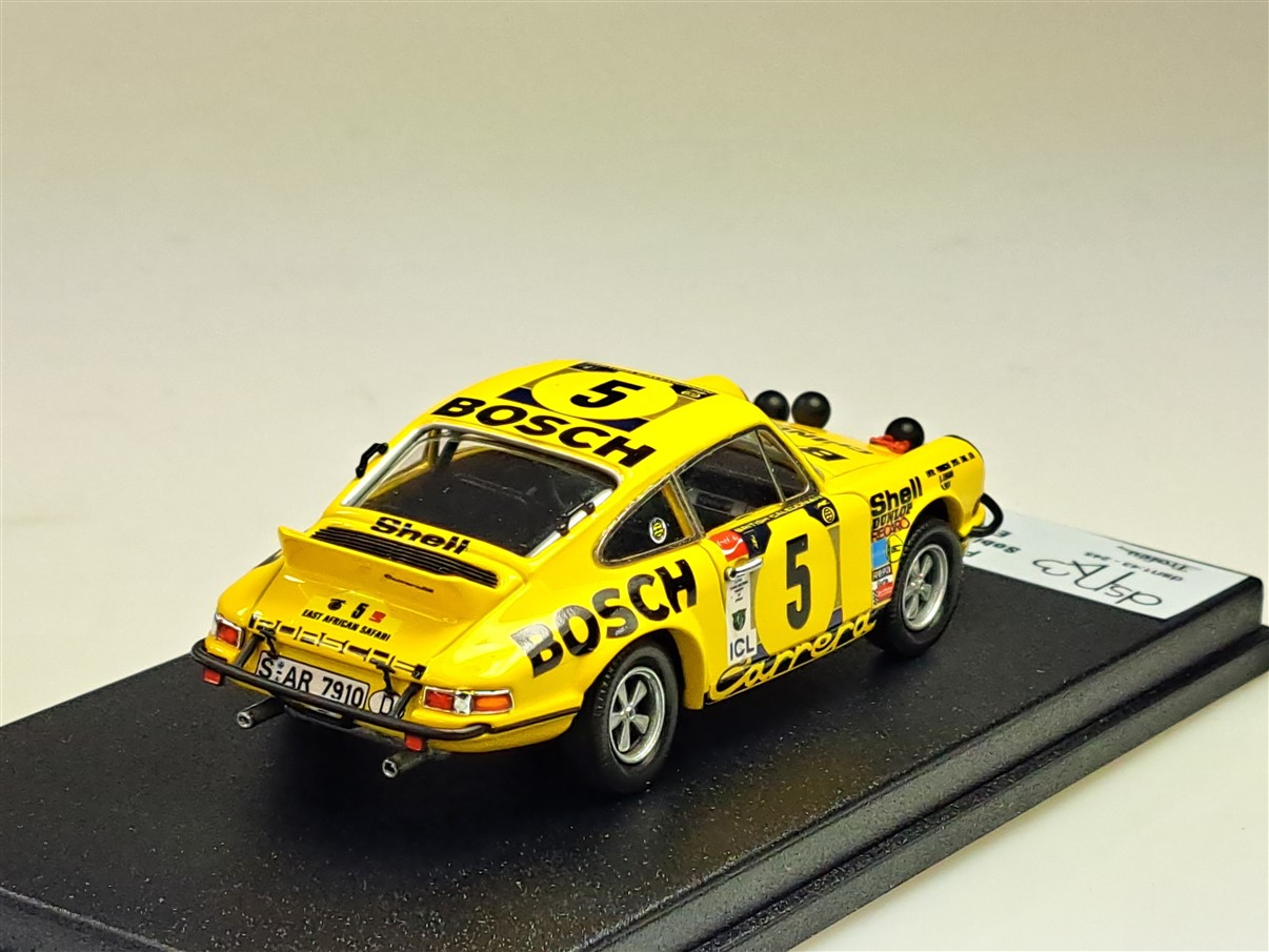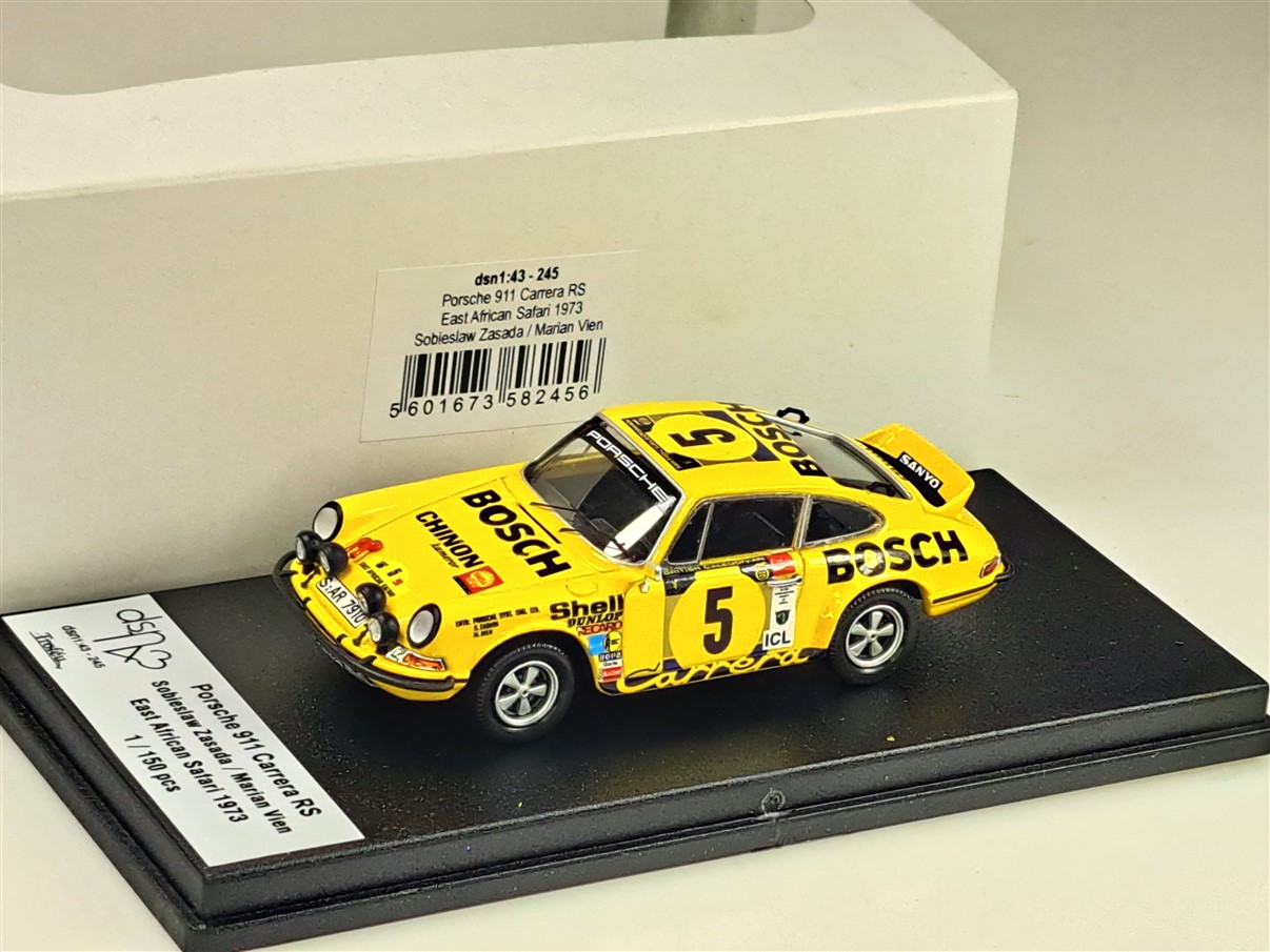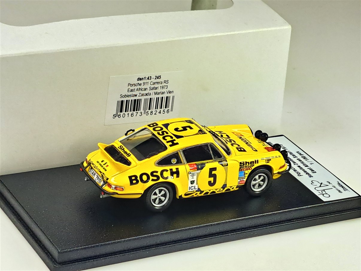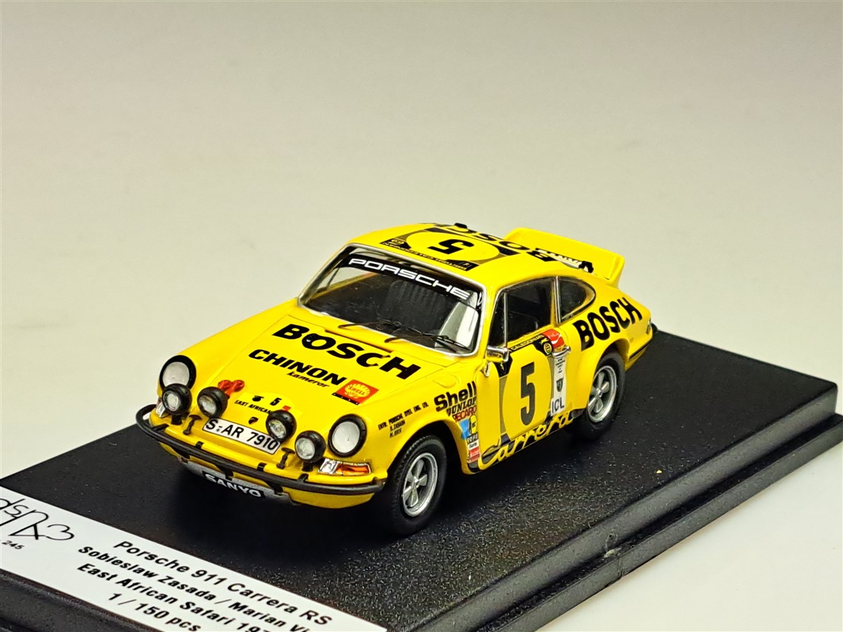 Kolekcjonerski model wykonany z żywicy samochodu rajdowego PORSCHE 911CARRERA RS #5 załogi S.Zasada/M.Vien z Rajdu East African Safari z roku 1973. Edycja limitowana tylko 150 sztuk.