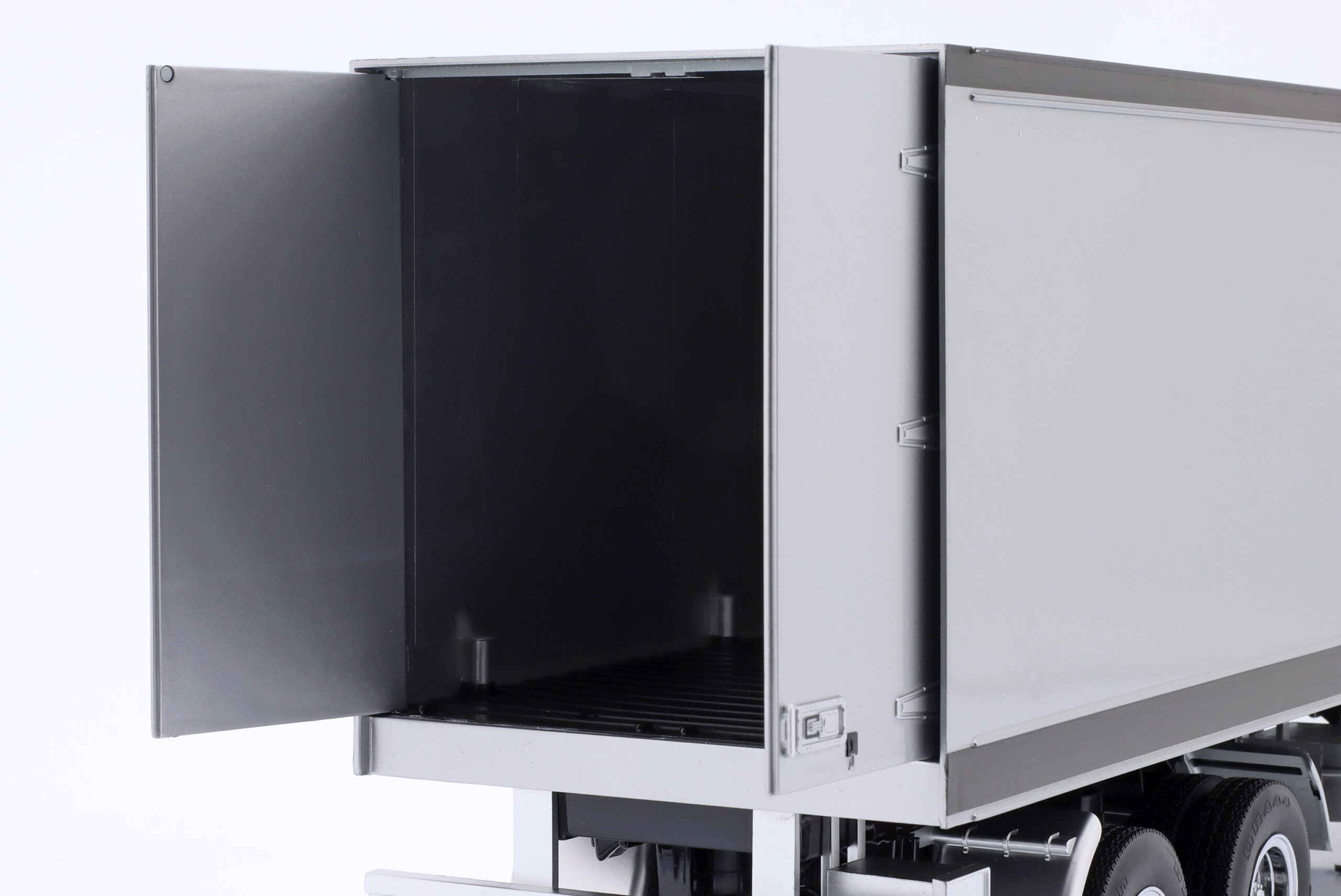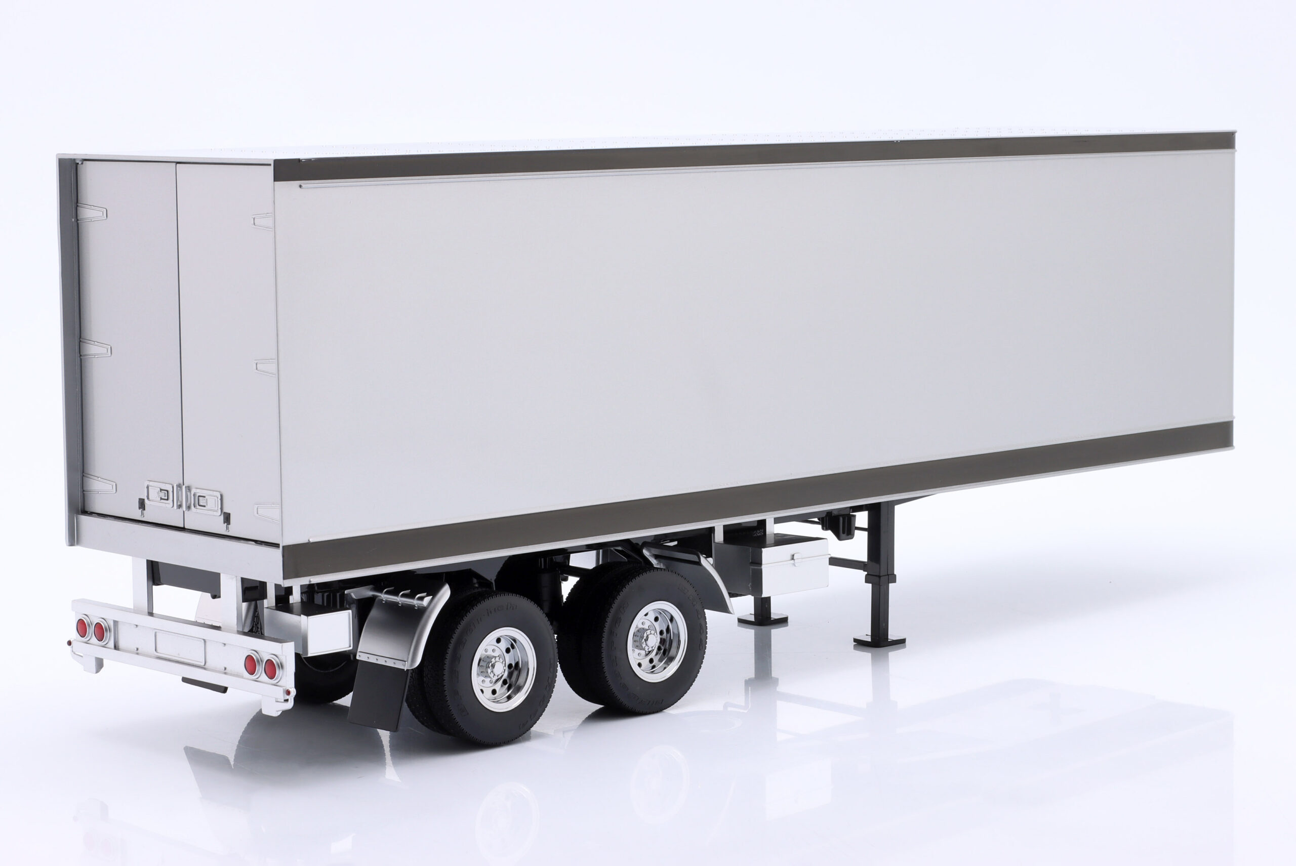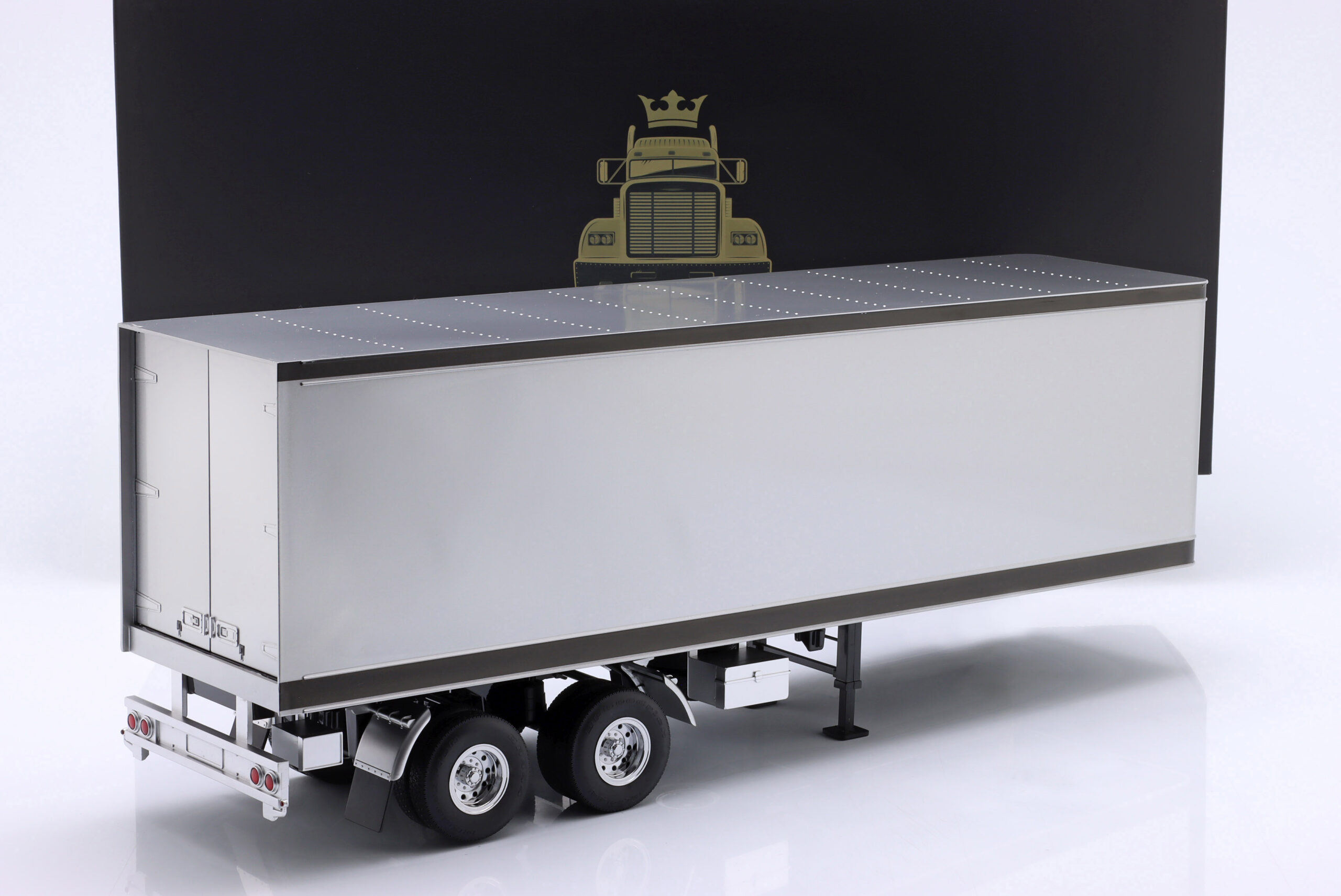 Kolekcjonerski model metalowy z elementami plastikowymi amerykańskiej naczepy ciągnika siodłowego w kolorze Srebrny/Czarny.Model ma otwierane tylne drzwi.
