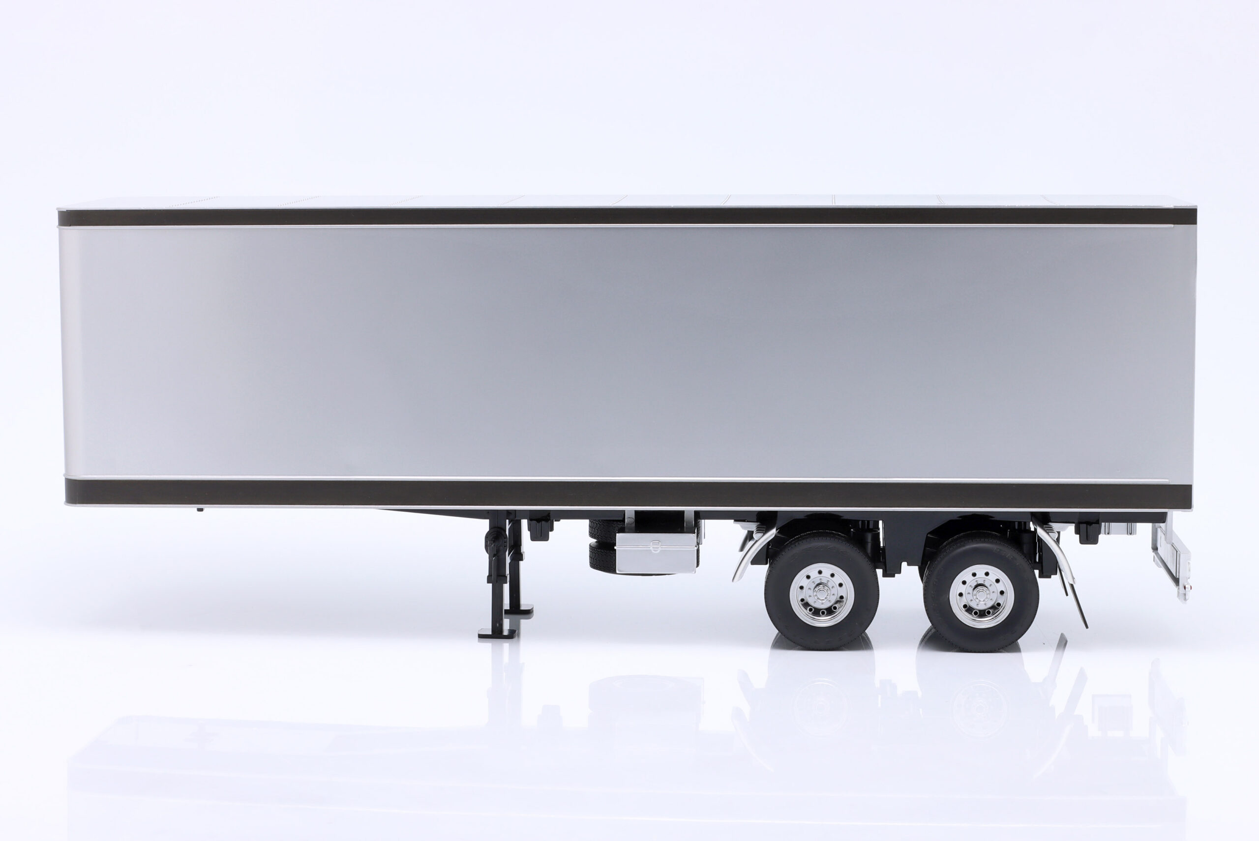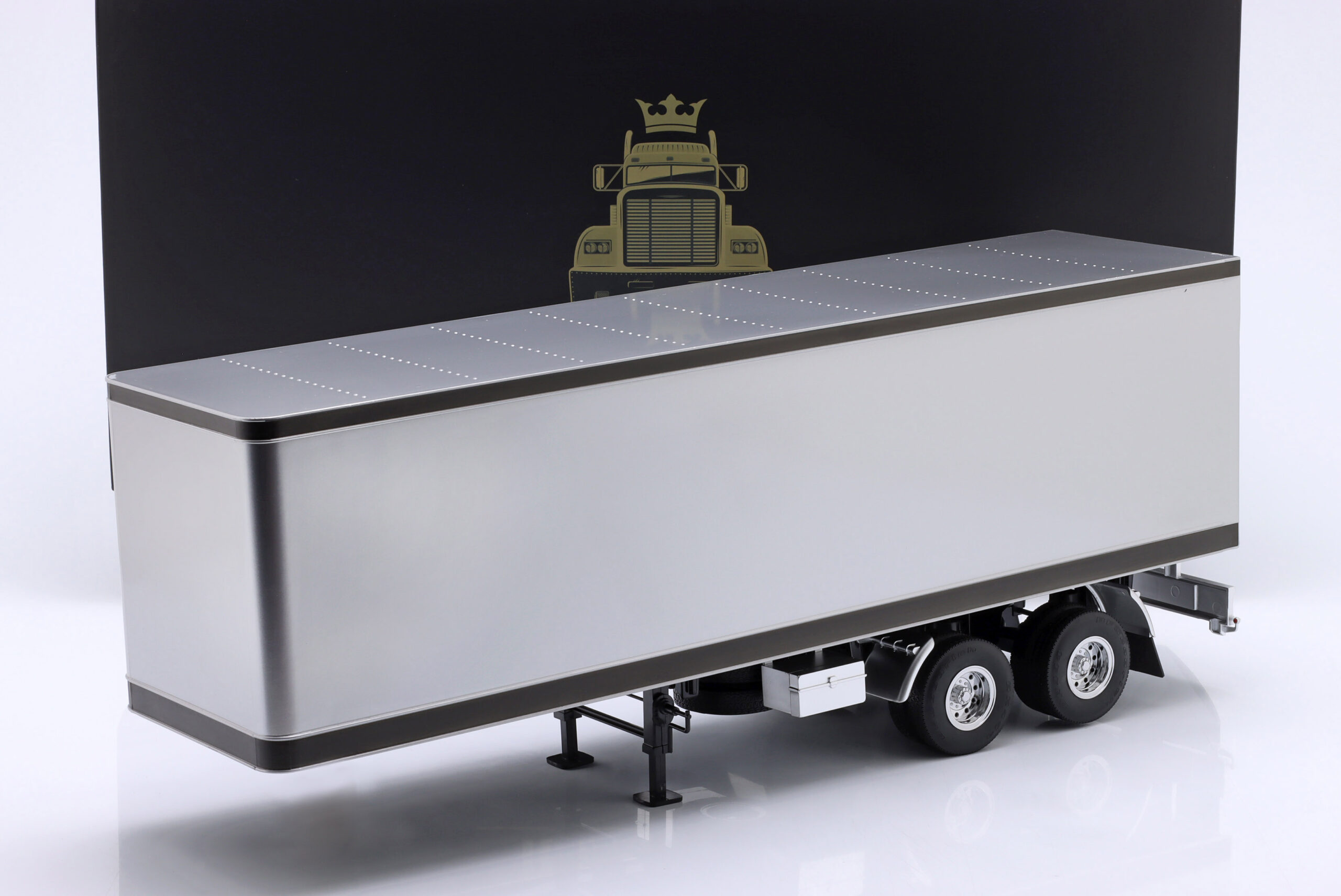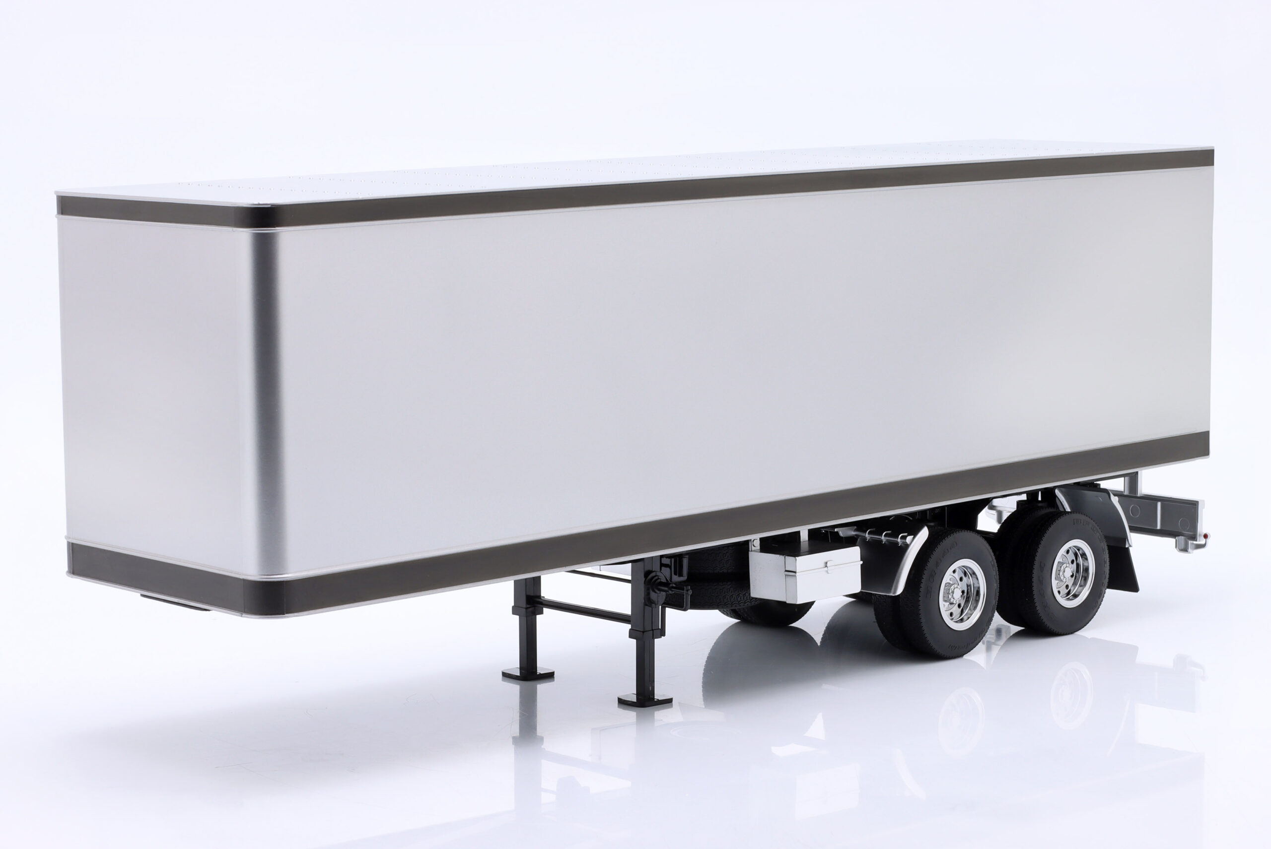 Kolekcjonerski model metalowy z elementami plastikowymi amerykańskiej naczepy ciągnika siodłowego w kolorze Srebrny/Czarny.Model ma otwierane tylne drzwi.