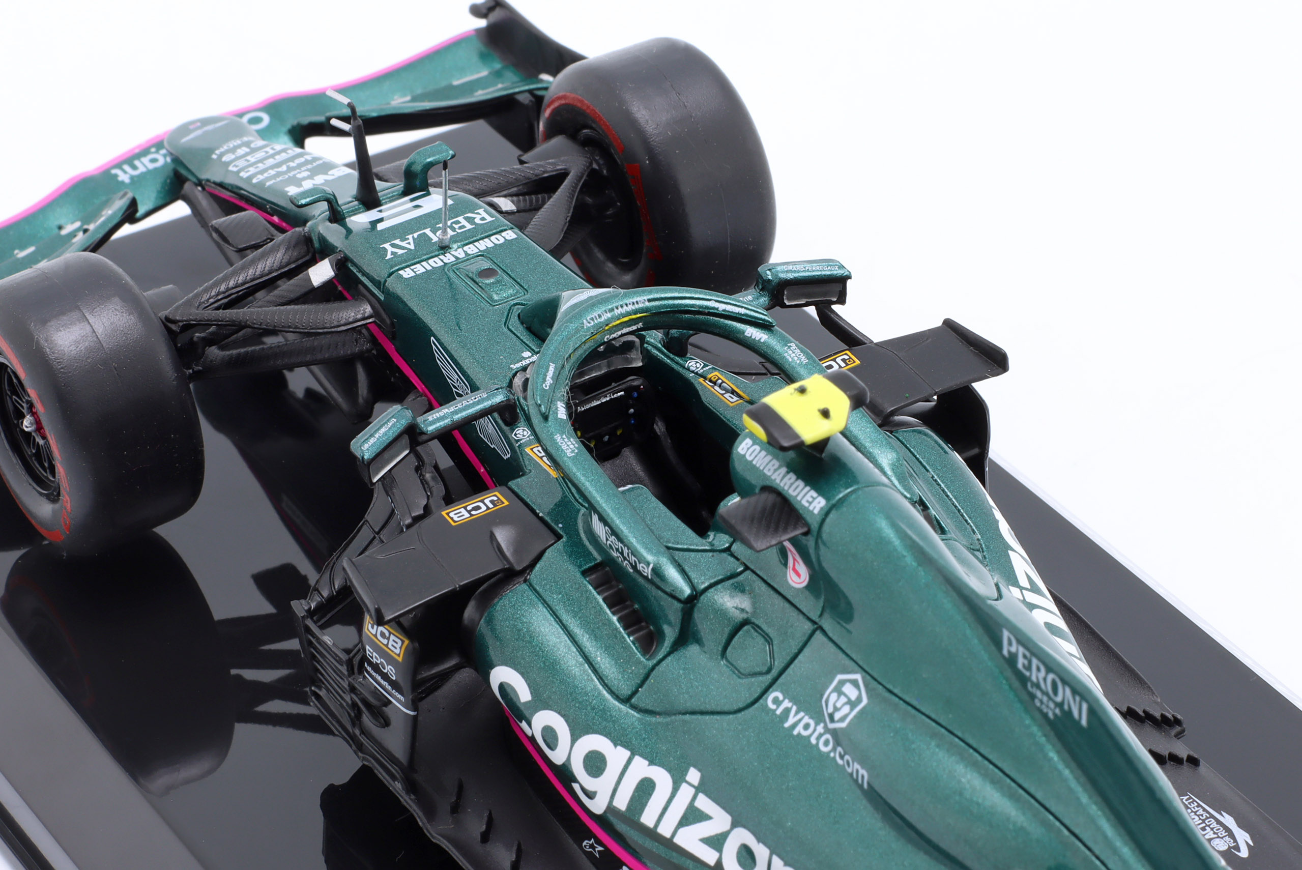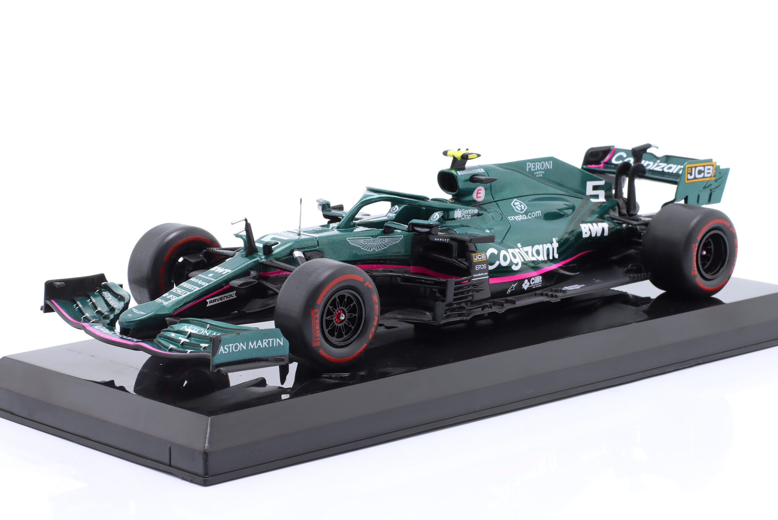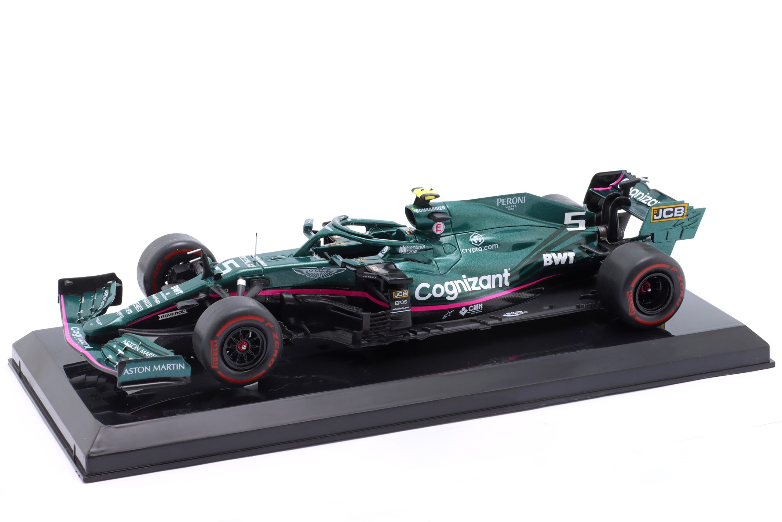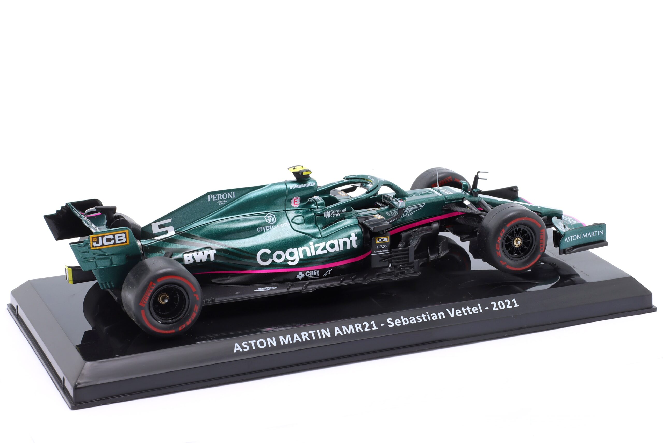 Kolekcjonerski model metalowy z elementami plastikowymi bolidu Formuły 1 ASTON MARTIN AMR21 #5,w którym S.Vettel zajął 2-gie miejsce w GP F1 Azerbejdżanu w sezonie 2021.Model na podstawce,zapakowany w blister.