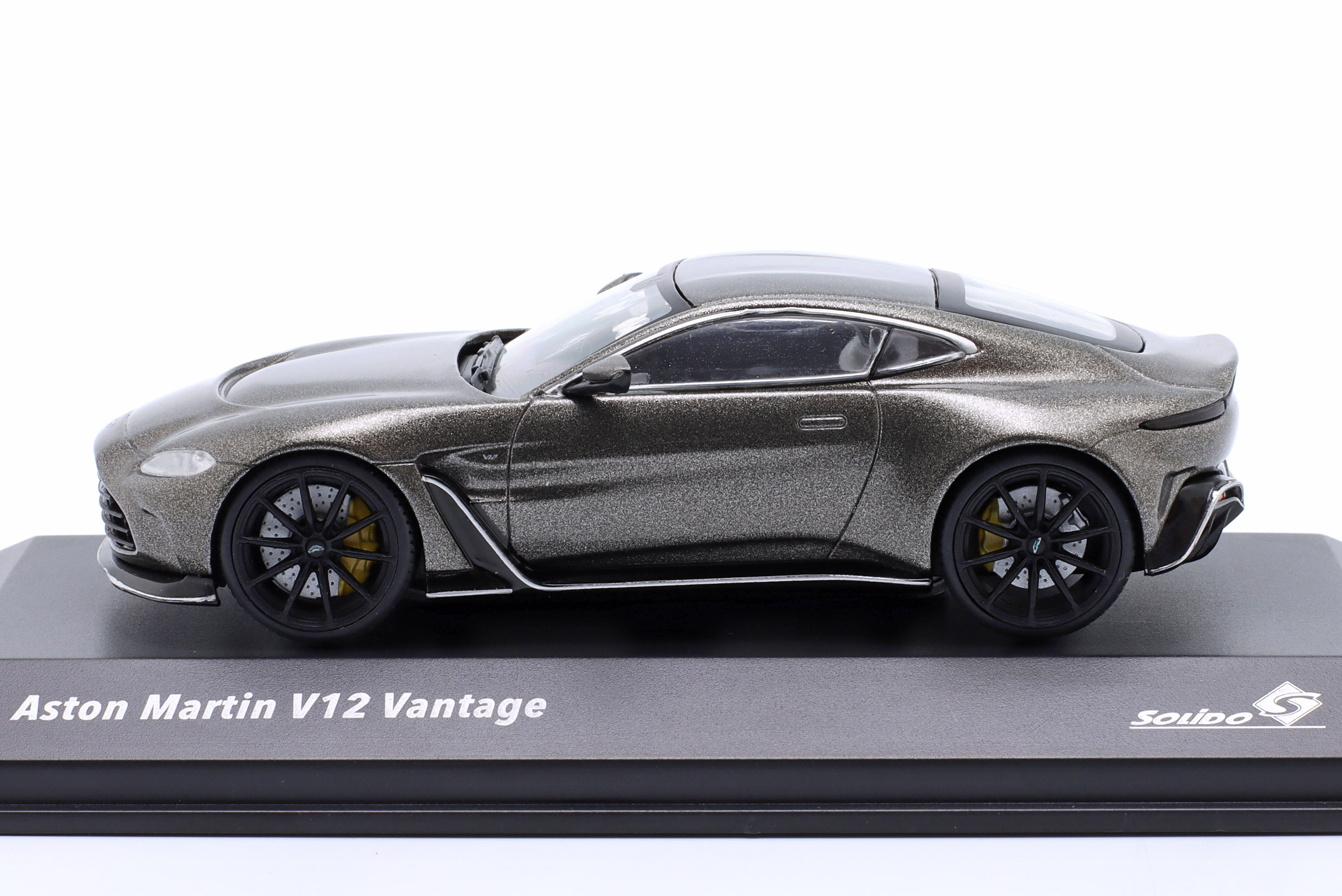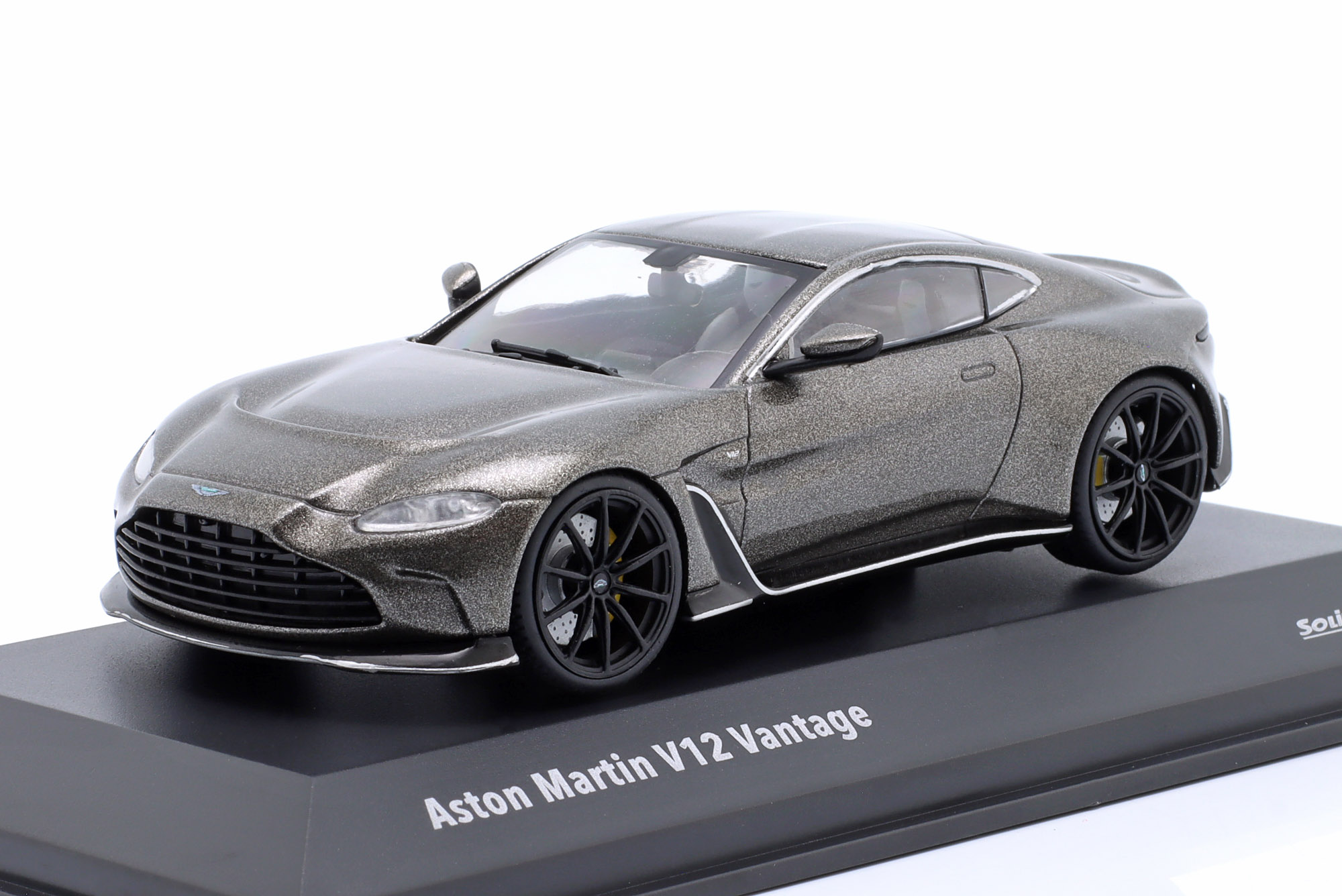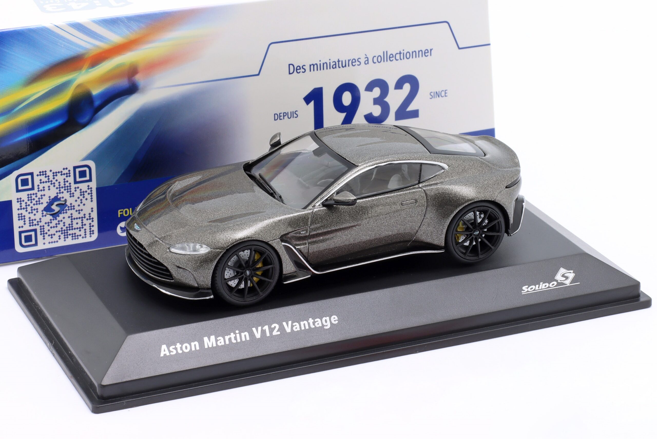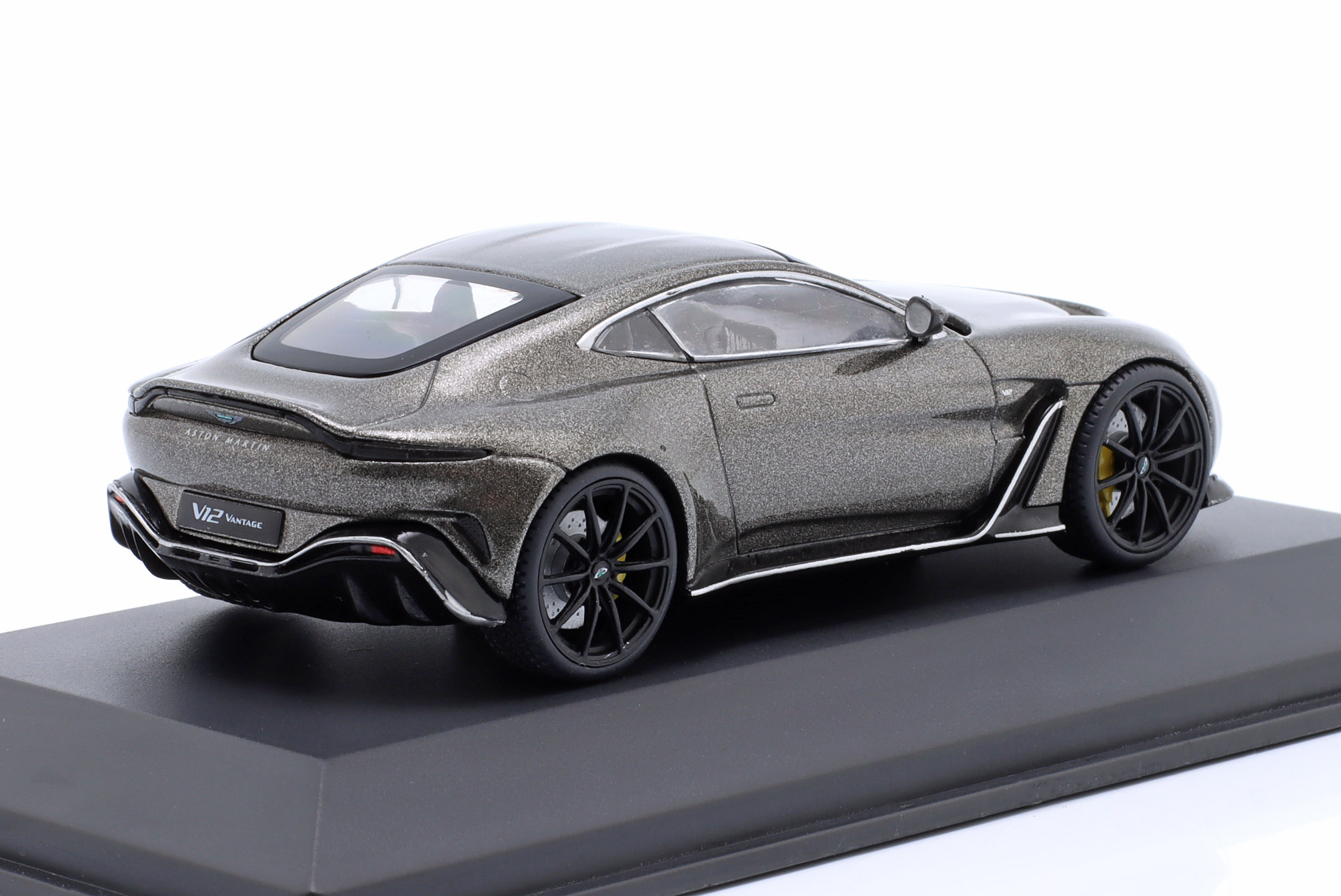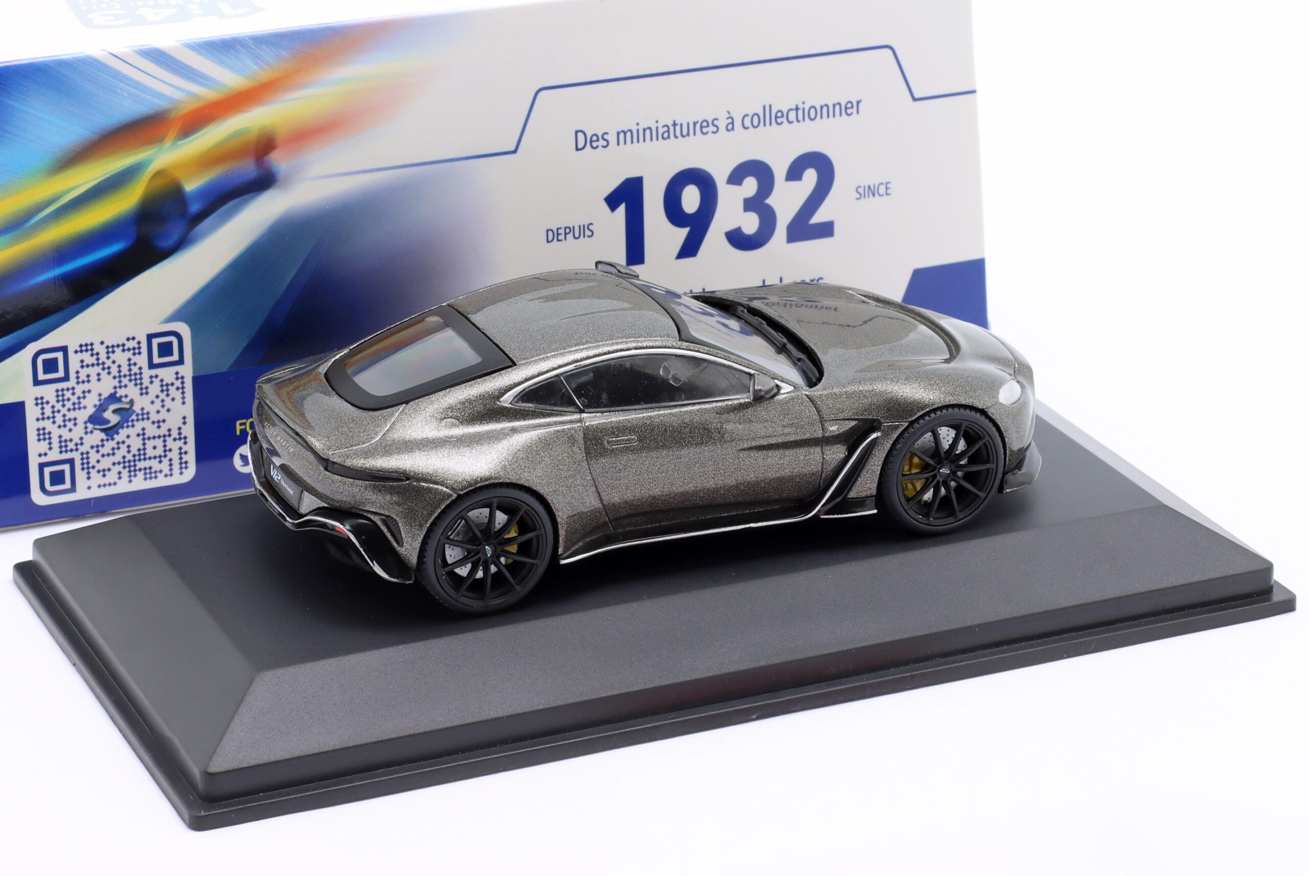 Kolekcjonerski model metalowy z elementami plastikowymi samochodu ASTON MARTIN V12 VANTAGE z roku 2023 w kolorze Szary metallic.Model posiada podstawkę oraz gablotkę ekspozycyjną.