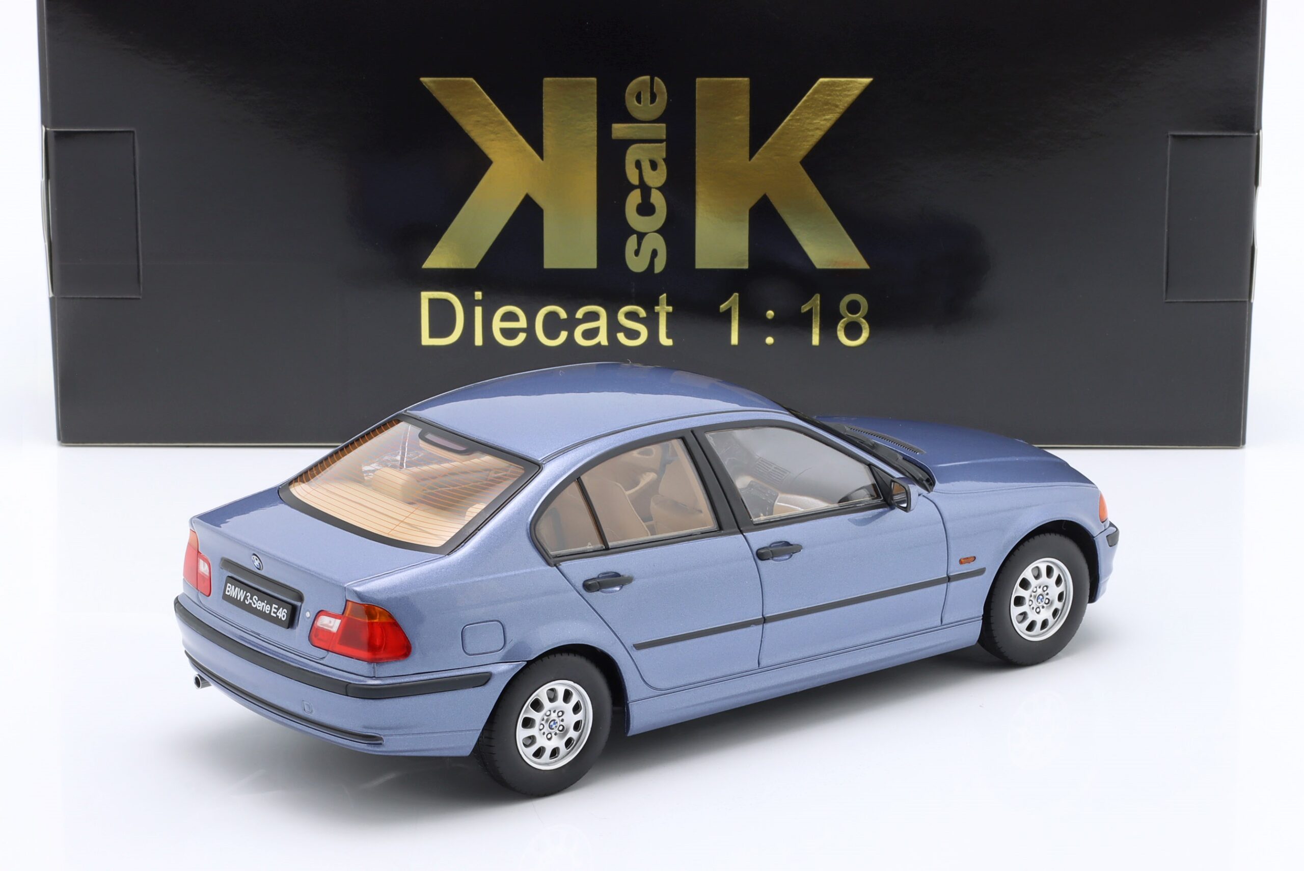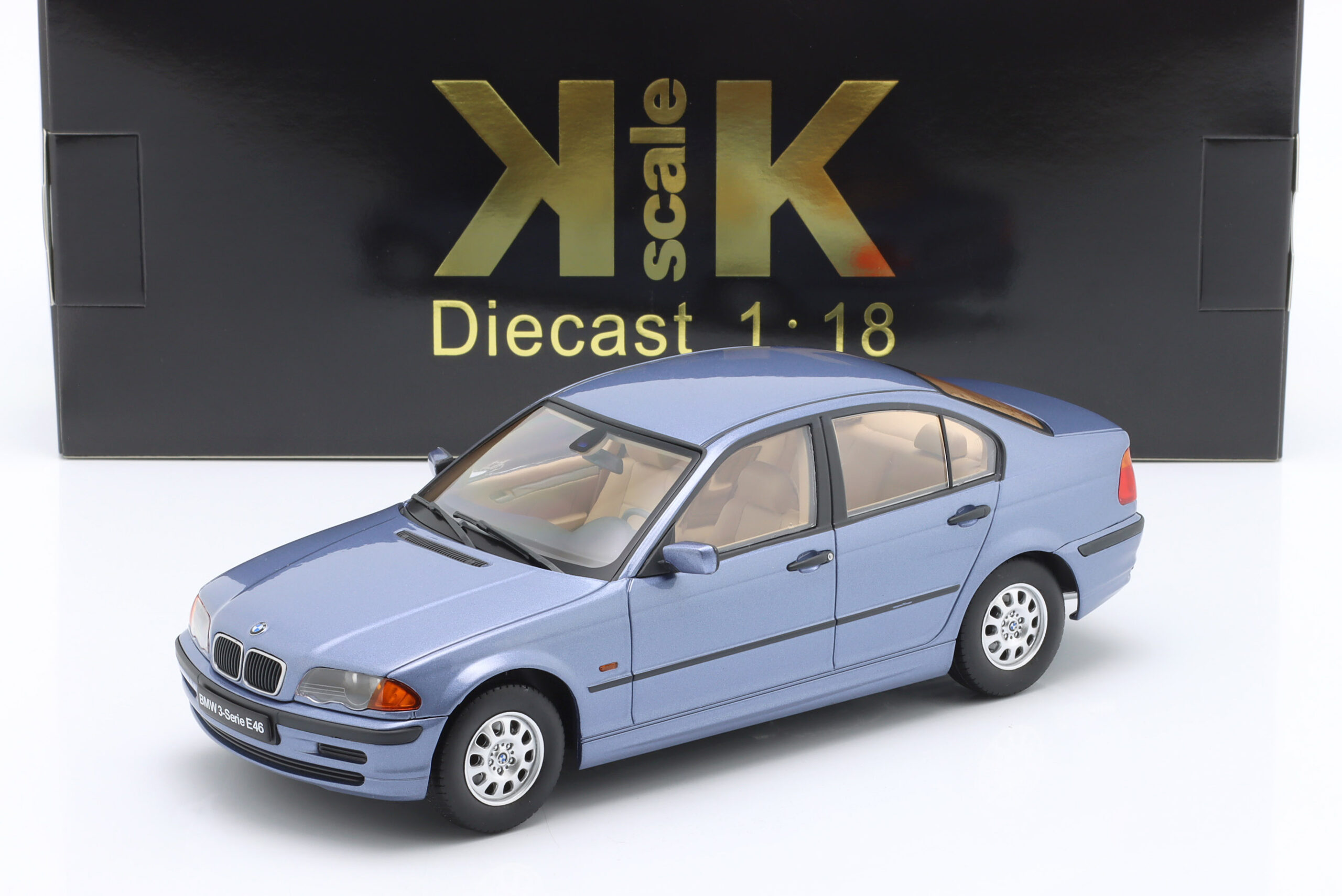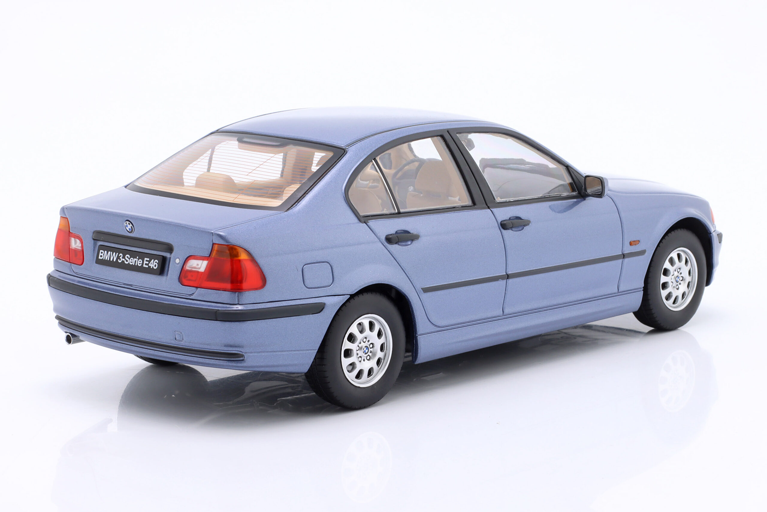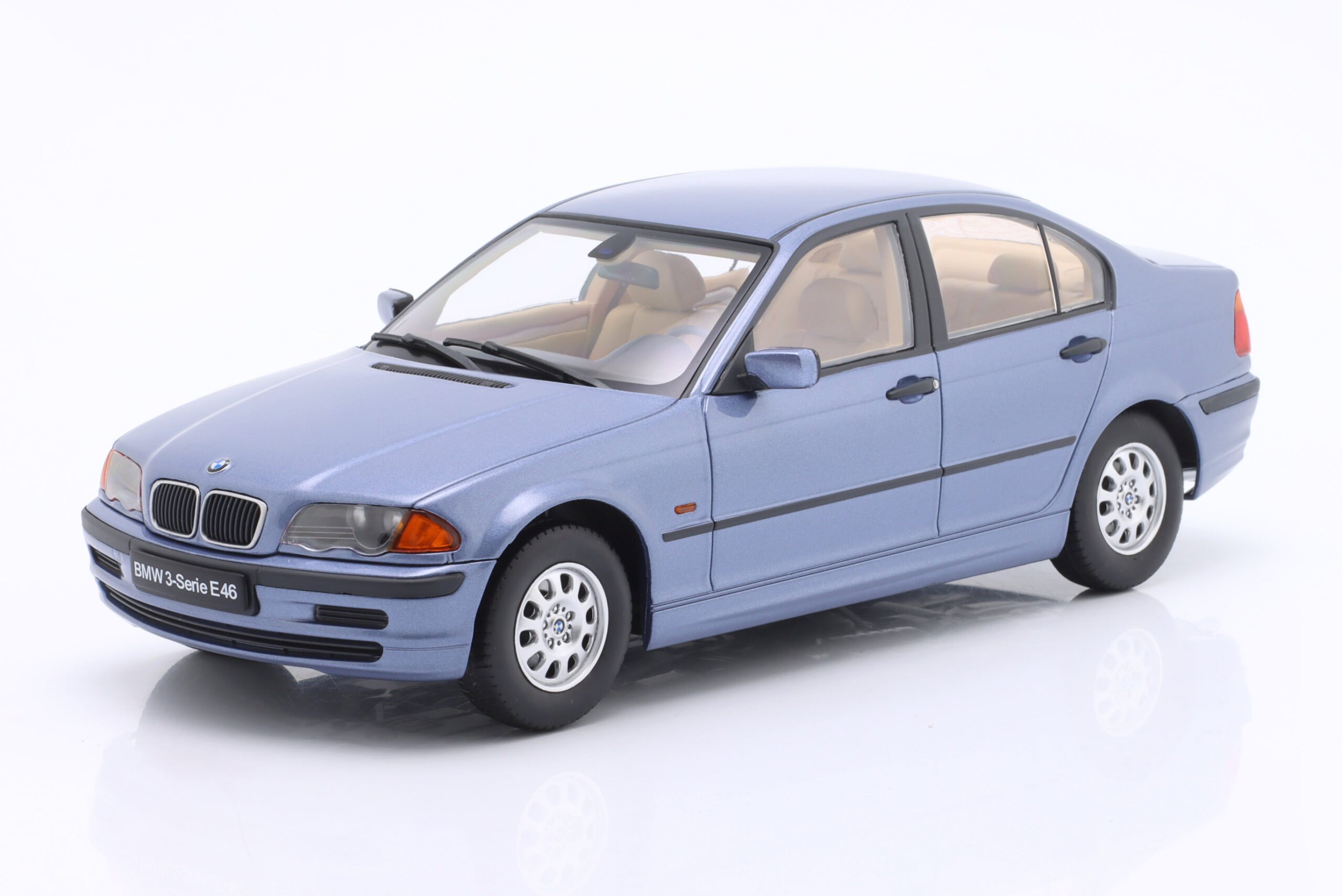 Kolekcjonerski model metalowy z elementami plastikowymi samochodu BMW 3-Series (E46) z roku 1999 w kolorze Jasnoniebieski metallic.Model nie posiada otwieranych elementów.