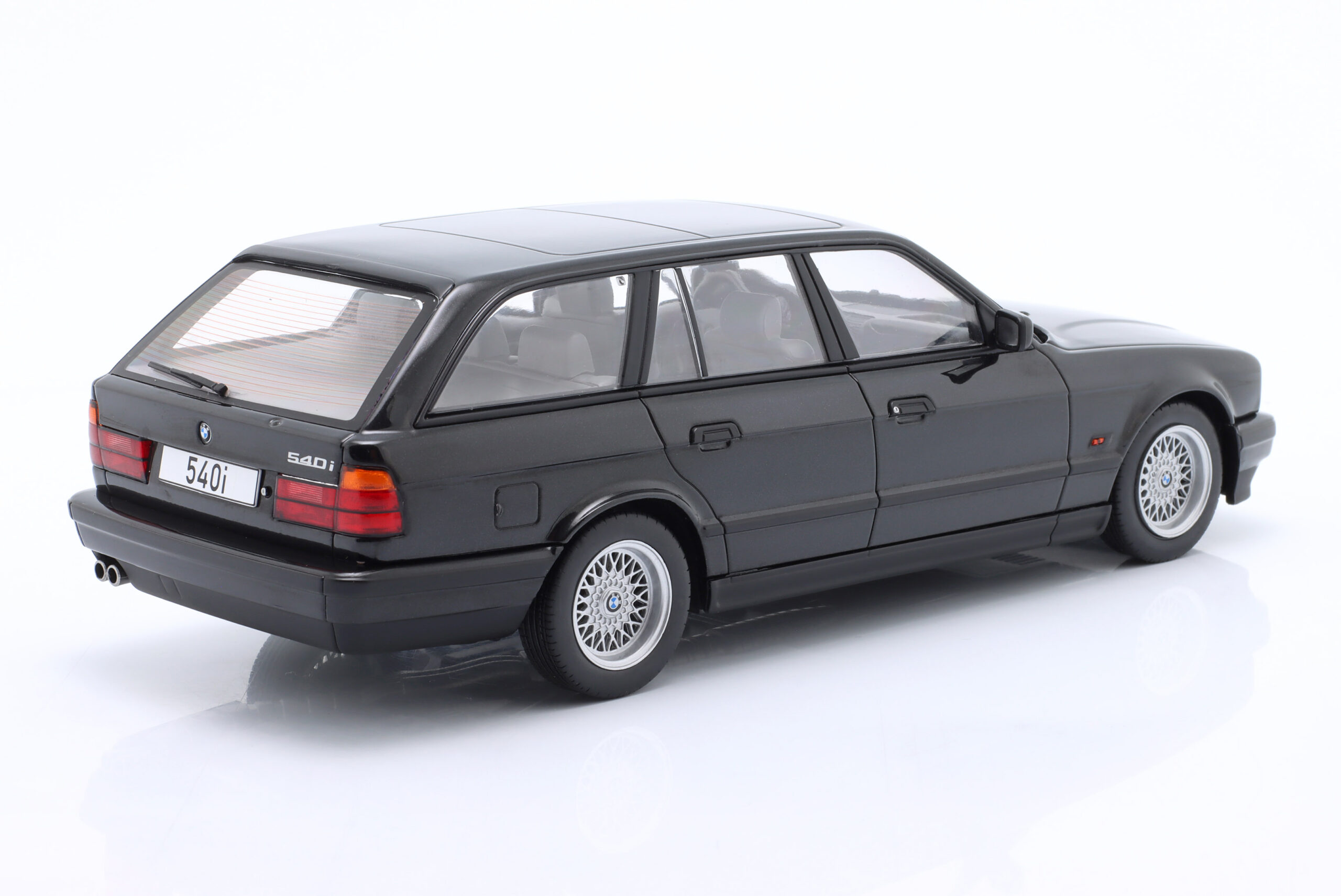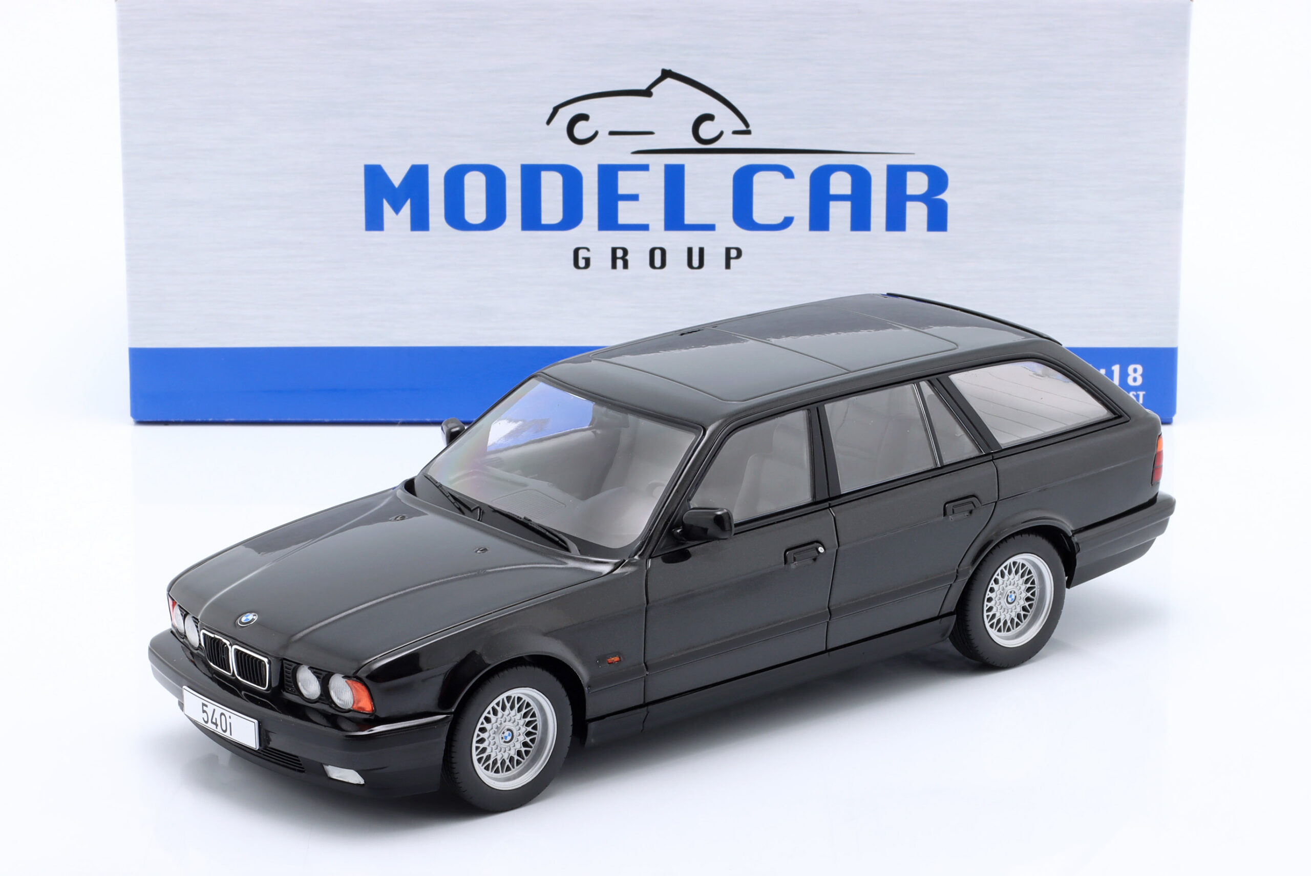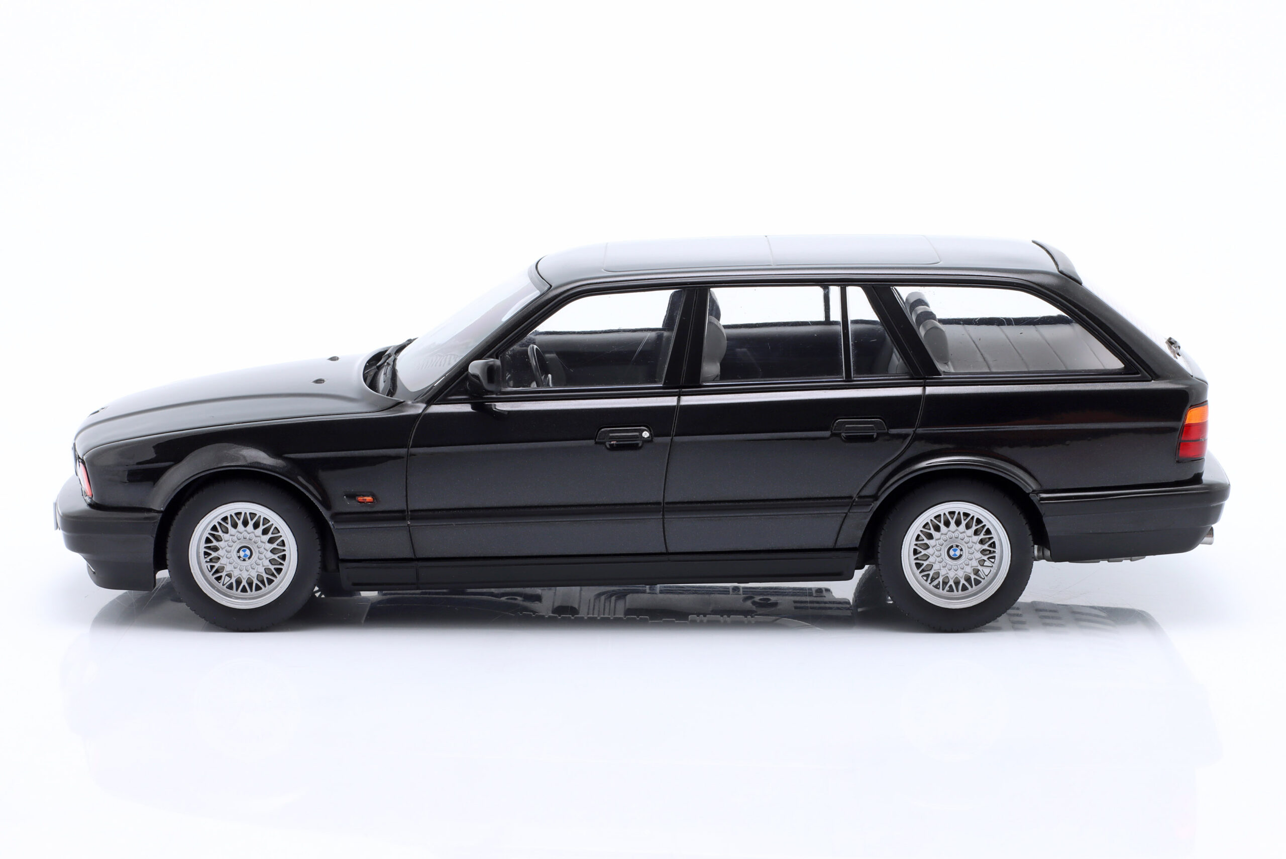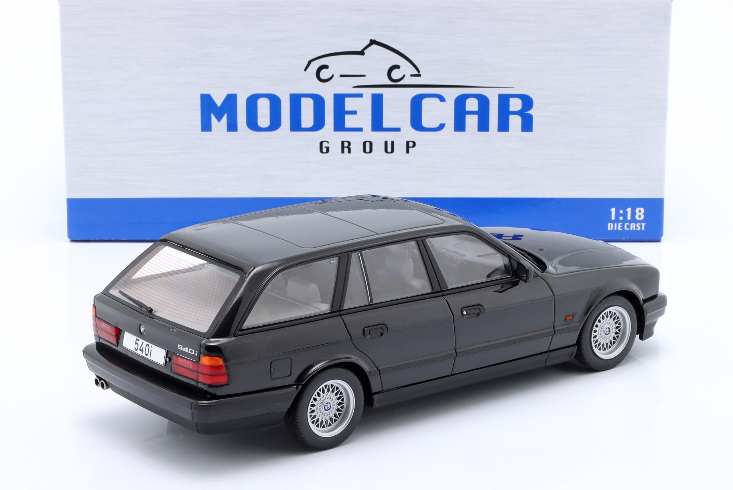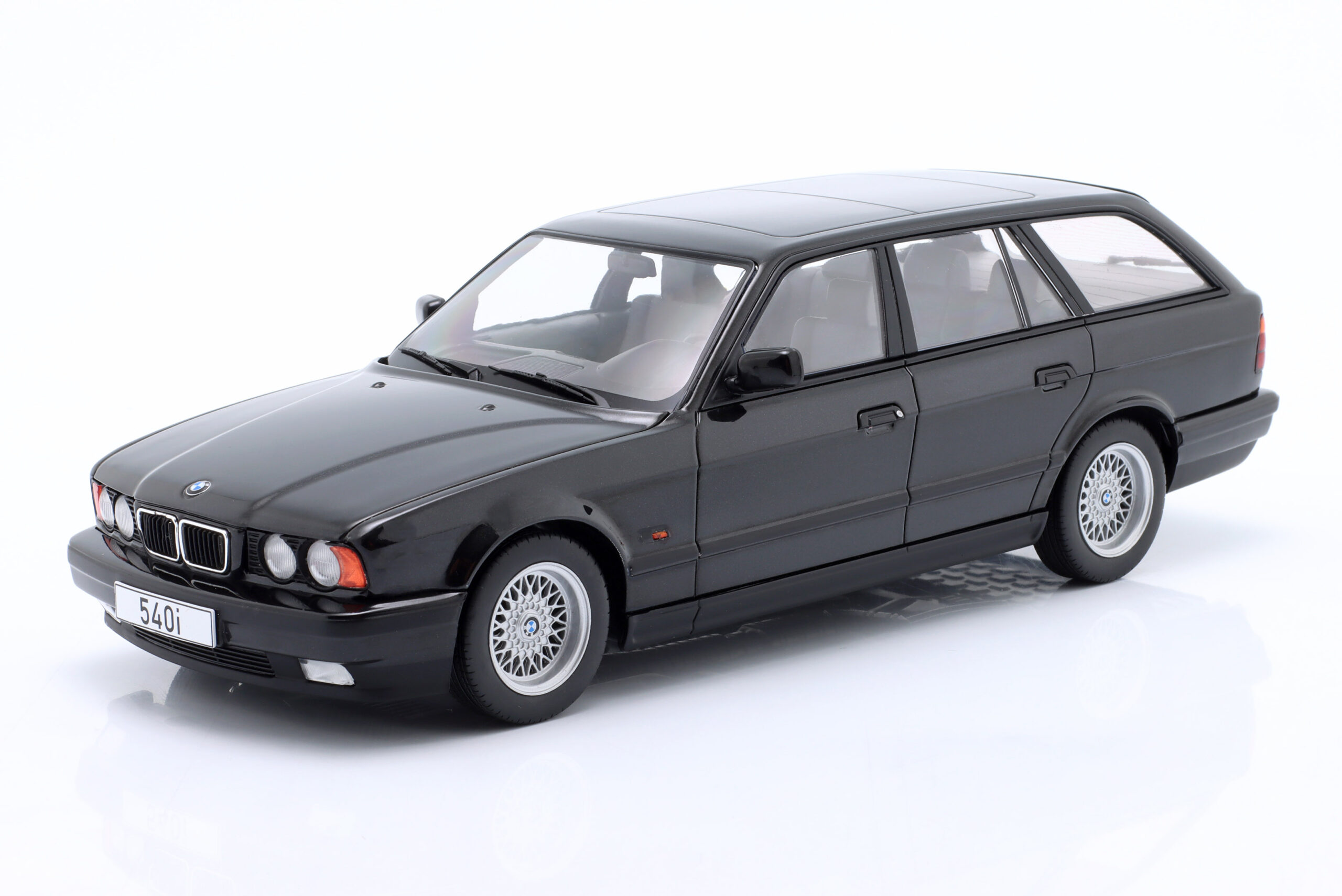 Kolekcjonerski model metalowy z elementami plastikowymi samochodu BMW 5-Series (E34) Touring z roku 2022 w kolorze Czarny metallic.Model nie posiada otwieranych elementów.