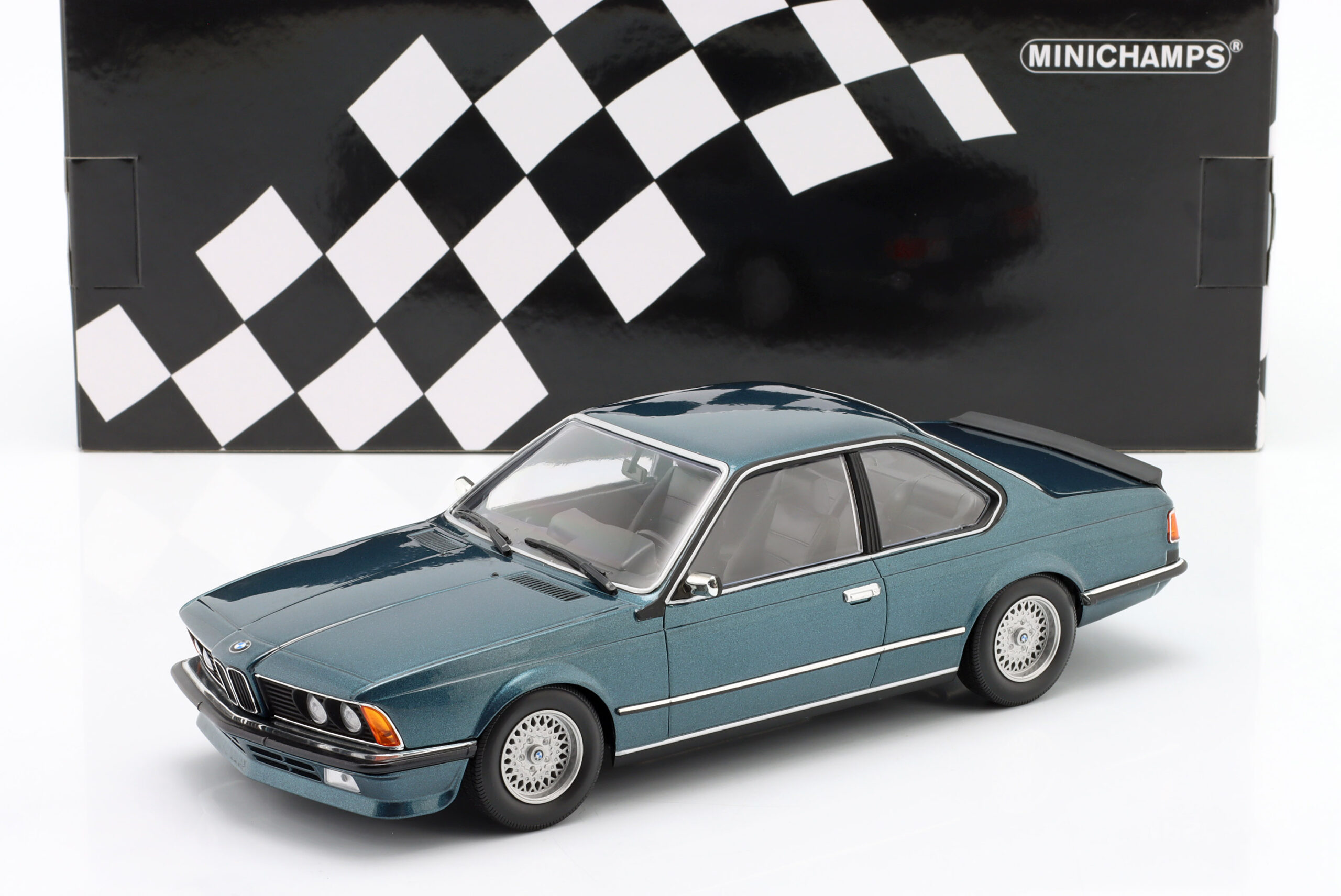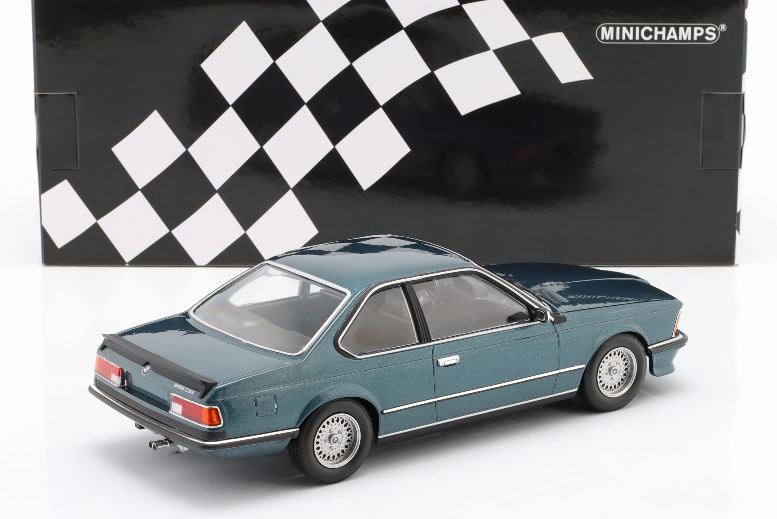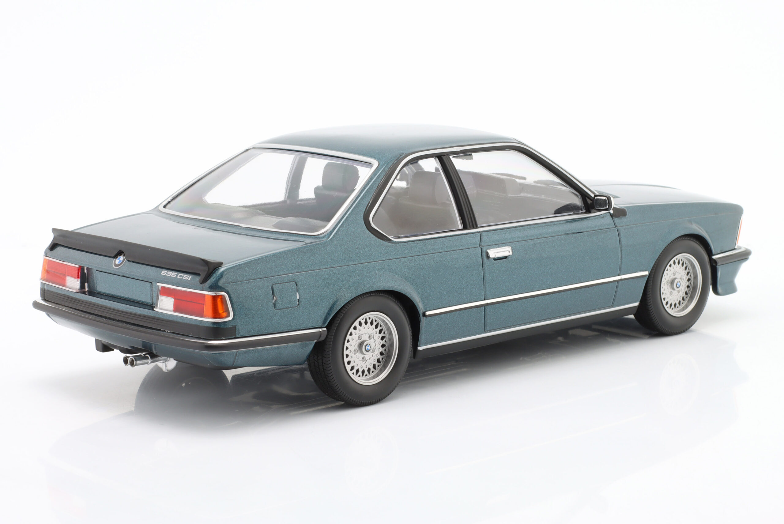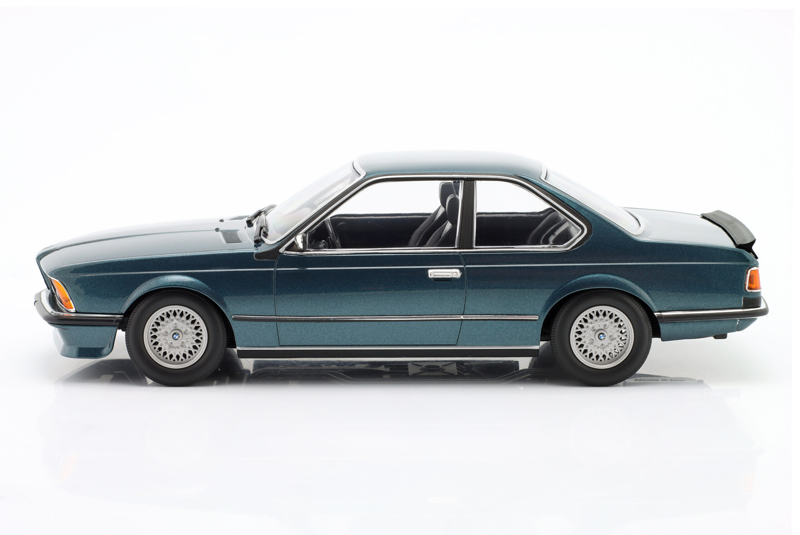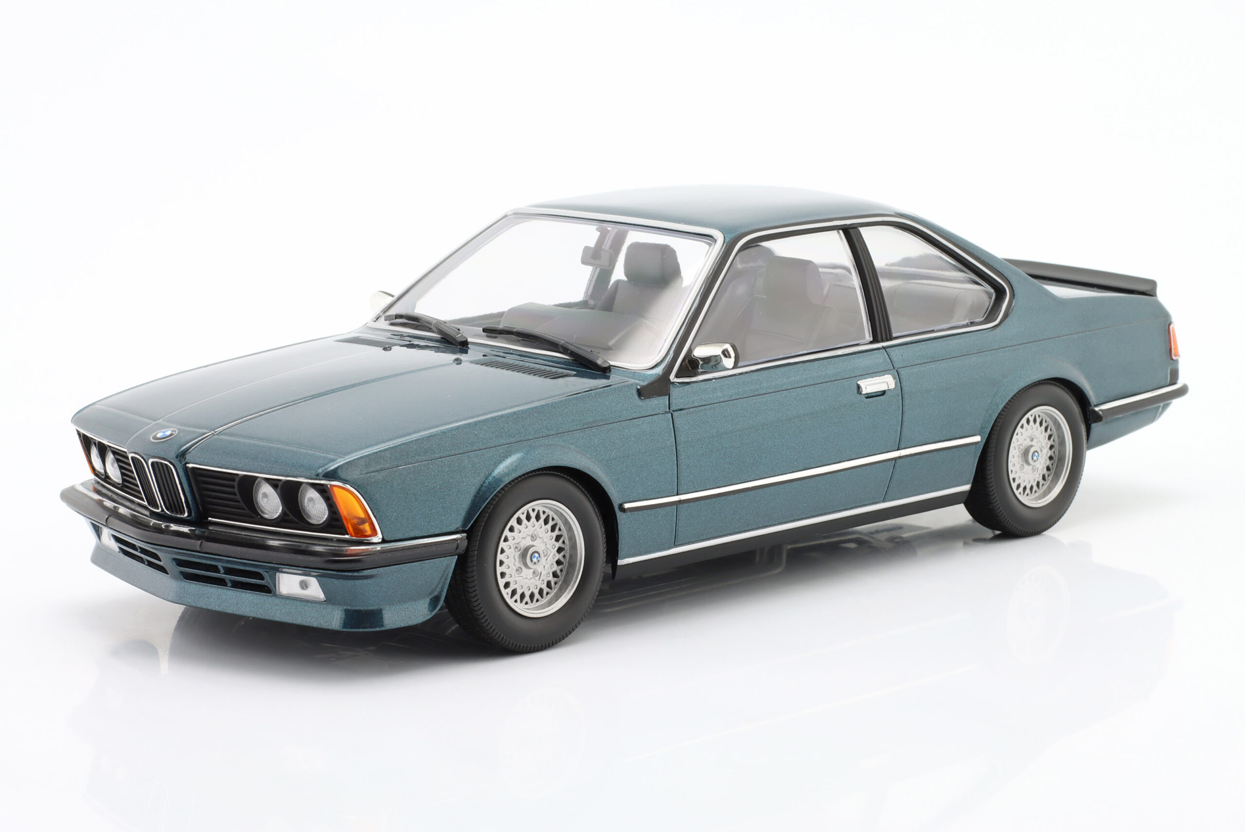 Kolekcjonerski model metalowy z elementami plastikowymi samochodu BMW 635 CSI (E24) z roku 1982 w kolorze Petrol blue metallic.Model nie posiada otwieranych elementów.